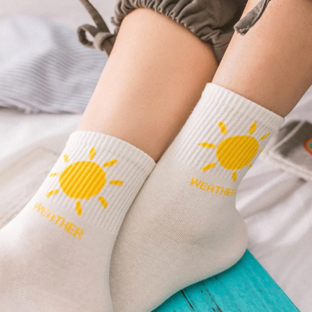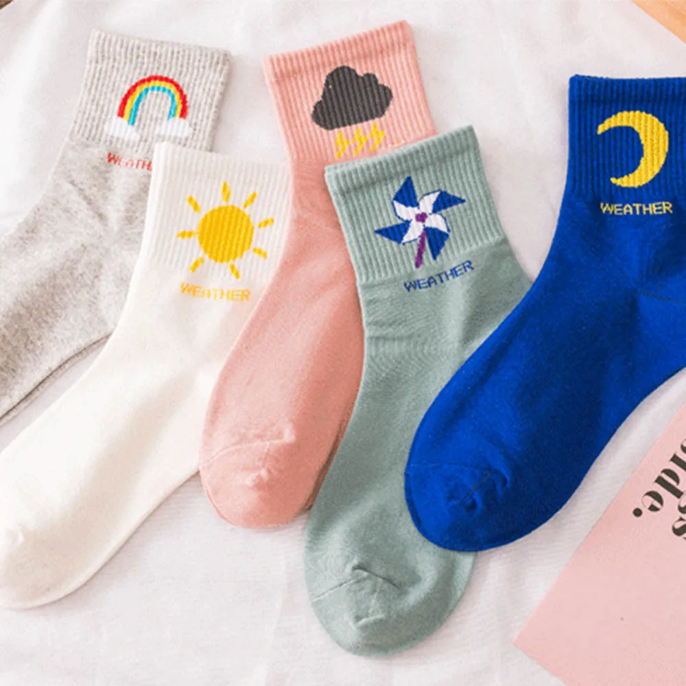 Тип изделия: Носок Тип носка: Повседневный Материал: хлопок Тип узора: погода Пол: Женщины Размер: один размер Длина: 23-27 см комплектация: 1 пара носков Примечание: допускается погрешность в 1-3 см.