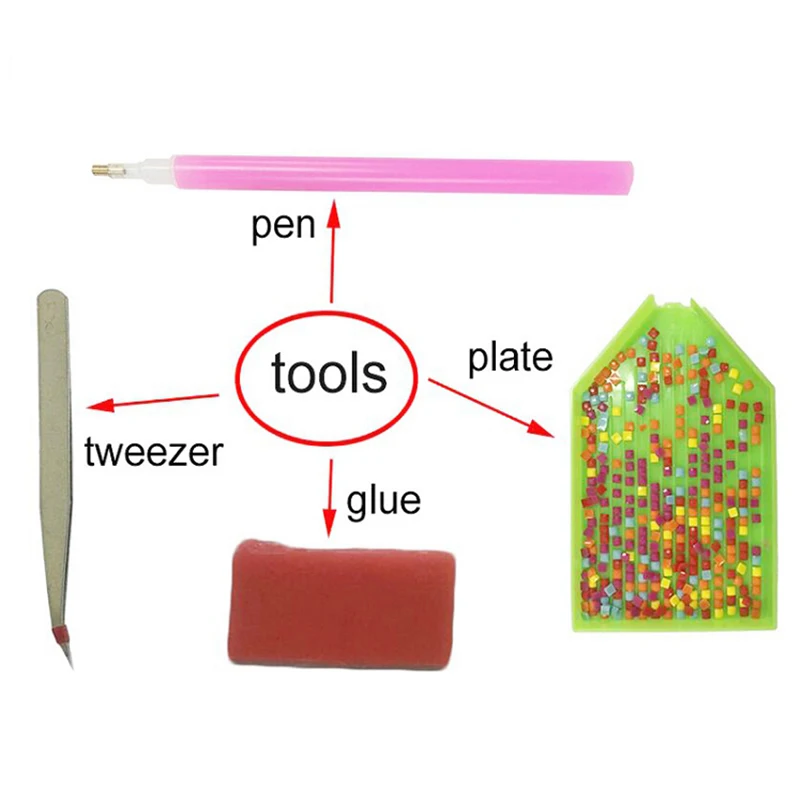 Упаковочные коробки/сумки, стразы из смолы, вышитая ткань, ручка для сверления точек, клей, алмазная пластина, пинцет и сумки с замком на молнии. (фоторамка в комплект не входит.)
