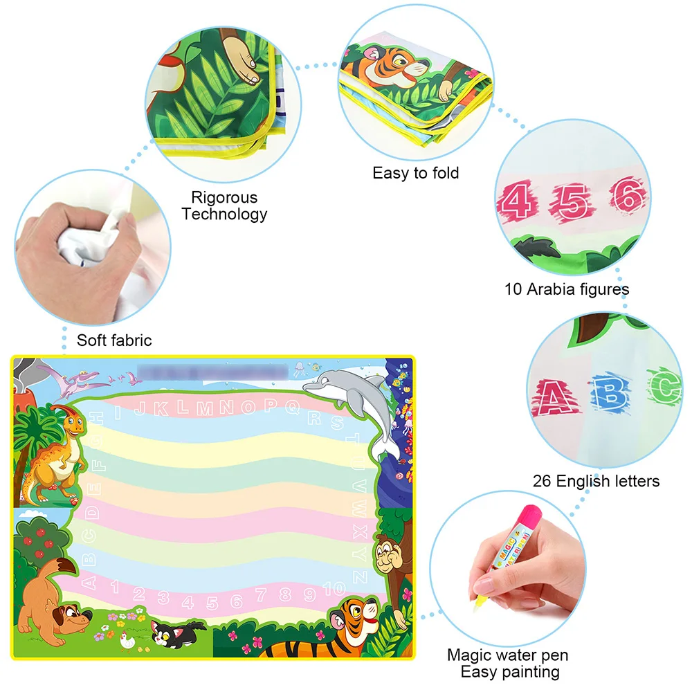 Материал: тканьФункция: образовательная, пригодная для повторного использования.Просто нужно заполнить водой, чтобы рисовать, и он исчезнет после нескольких minitus, дети могут каракули его снова и снова, родители больше не волнуйтесь беспорядок.