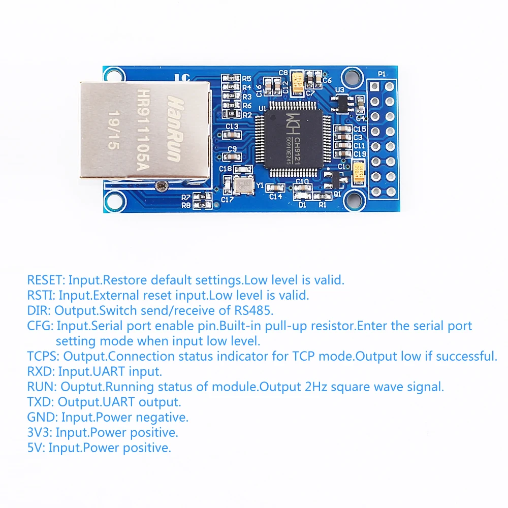 1. Описание:Это UART к RJ45 Ethernet сетевой конвертер Модуль с CH9121 контроллером. CH9192Имеет встроенный протокол связи TCP/IP. Он может осуществлять двустороннюю прозрачную передачу сетевых пакетов данных и последовательных данных. Поддержка TCP клиента, TCP сервера, UDP клиента, UDP сервера четырех рабочих методов. Его максимальная скорость передачи данных может быть 921600bps.2. Особенности:1>. Встроенный MAC и PHY2>. Поддержка двусторонней прозрачной передачи3>. Поддержка 10/100 м4>.Supprot MDI/MDIX автоматическое преобразование5>. Поддержка DHCP автоматически получает IP адрес6>. Поддержка доступа к DNS доменному имени7>. Поддержка TCP клиента, TCP сервера, UDP клиента, UDP сервера8>. Поддержка механизма сохранения жизни9>. Настройка времени ожидания Supprot UART 0 ~ 2000ms3. Параметры:1>. Модель: CH91212>. Работа Напряжение AC/DC 3,3 V ~ 5V3>. Уровень UART: DC 3,3 V ~ 5V4>. Коэффициент поглощения: 300bps ~ 921600bps5>. Рабочая температура:-25 ℃ ~ 85 ℃6> Рабочая влажность: 5% ~ 95% относительной влажности7>. Размер: 54*25*18 мм4. Определение штифта:1>. Сброс: вход. Восстановление заводских настроек, включение чипа, низкий уровень действителен2>.RSTI: вход. Вход внешнего сброса, низкий уровень допустим3>.DIR: выход. Использование управления RS485 отправка и получение переключения4>.CFG: вход. Режим настройки последовательного порта, встроенный выдвижной разъем, введите режим конфигурации последовательного порта при обнаружении низкого уровня, режим настройки высокого уровня.5>.TCPS: выход. TCP клиентский режим, порт подключен к контакту индикации состояния, и соединение успешно выводит низкий уровень6>.RXD: вход. UART ввод данных, подключение внешних MCU TXD7>. Запуск: выход. Модуль работает с индикатором состояния, выход 2 Гц квадратная волна8>.TXD: выход. UART вывод данных, подключение внешних MCU TXD9>.GND: мощность. Мощность заземления10>.3V3: мощность. 3,3 V источника питания, а также на расстоянии 5V источника питания выбрать один из двух11>.5 В: мощность. 5V источника питания, и 3,3 V источника питания выбрать один из двух5. Конфигурация модуля и описание режима работы:Конфигурация параметров модуля разделена на две части: Основные настройки и конфигурация порта, основные настройки включают в себя, имя устройства, сетевой параметр, функция согласования последовательного порта, функция согласования последовательного порта по умолчанию выключена, Defaulting через аппаратное обеспечение CFG0 pin введите режим настройки порта материала, может через последовательные переговоры порта войти режим настройки последовательного порта после открытия. CH 9121 Поддержка DHCP и ручного режима два способа установить основные параметры сети.5,1. Режим Клиента TCPНа модели Клиента TCP, после зарядки в модуле, возьмет на себя подключенный TCP сервер терминал, когда соединение установлено, может обеспечить двустороннюю прозрачную передачу сетевых пакетов данных и данных последовательного порта в этом режиме, Ip-адрес TCP сервера должен быть виден модулю, поэтому это означает, что через модуль IP можно напрямую подключить IP сервер PING. В режиме TCP CLIENT, поддержка локального последовательного порта случайным образом, поддержка через область удаленного обслуживания доступа к доменным именам, внутренний чип по умолчанию открывает TCP Базовый механизм сохранения жизни, он может обнаружить, что устройство находится в автономном режиме. Модель клиентского приложения TCP, как показано ниже: подходит для сбора данн