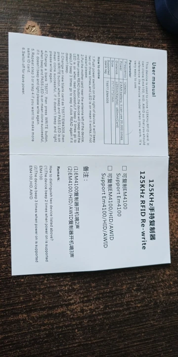 Брелки чипует. Быстро и качественно. Карточки не пробовал. В комплекте 5 чипов и 5 карточек. Мануал на китайском и английском. Нов принципе он не нужен. Сбоку справа кнопка включения. Брелок прикладывается слева. Нажимаешь READ. Считываешь код. Загорается зелёный. Прикладываешь новый брелок нажимаешь WRITE и все. Спасибо продавцу. РЕКОМЕНДУЮ К ПОКУПКЕ.