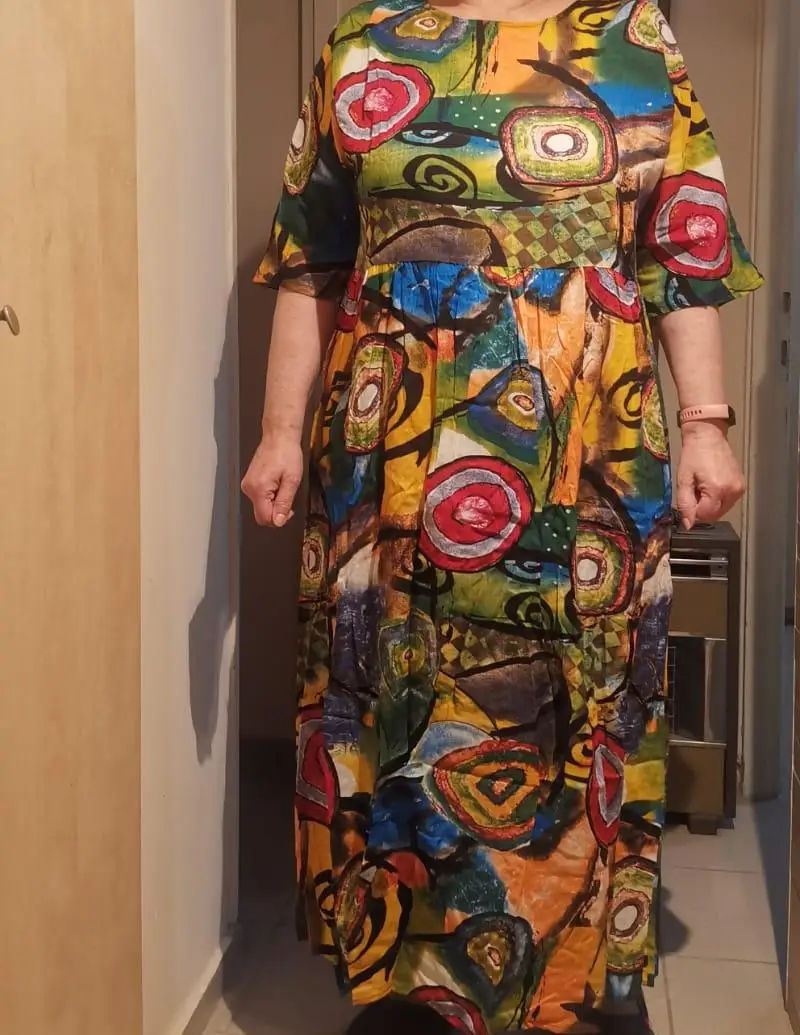 на рисунке расцветка платья яркая а пришло какого то грязного цвета по размеру совсем не подошло- заказывала по параметрам 52 размера а пришло такое огромное- я невысокого роста и мне оно было до полу- ну а ткань для лета в самый раз - легкая вообщем я разочаровалась