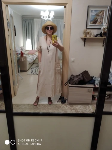 Отличное платье. Материал - тонкий лен, не просвечивает. На свой 48 рос. заказала XL, подошел идеально. Доставлен быстро. Спасибо продавцу.