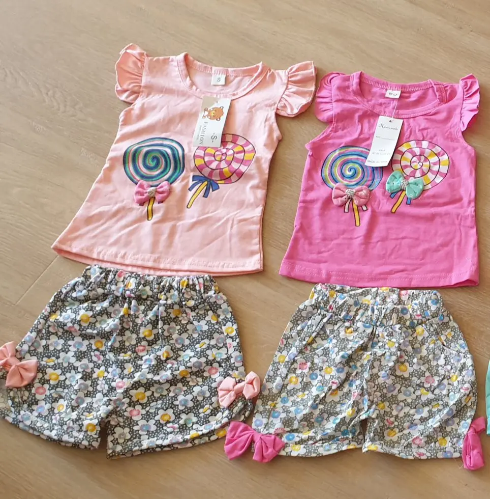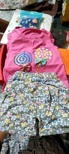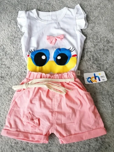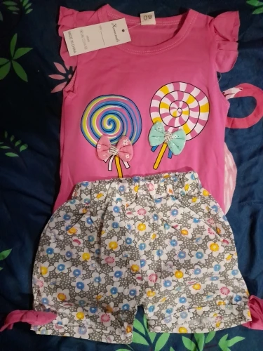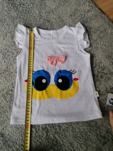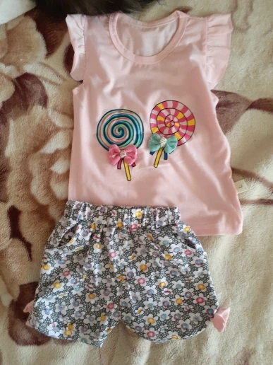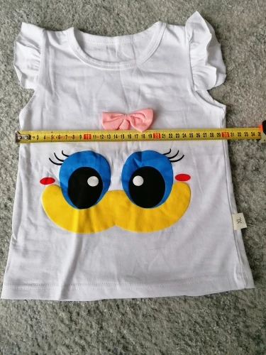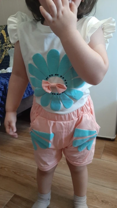 Футболка очень узкая, в таблице для размера 3Т указан объем груди 60 см, а на самом деле 54 см! Рукавчики не обстрочены, как на фото в описании. Про торчащие нитки молчу, это легко исправить. Бантики на футболке приклеены, один отпал при первой примерке... Шортики, на удивление, пошиты лучше, бантики пристрочены, размер примерно соответствует заявленному в таблице.