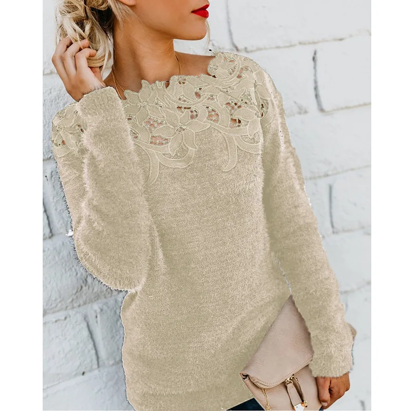 Женский Однотонный свитер с кружевом и длинными рукавами, обычный к...