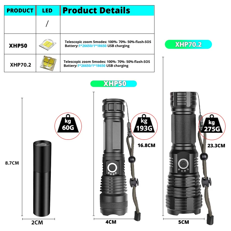 Портативный светодиодный фонарик XHP70.2, тактический Водонепроницаемый фонарик, 5 режимов освещения, встроенная лампа с увеличением, с зарядкой от USB 26650