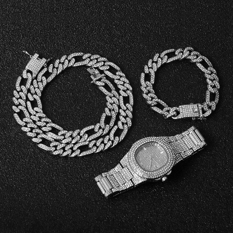 Колье + часы + браслет, комплект из 3 предметов, цепочка в стиле хип-хоп, Майами, панцирная, кубинская, полностью покрытая камнями, стразы, украшения для мужчин