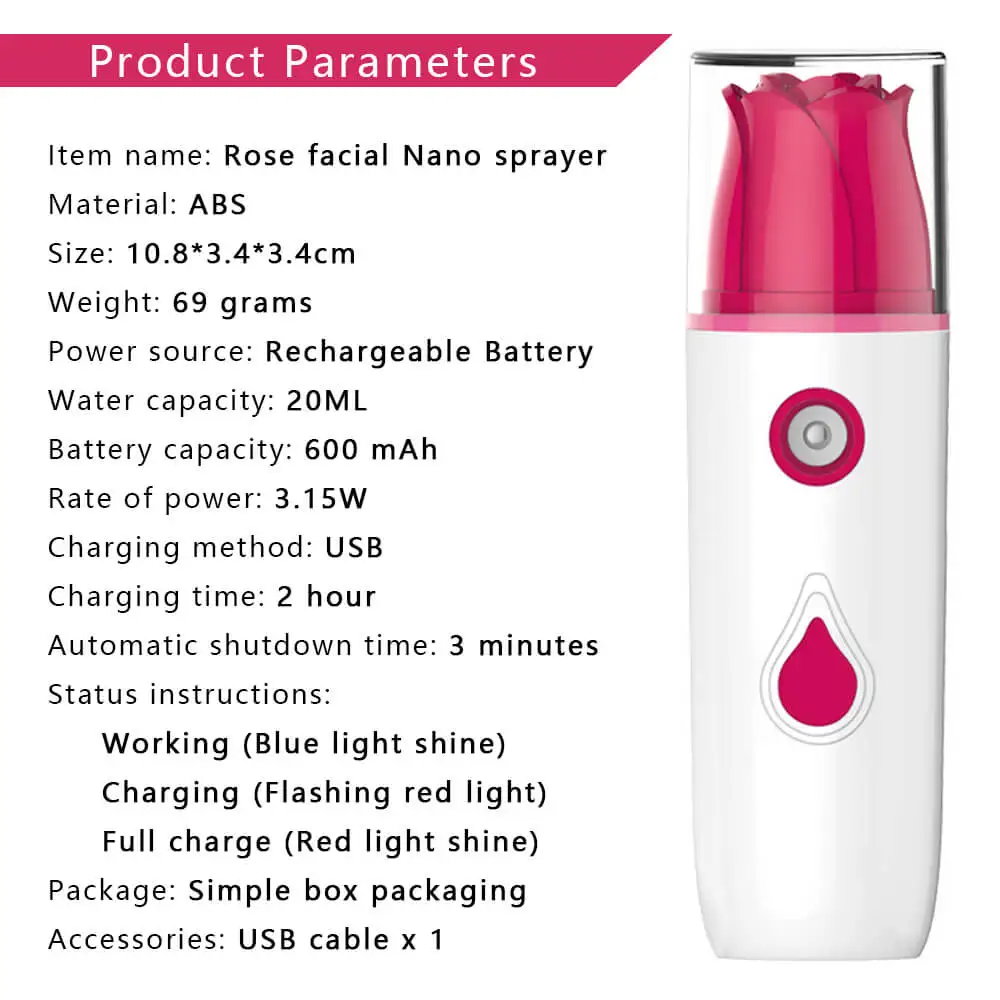 Наименование товара: розовый нано-распылитель для лица Материал: АБС-пластик Размеры: 10,8*3,4*3,4 см Вес: 69 г Источник питания: перезаряжаемая батарея Емкость воды: 20 мл Емкость аккумулятора: 600 мАч Коэффициент мощности: 3,15 W Метод зарядки: USB Время зарядки: 2 часа Автоматическое выключение: 3 минуты Статус инструкции по уходу за изделием Рабочий (синий светильник Блестящий) Зарядка (мигающий красный светильник) Полный заряд (блестящий красный светильник) Посылка: простая упаковка Аксессуары: USB кабель x 1