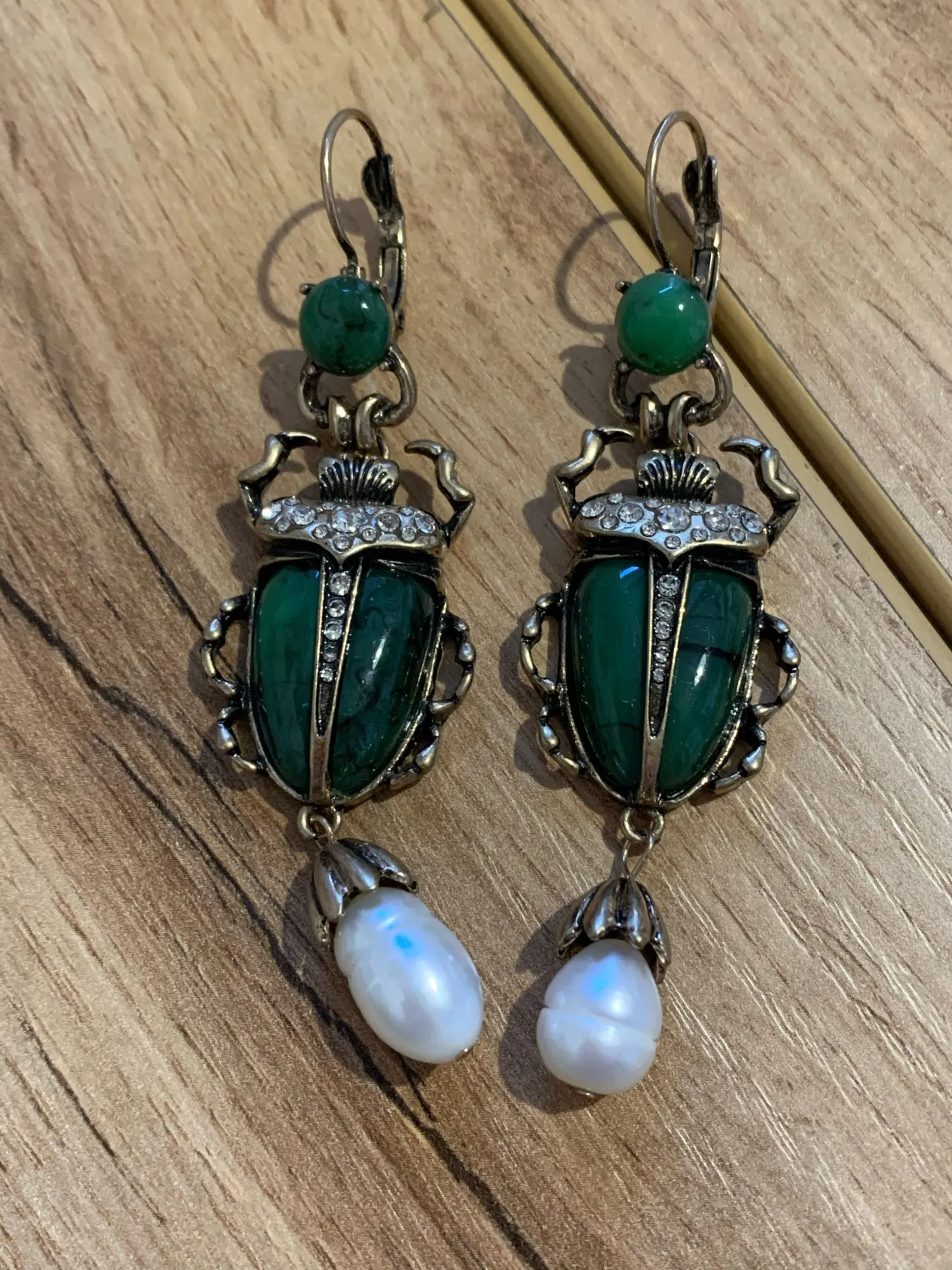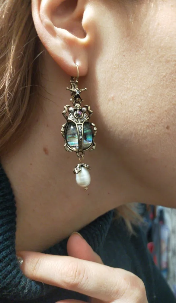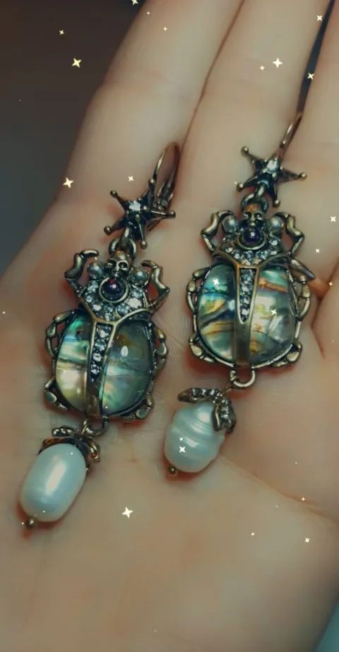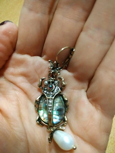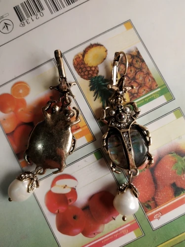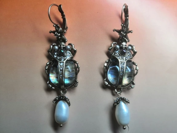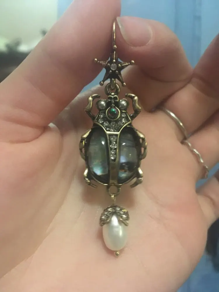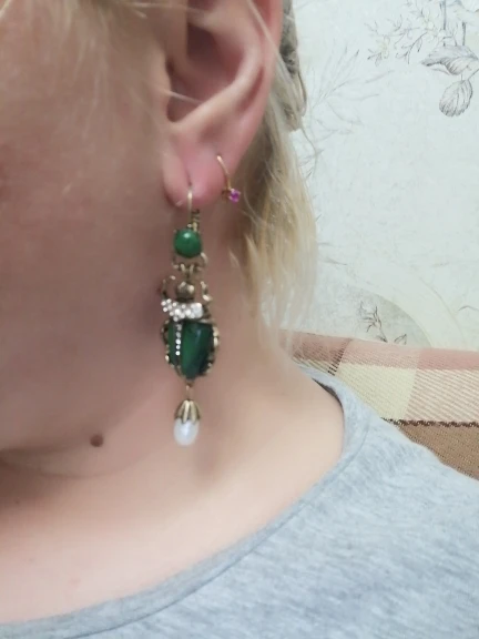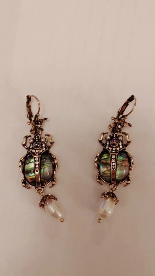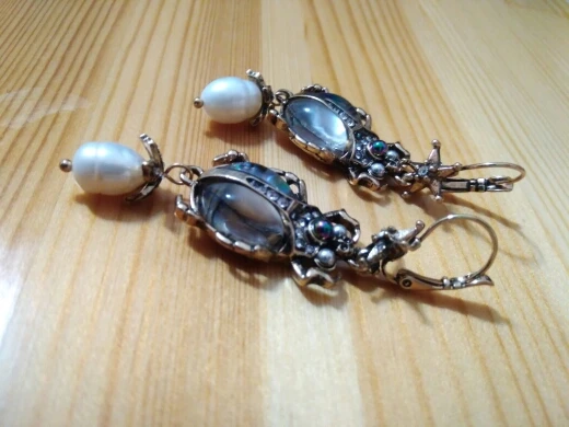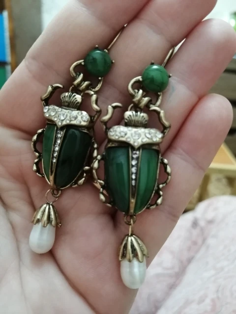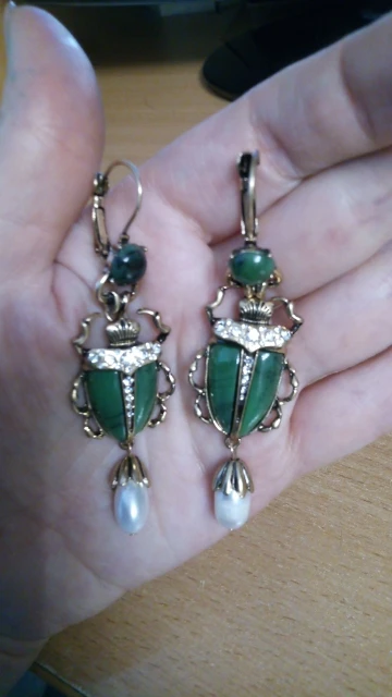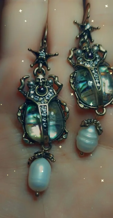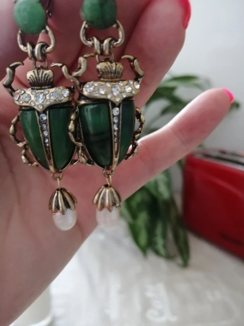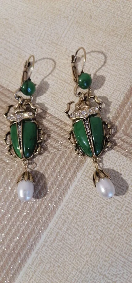 Шикарные серьги, выглядят просто замечательно. в центре вместо спинки жука не кристалл и не жемчужина, как кажется по фото, а картинка, залитая эпоксидкой, но это не портит вида