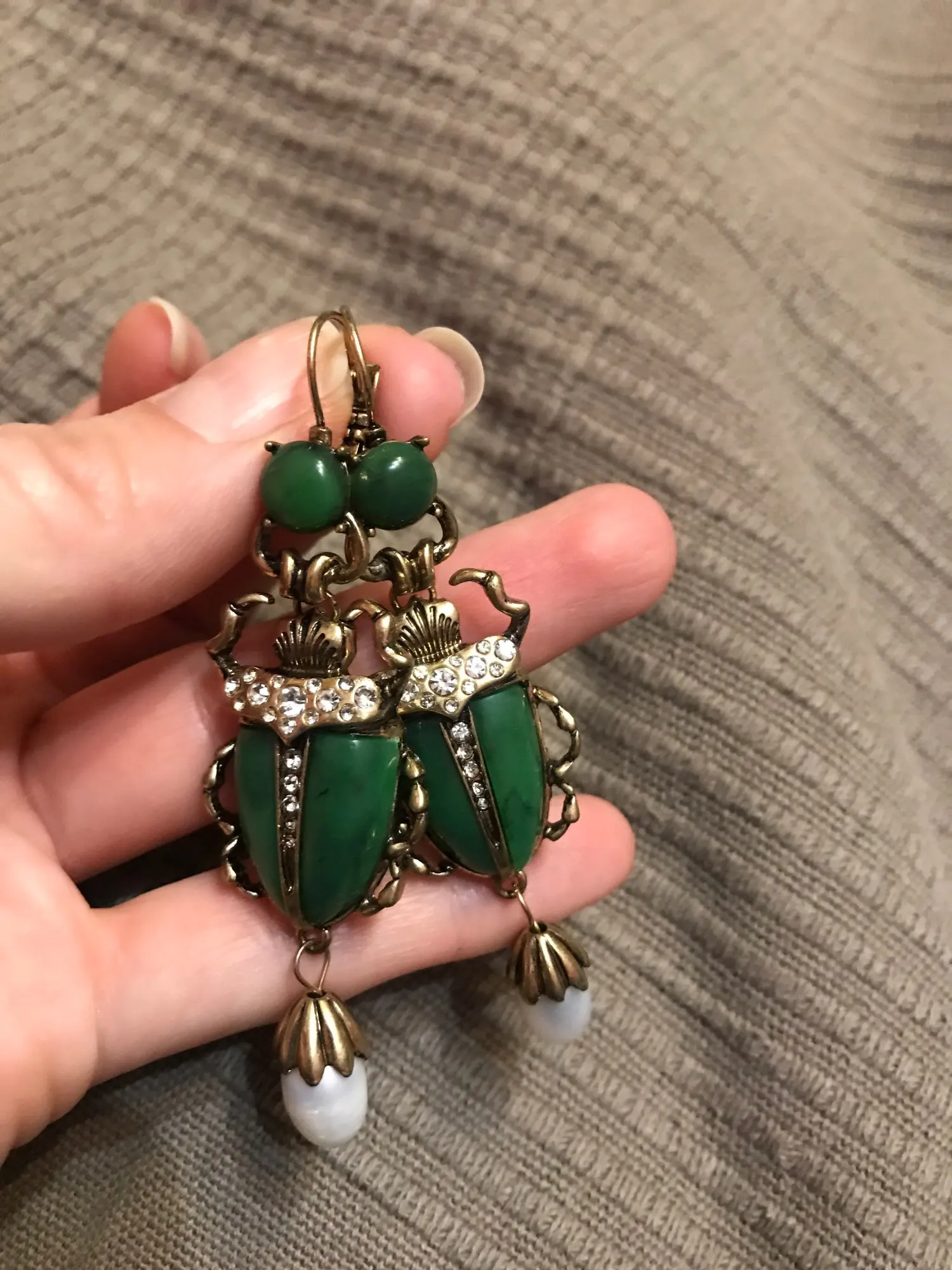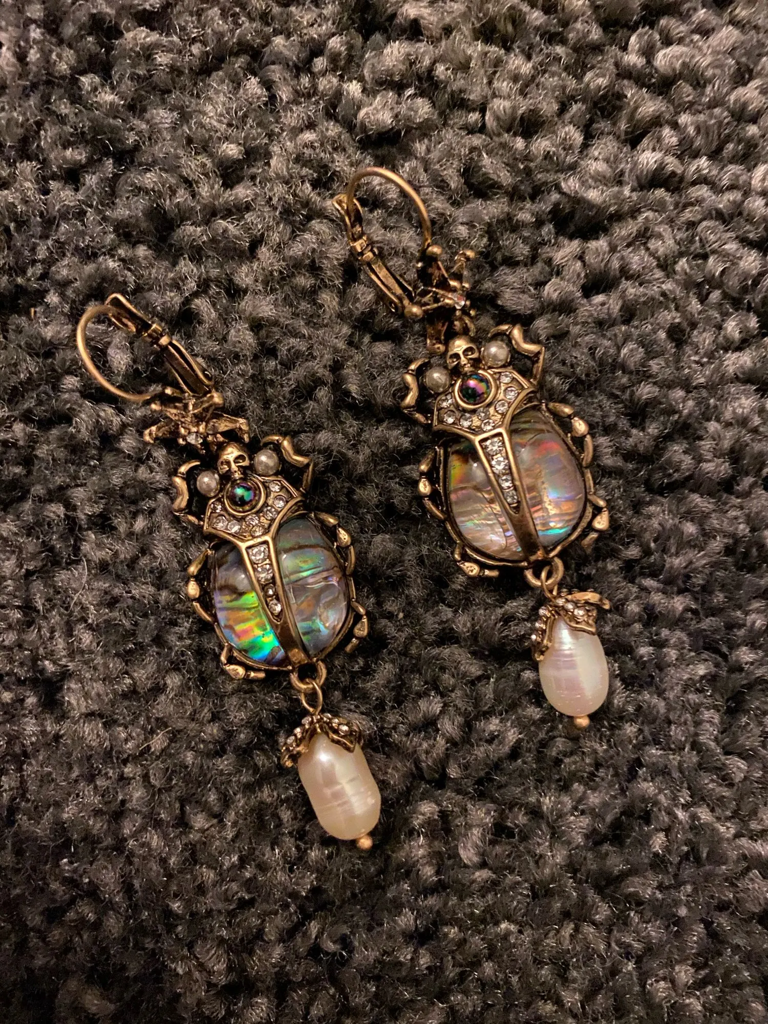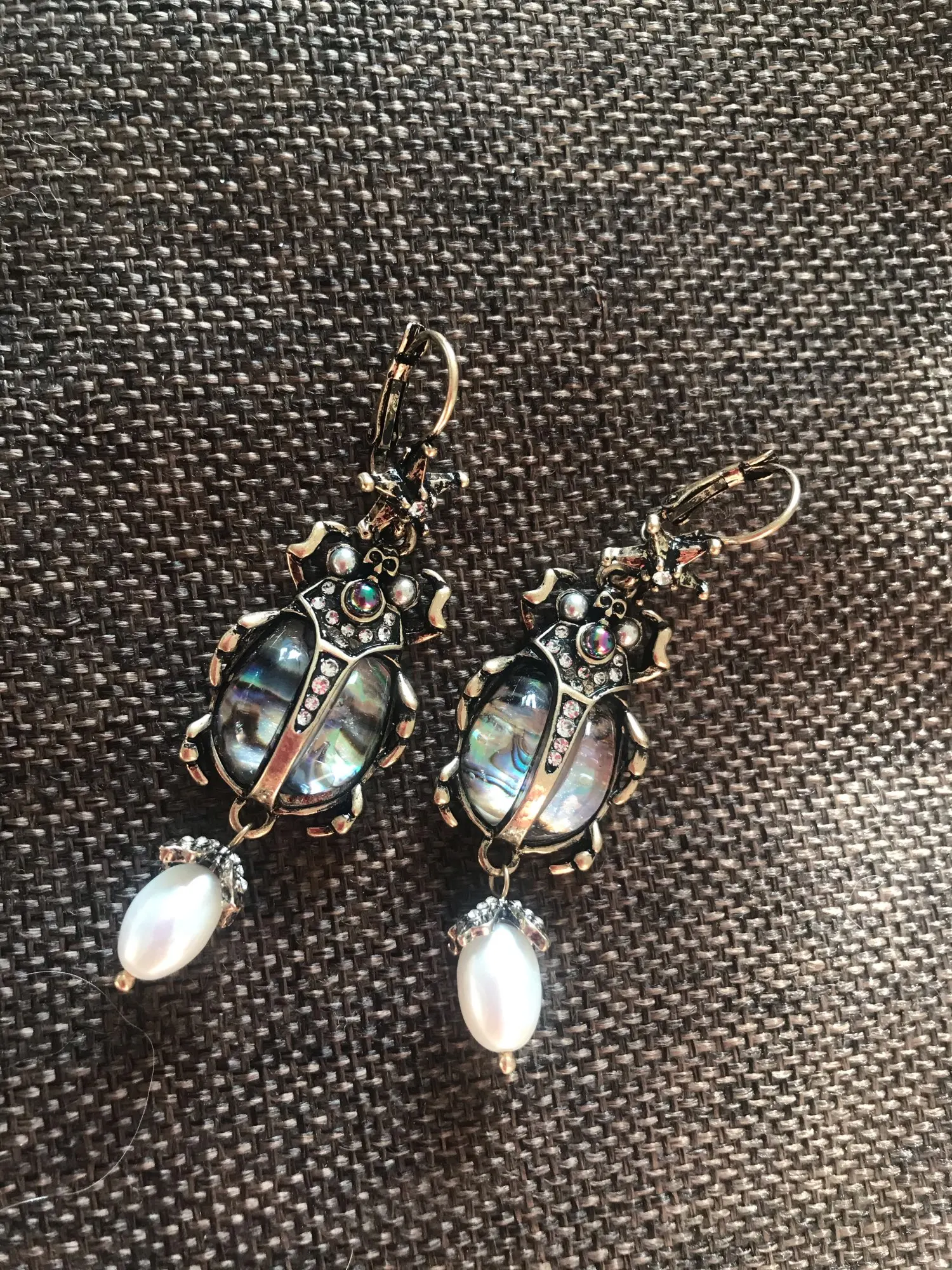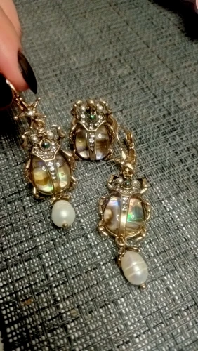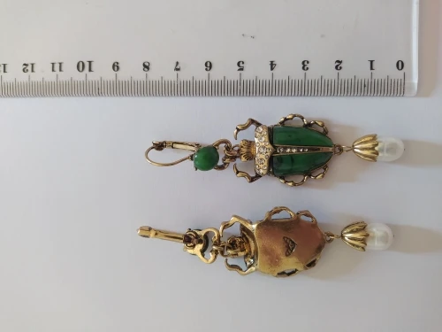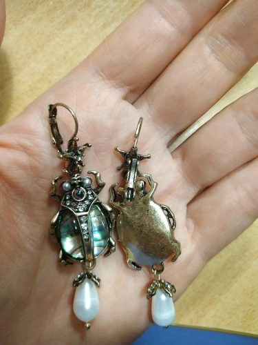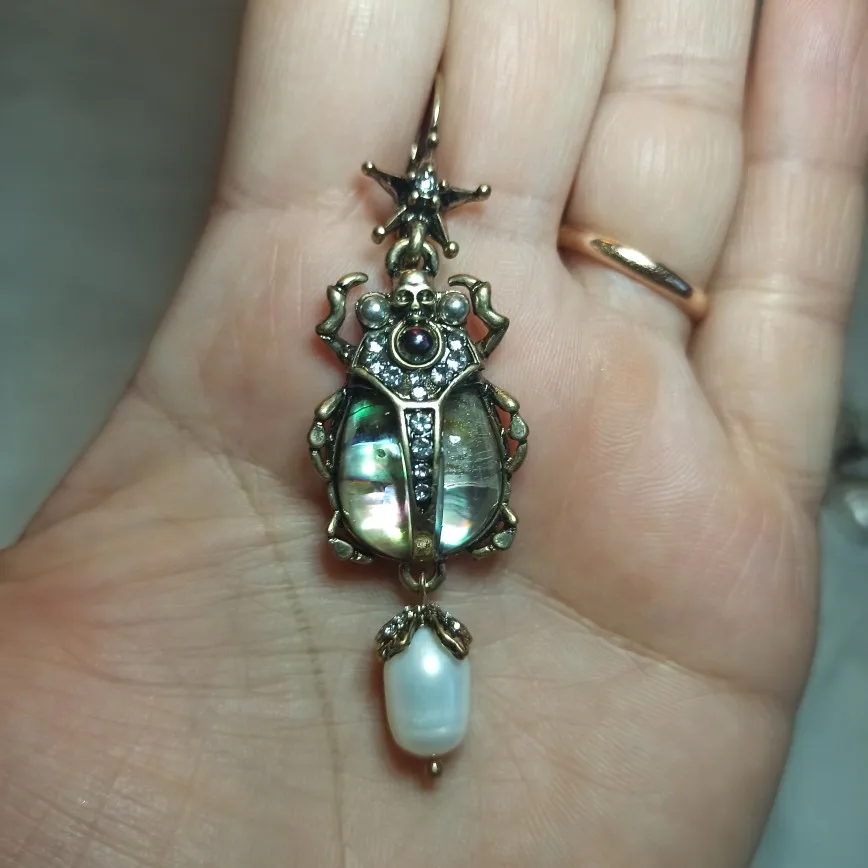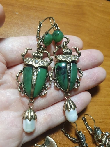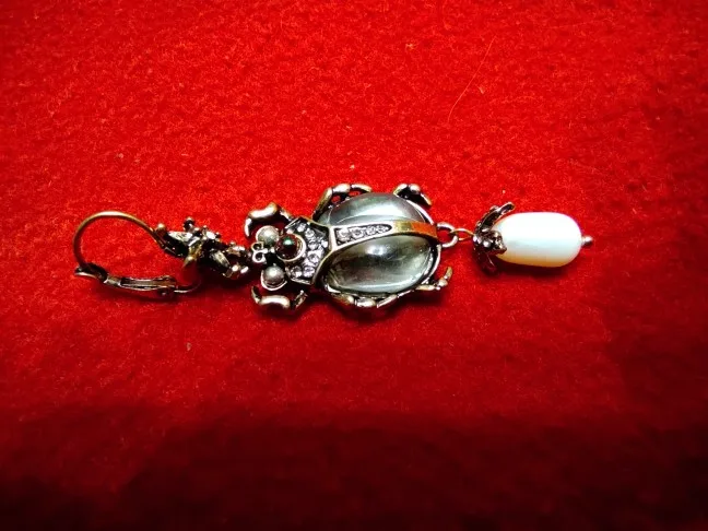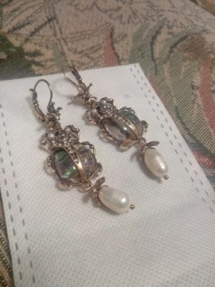 Шикарные серьги, выглядят просто замечательно. в центре вместо спинки жука не кристалл и не жемчужина, как кажется по фото, а картинка, залитая эпоксидкой, но это не портит вида