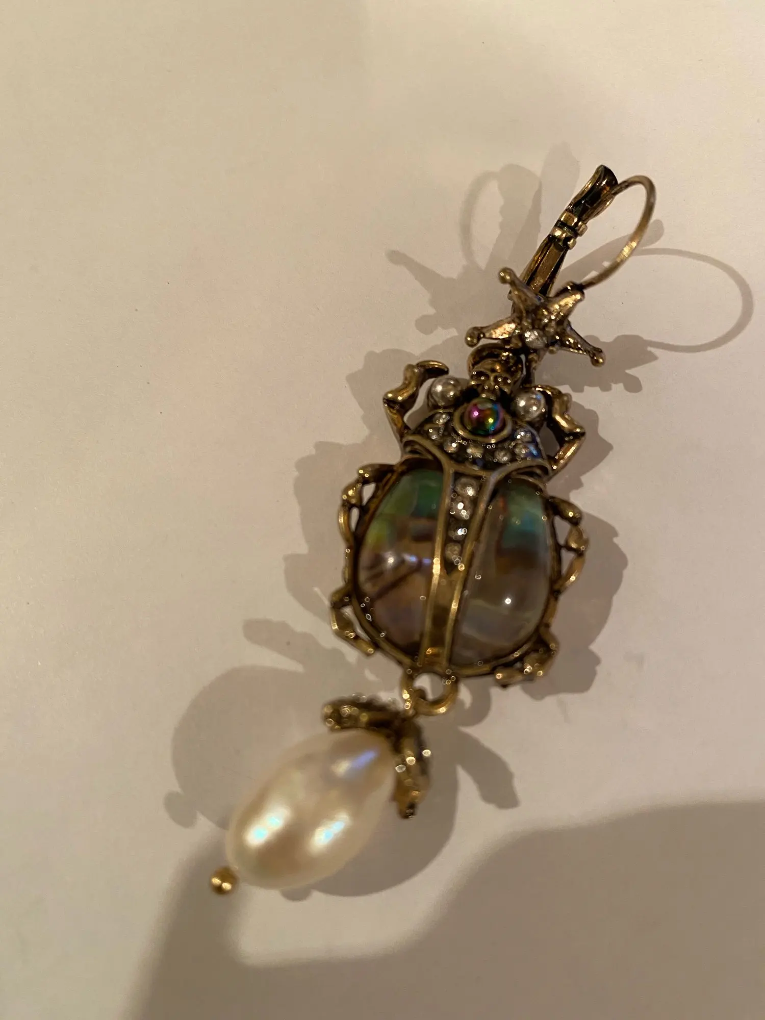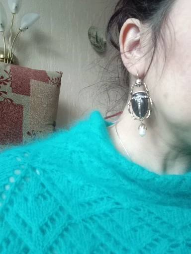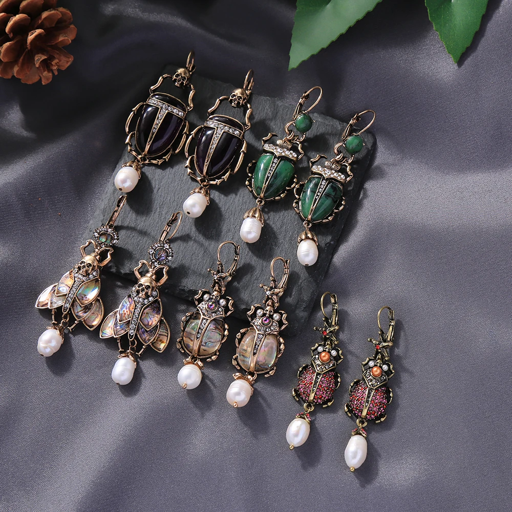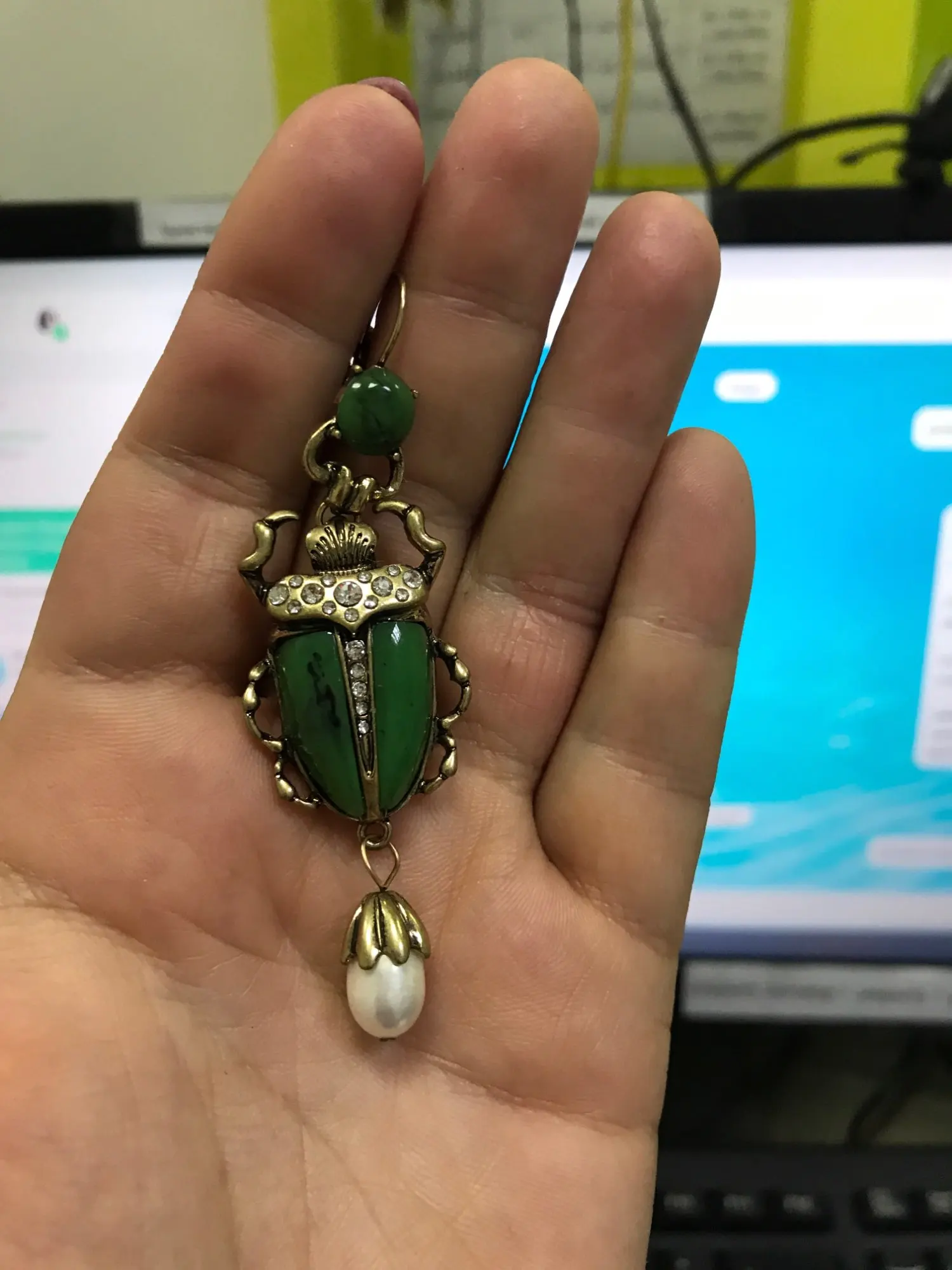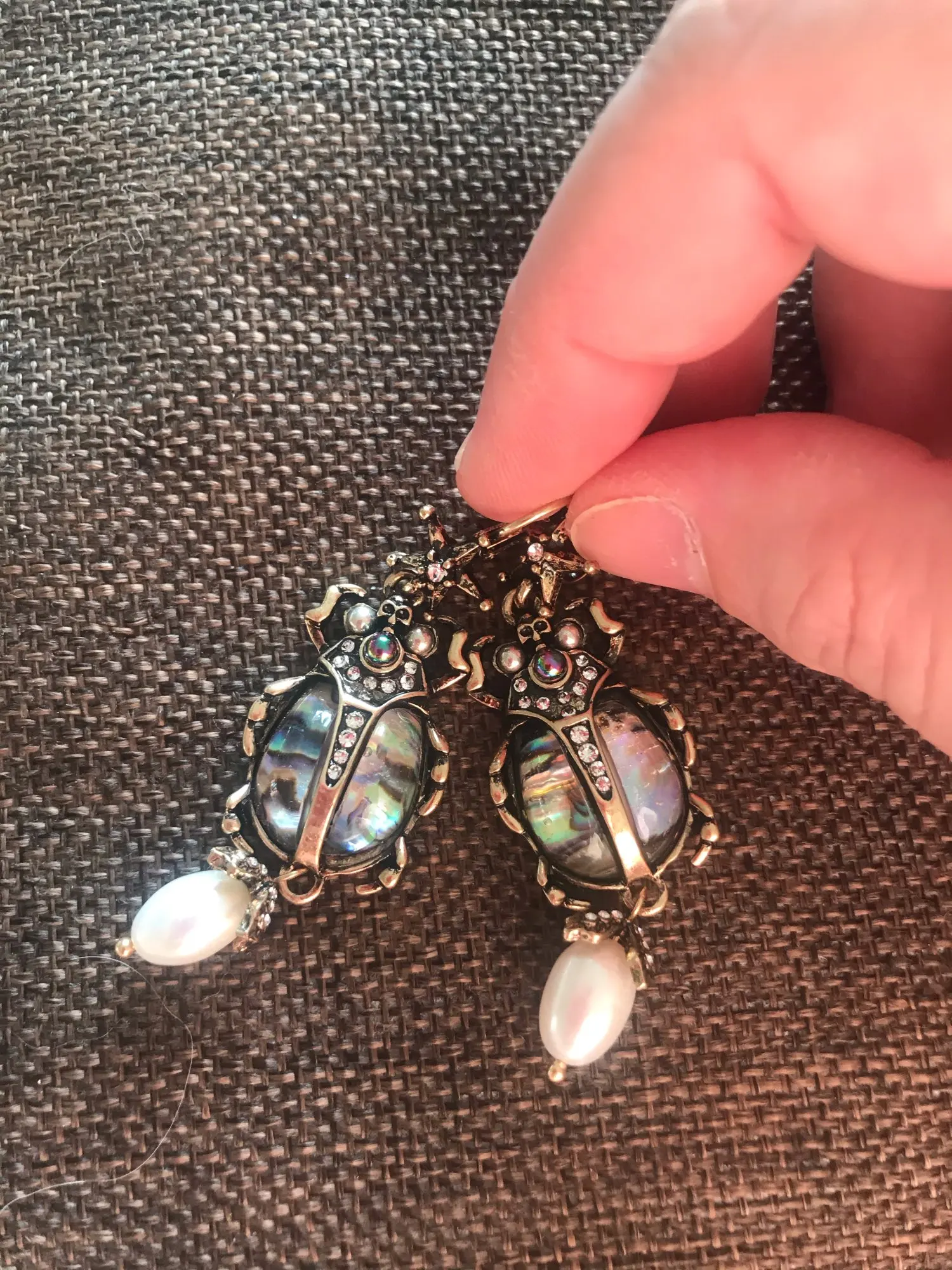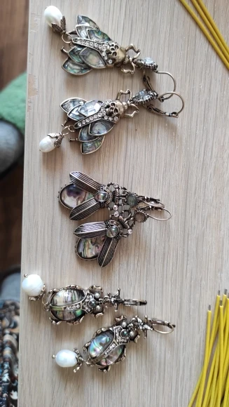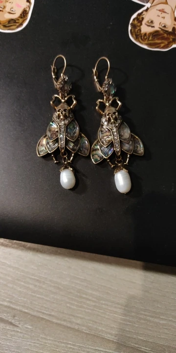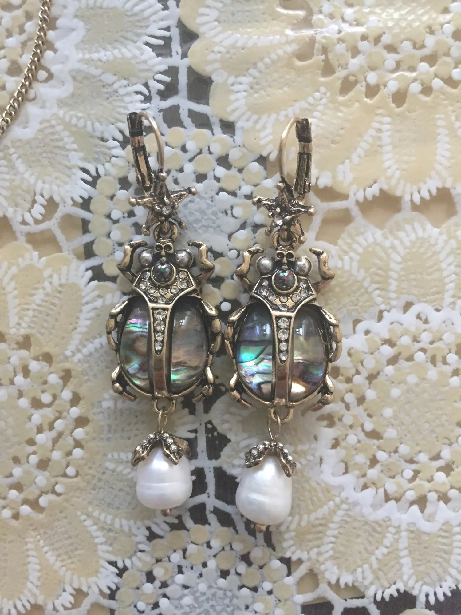 Шикарные серьги, выглядят просто замечательно. в центре вместо спинки жука не кристалл и не жемчужина, как кажется по фото, а картинка, залитая эпоксидкой, но это не портит вида