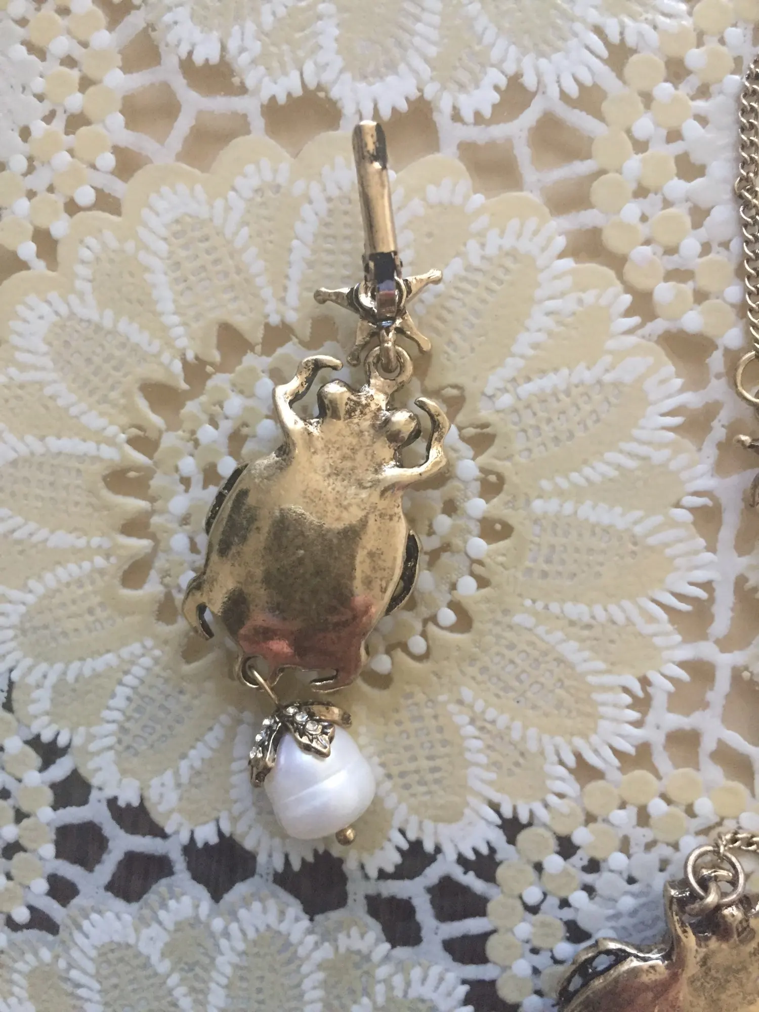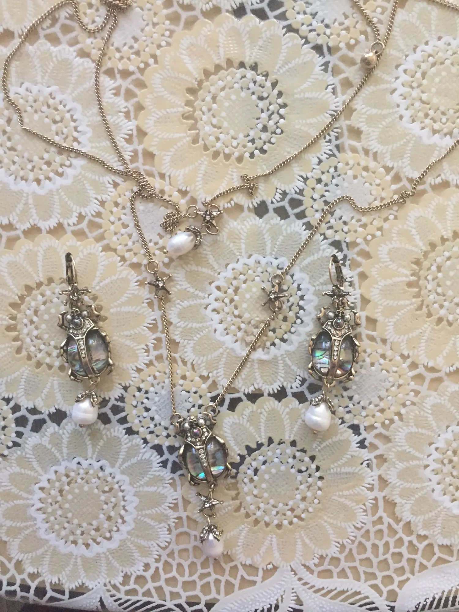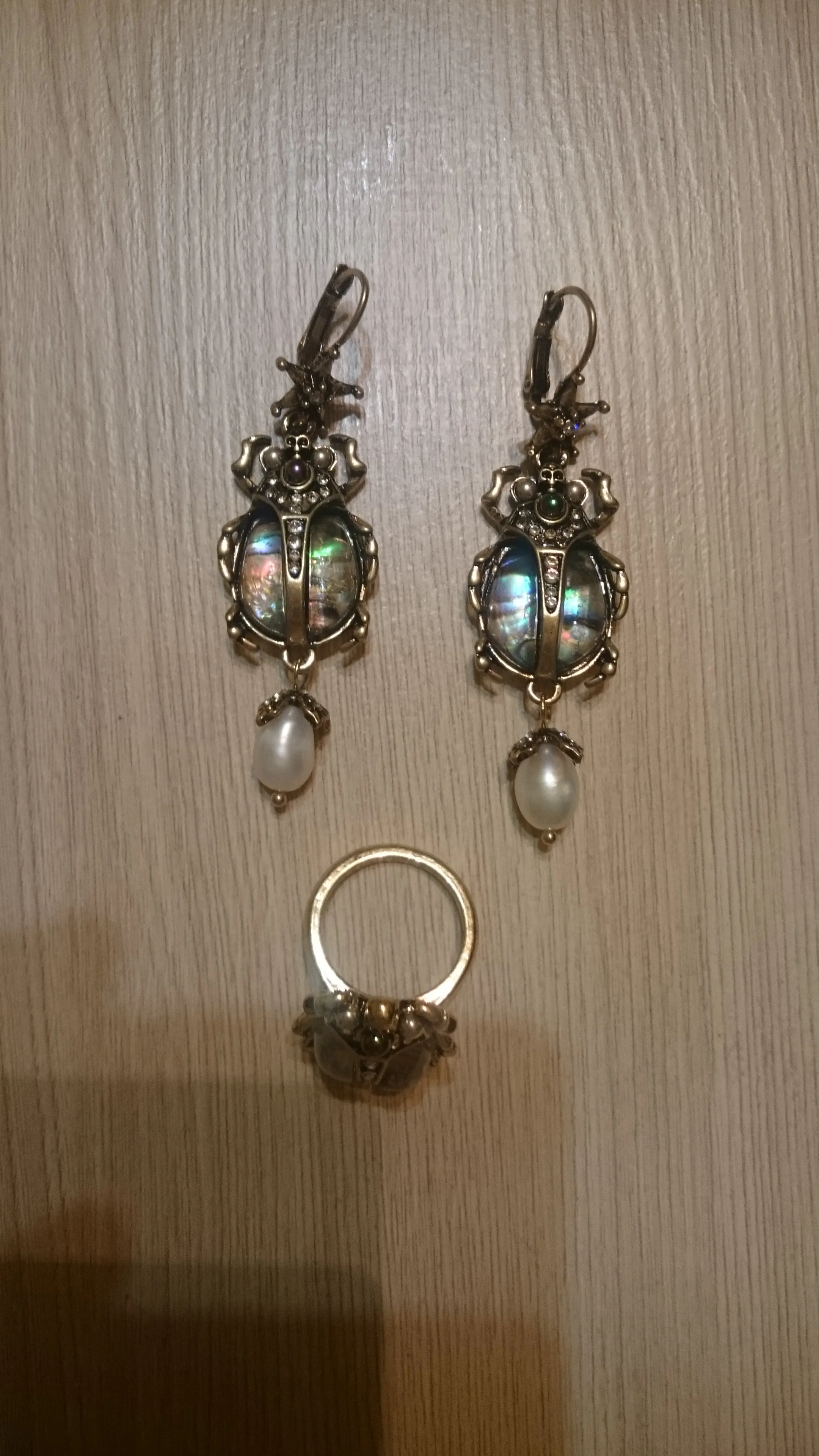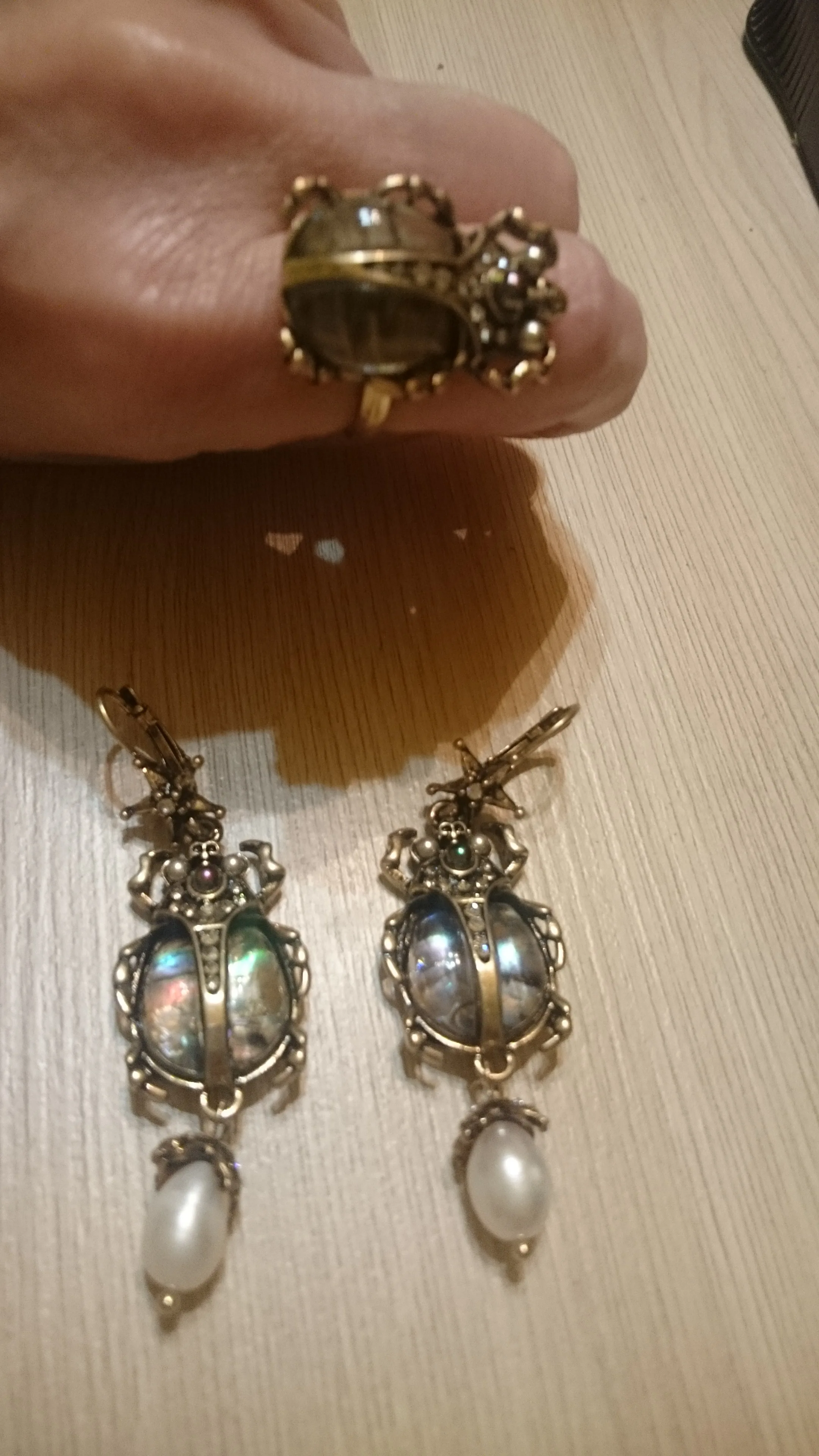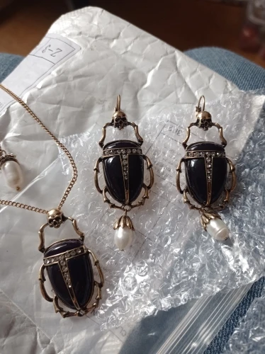 заказала комплект серьги и подвеску, уж очень приятная была цена. доставка стремительная за две недели уже на почте, все отслеживалось от начала и до конца. супер сервис объединенных заказов по серьгам никаких нареканий, если только тяжеловаты слегка, но на подвеске отсутствовала жемчужина, что меня сначала расстроило, но покрутив их в руках, я поняла, что именно на жуках, даже если ее снять, то хуже не станет. Зато без нее серьги станут немного легче, что плюс. поэтому скорее всего и с серёг жемчужины сниму.