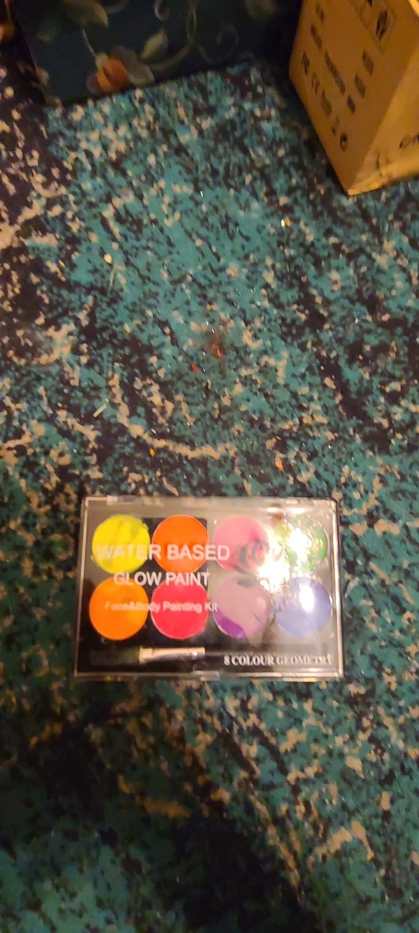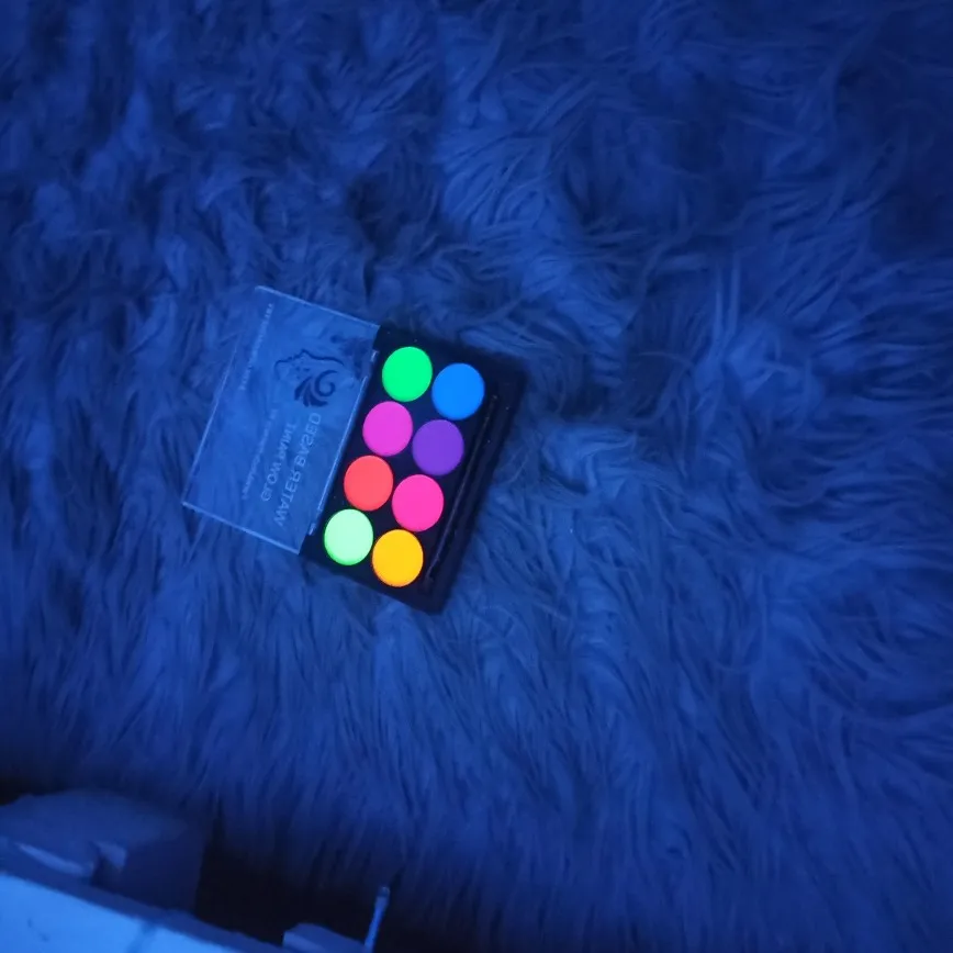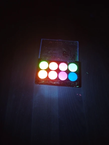 К сожалению, синяя краска в наборе была разбитой и рассыпавшейся по всем остальным. Так же синяя и фиолетовая краски светятся тусклее, чем это показано на картинке