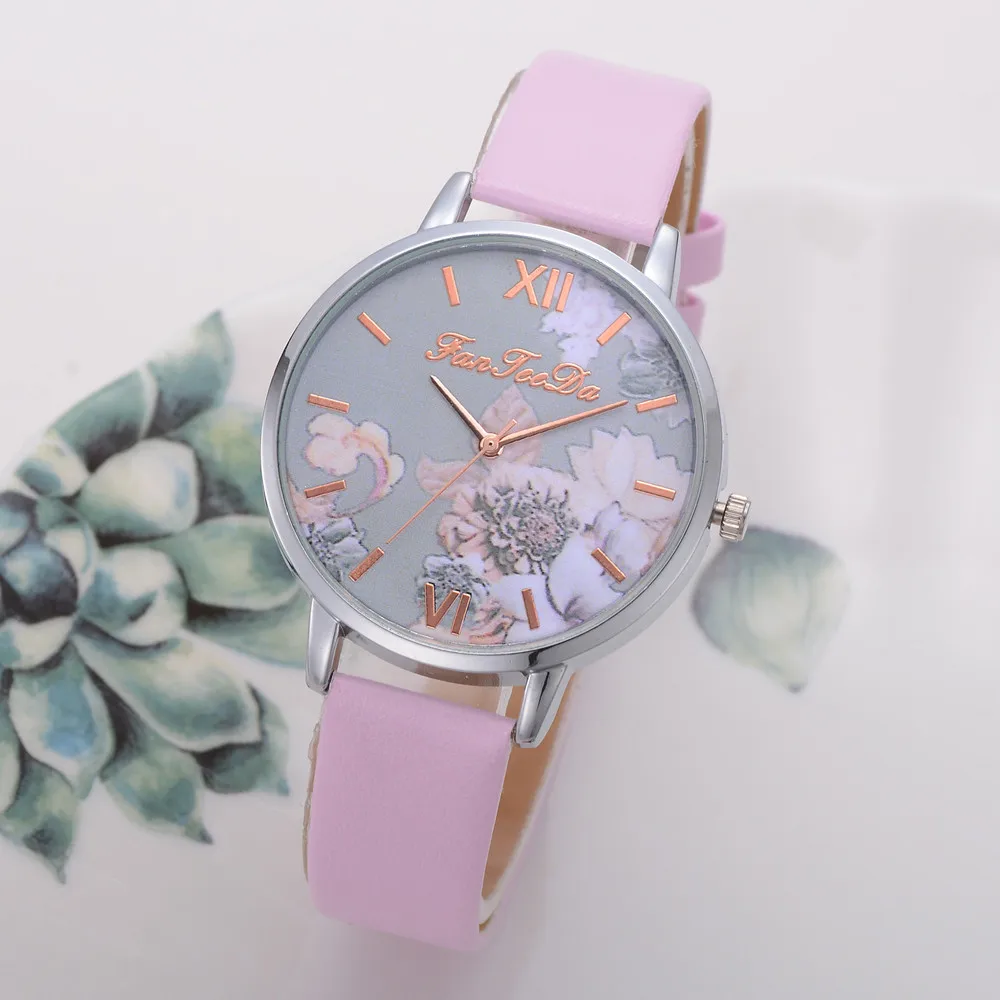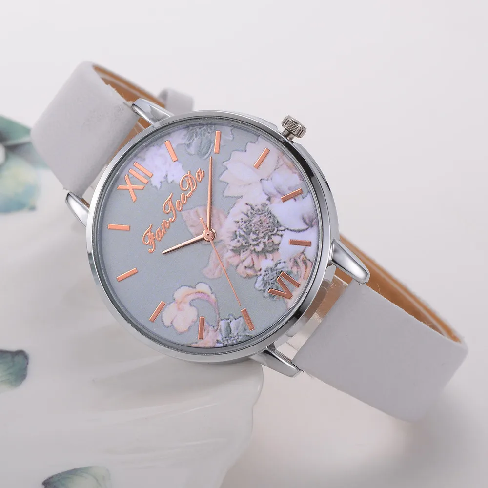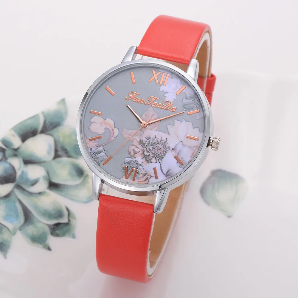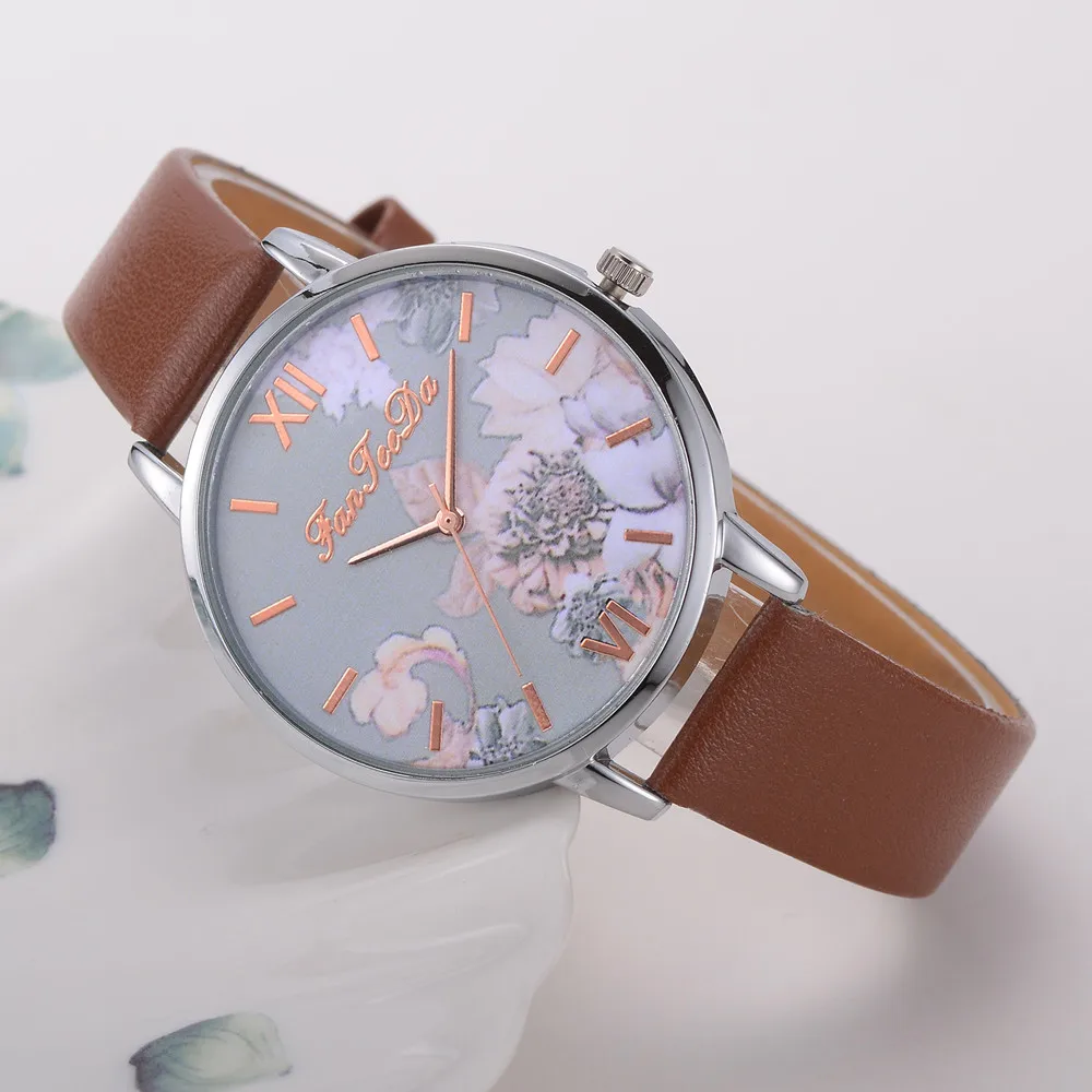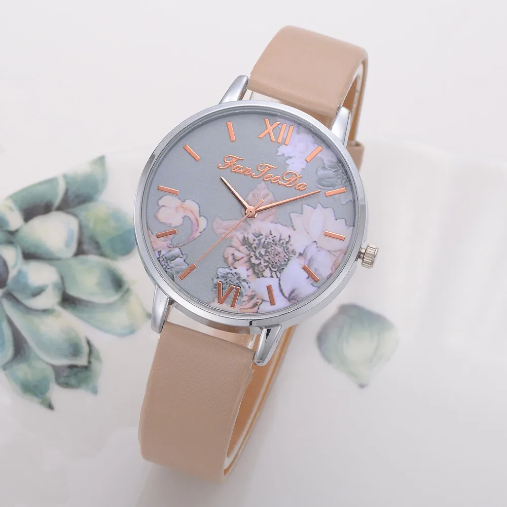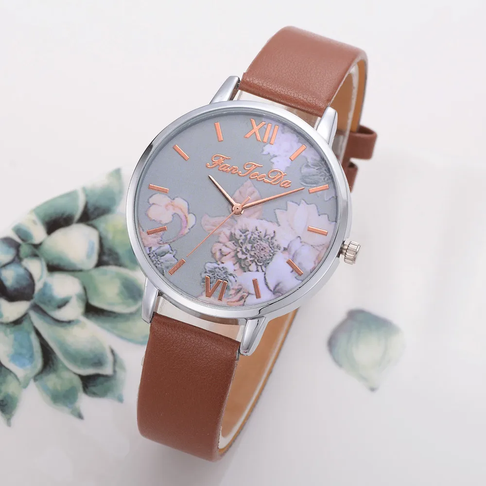 Часы женские кварцевые с кожаным ремешком и цветочным принтом