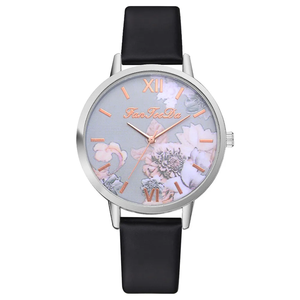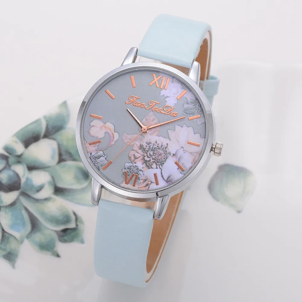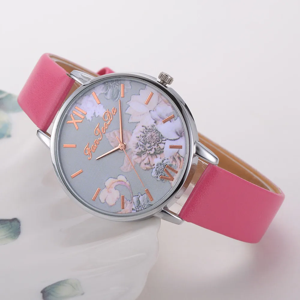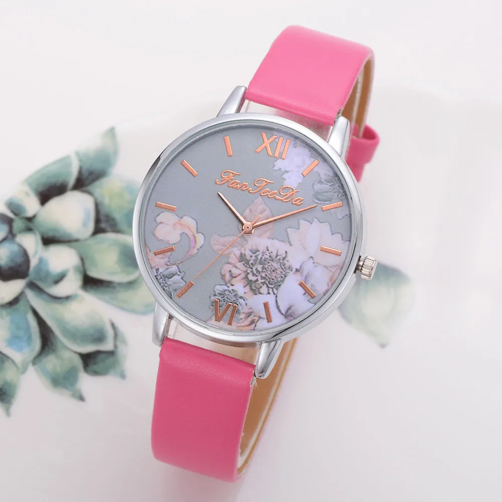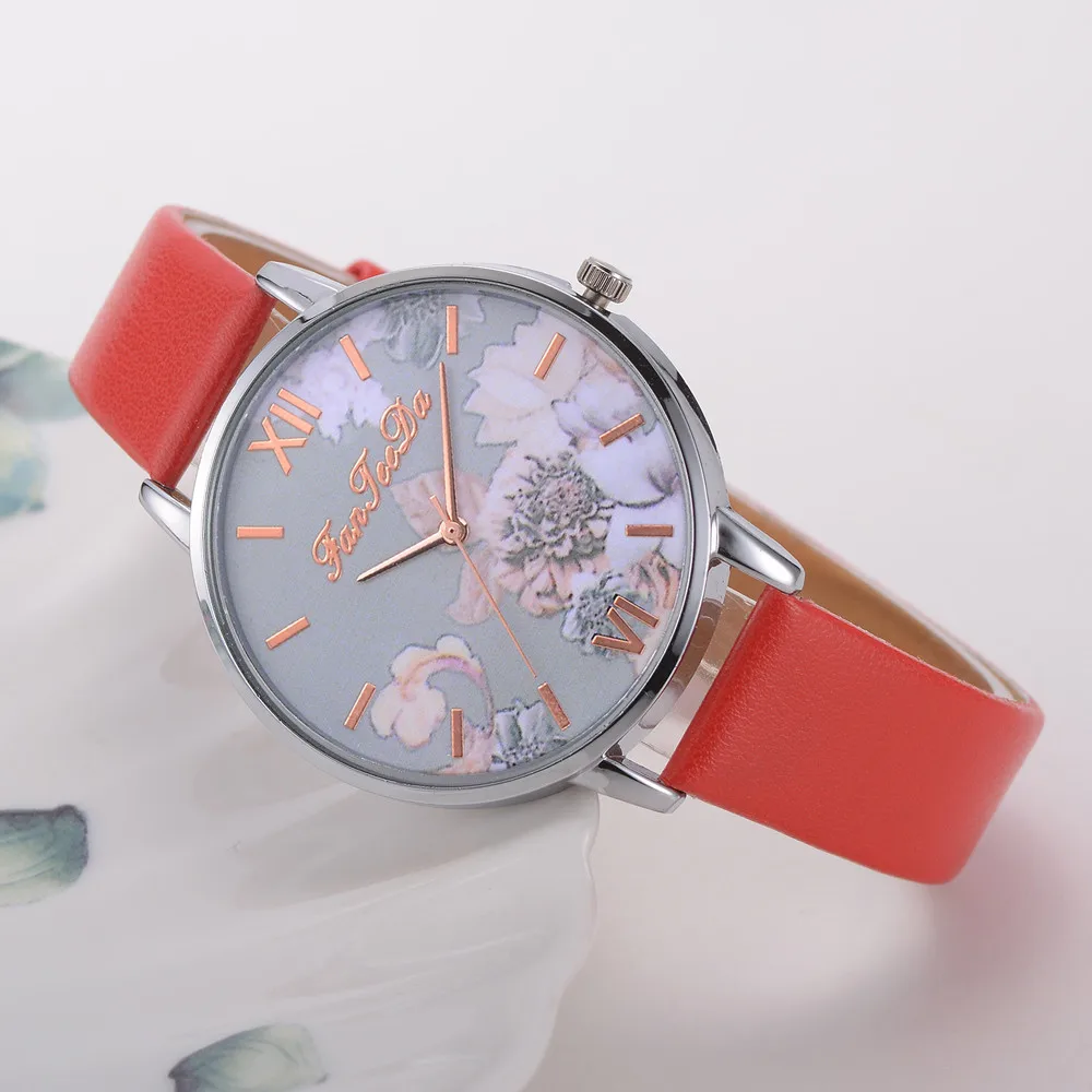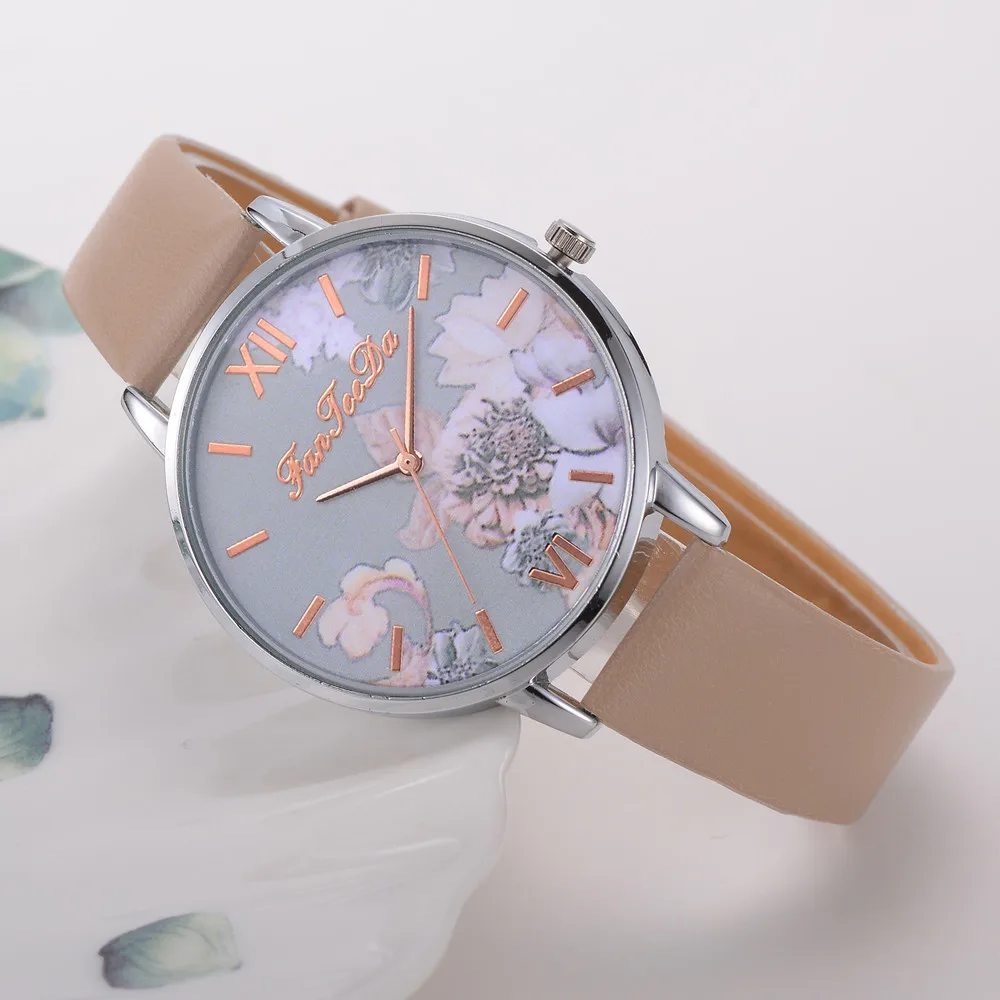 Часы женские кварцевые с кожаным ремешком и цветочным принтом