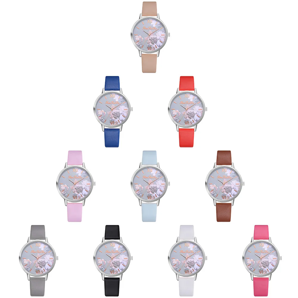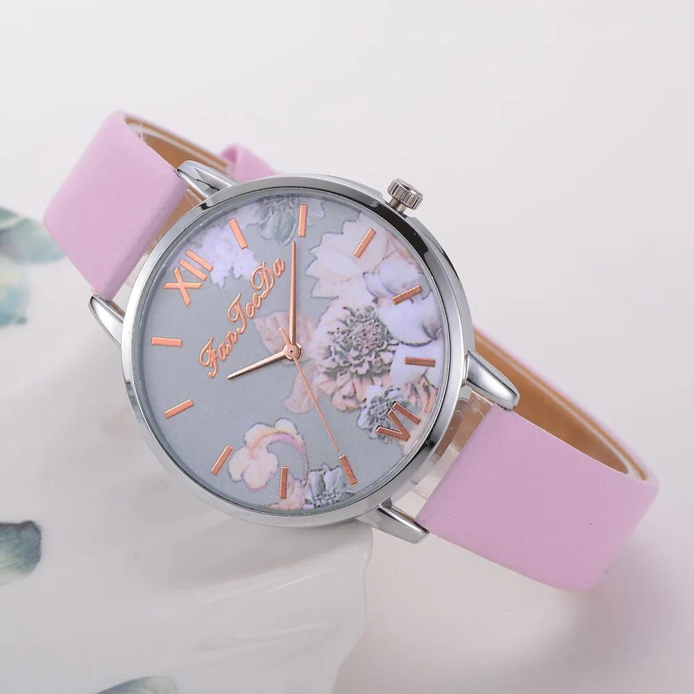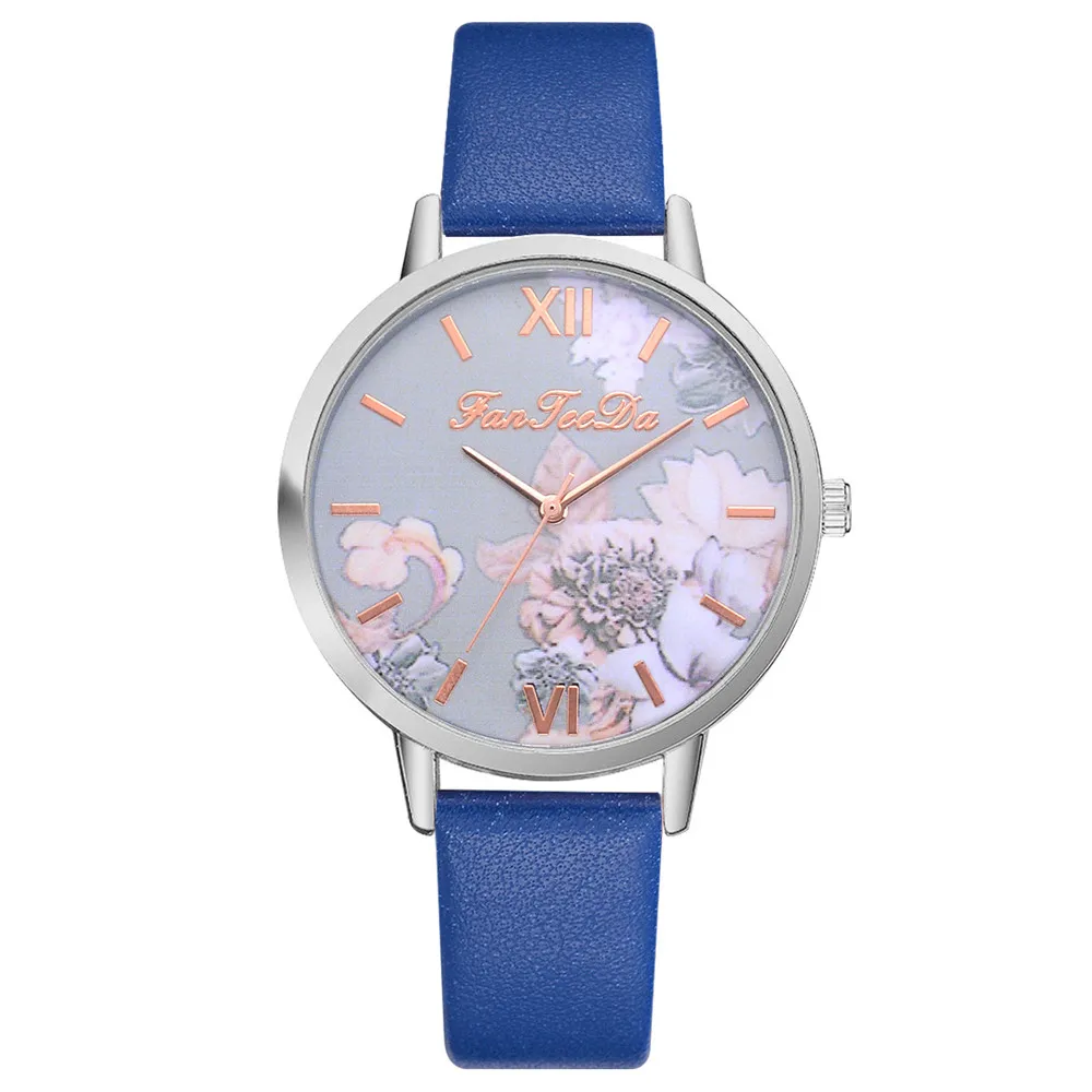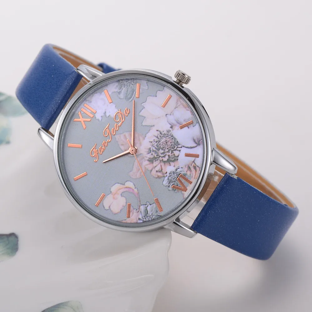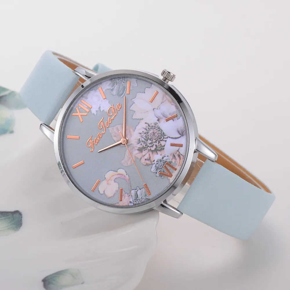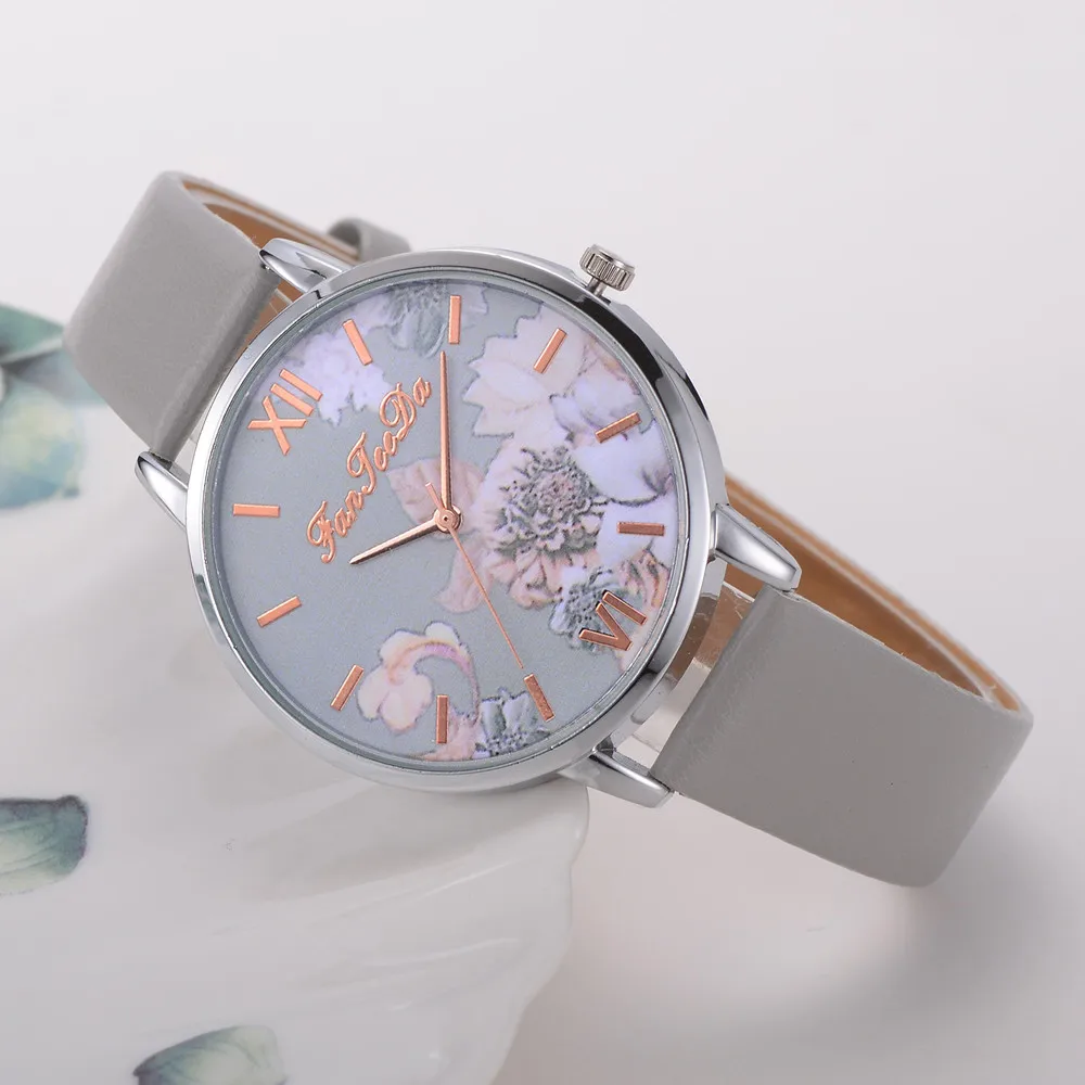 Часы женские кварцевые с кожаным ремешком и цветочным принтом