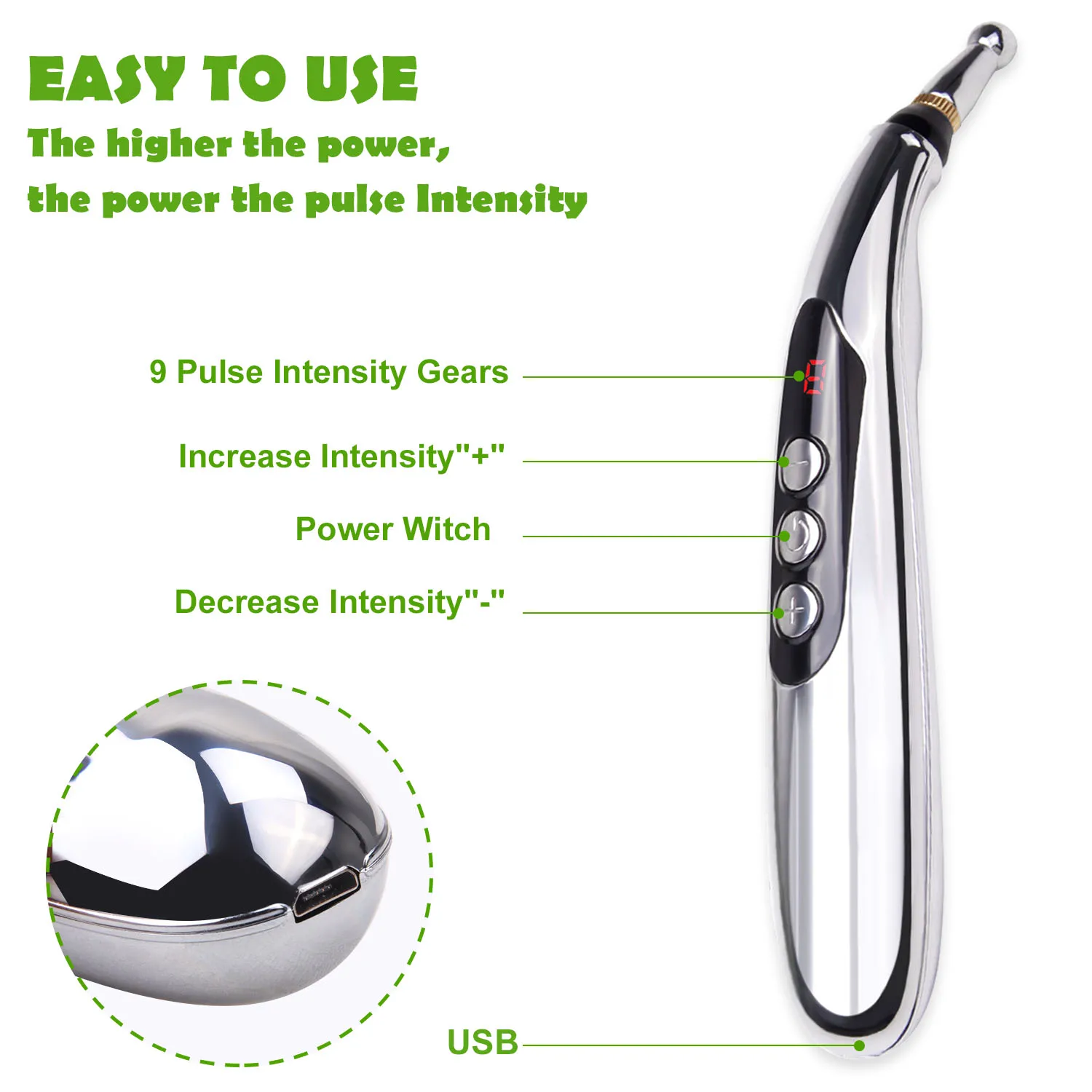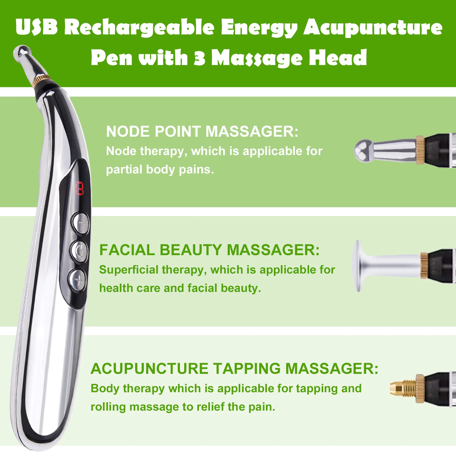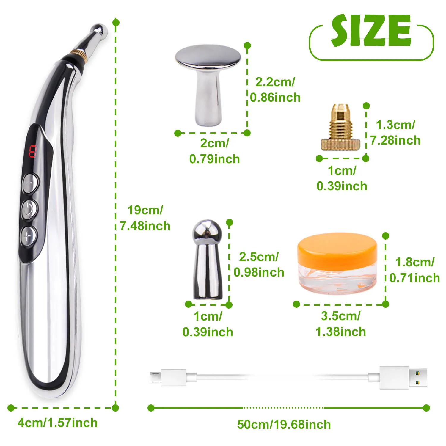 Ручка для иглоукалывания USB перезаряжаемая электронная иглоукалывание меридиан терапевтическая машина Массажер для облегчения боли инструменты с 3 массажными головкамиПодробности:С нашим машинка для иглоукалывания вы получите преимущества Акупунктурной Терапии комфортного проживания вашего дома без иголки и без боли.Просто прижмите ручку к пораженным участкам и она выпустит электрический пульс, чтобы стимулировать Меридиан и акупунктурные точки в вашем теле для заживления и облегчения боли.Наш электрический акупунктурный инструмент поставляется с 3 уникальными головками и имеет 9 регулируемых уровней интенсивности, чтобы удовлетворить ваши различные потребности.Самое главное, что нужно знать о acupoints, поэтому эта ручка поставляется с руководством пользователя, которое имеет несколько диаграмм о терапевтических точках тела, чтобы показать, где использовать ручку.При частом использовании этого электронного массажера для спины вы сможете уменьшить боль, повысить настроение, расслабиться, улучшить состояние кожи и предотвратить преждевременное старение.5 уникальных головок:1. Сферический массажер: для быстрого облегчения боли2. Точечный массажер: для боли в теле3. Массажер для красоты лица: для здоровья и красоты лицаКак использовать:(Мы рекомендуем попробовать сначала с более толстой части ладони, и лучше адаптироваться с 1 уровня)1. Включите устройство, нажав кнопку питания, на дисплее должен появиться номер "0"2. Нанесите небольшое количество контактного геля на кожу. (Использование контактного геля во время использования может уменьшить дискомфорт, вы также можете использовать массажное масло или лосьон вместо)3. Нажмите и сдвиньте кончик вокруг общей области, пока не почувствуете сильный пульс. Вы можете держать акууказку непосредственно на точку или мягко массировать точку.4. Удерживайте кнопку питания в течение 2-3 секунд, чтобы выключить питаниеОбратите внимание, что меридиановая ручка и тело должны создать тело с микро-током, которое является основой работы, например:1. Лично удерживайте меридиановую ручку, поместите наконечник в болезненное положение вашего тела, облегчите боль для себя2. Когда вы помогаете другу использовать, держите меридиановую ручку в одной руке, кончик ручки помещается в болевое положение тела вашего друга, А другая рука должна быть помещена на тело друга, чтобы установить микро-ток тока петли телаПожалуйста, обратите внимание:1. Так как эта ручка использует вашу руку в качестве наземного полюса для завершения цепи, так что есть небольшое позиционирование, вы можете почувствовать легкий Электрический шок. Это потому, что в руке много острых точек. Просто вы должны слегка изменить сцепление или захватить устройство с большей поверхностью вашей руки, чтобы рассеять эффект2. Явление, как «Электрическая утечка, электрическое онемение, электрическая стимуляция» электронной акупунктурной ручки, как описано выше, не является проблемой качества, но ее Принцип лечения3. В процессе возврата, в зависимости от размера сопротивления рук, сила, которую вы чувствуете, будет немного отличаться. Некоторые люди (молодые/здоровые) чувствуют себя более сильными, а некоторые (пожилые люди или плохое здоровье) будут чувствовать себя слабыми4. Если статическое электричество в организме человека слиш