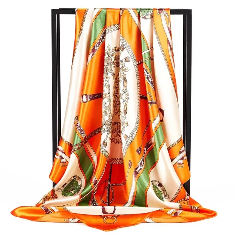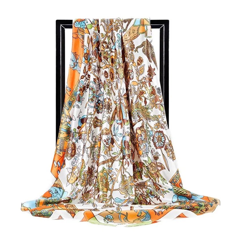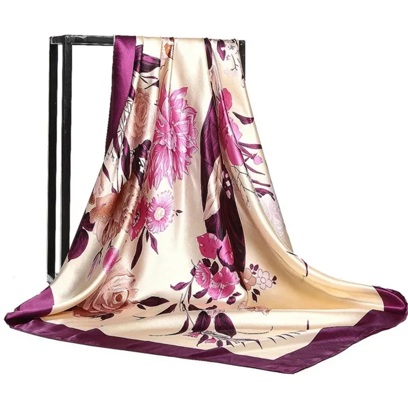 Женская атласная шаль с цветочным принтом, квадратный платок 90 х90 см, шелковый шарф хиджаб