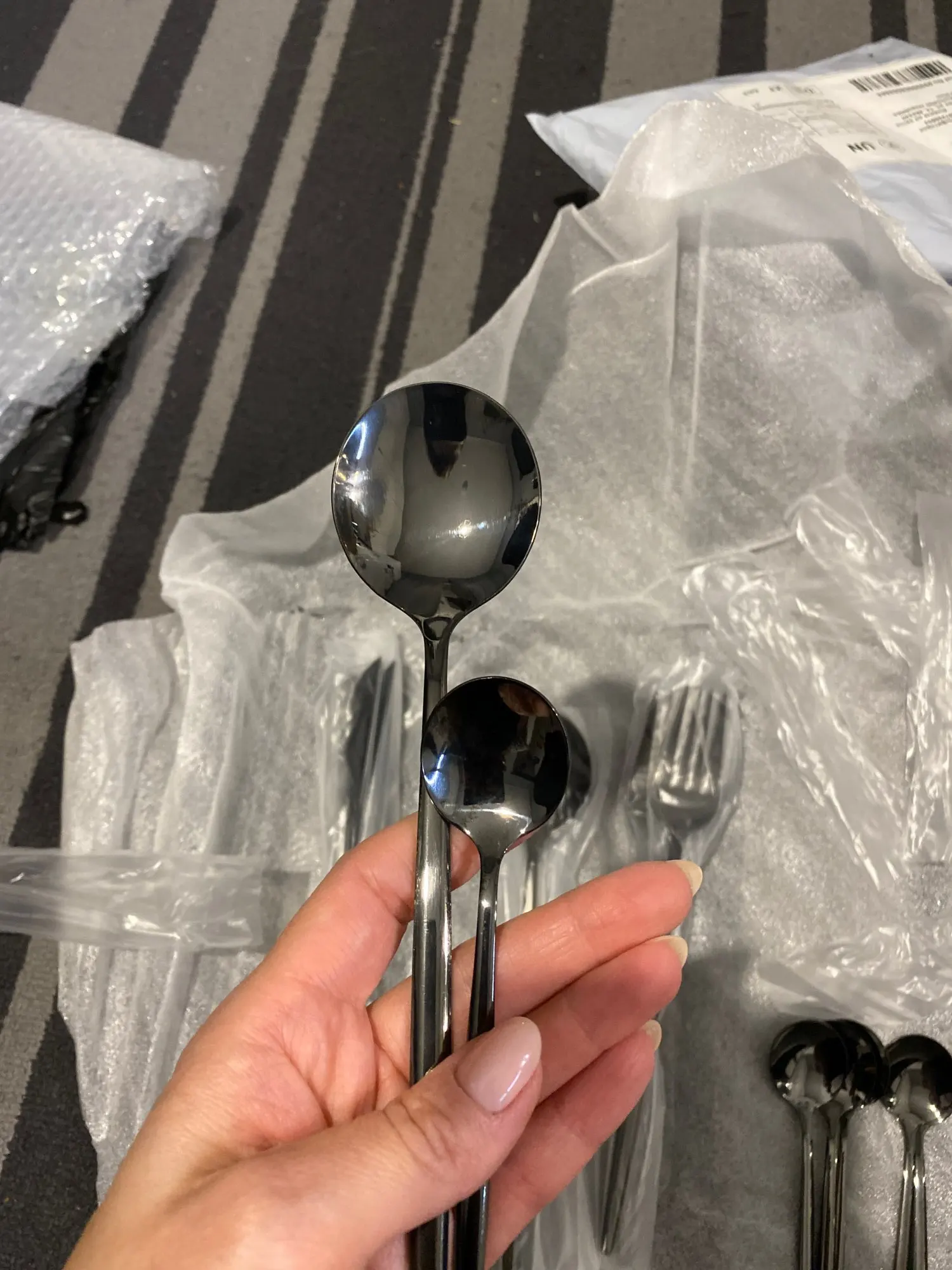 Долгожданная моя посылка. Сразу было понятно, что это именно набор в посылке, так как очень тяжелый. Очень рада, что пришли без сколов все 24 штуки. Сразу засунула в посудомойку сначала 4 (по одному каждого), все идеально хорошо, теперь все 24 стираются Из ложки поела суп уже, думала, что будет неудобно, но все хорошо. В общем советую всем, набор огонь! Надеюсь долго прослужит)) с продавцом не общалась за ненадобностью)