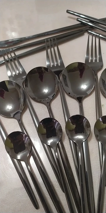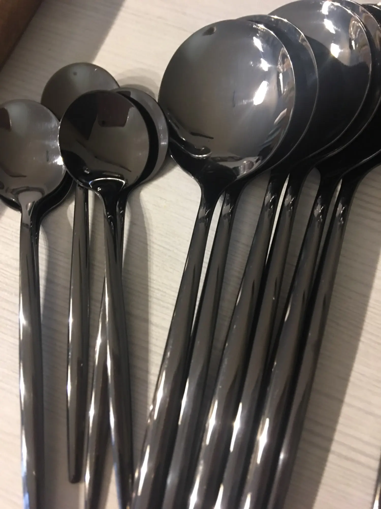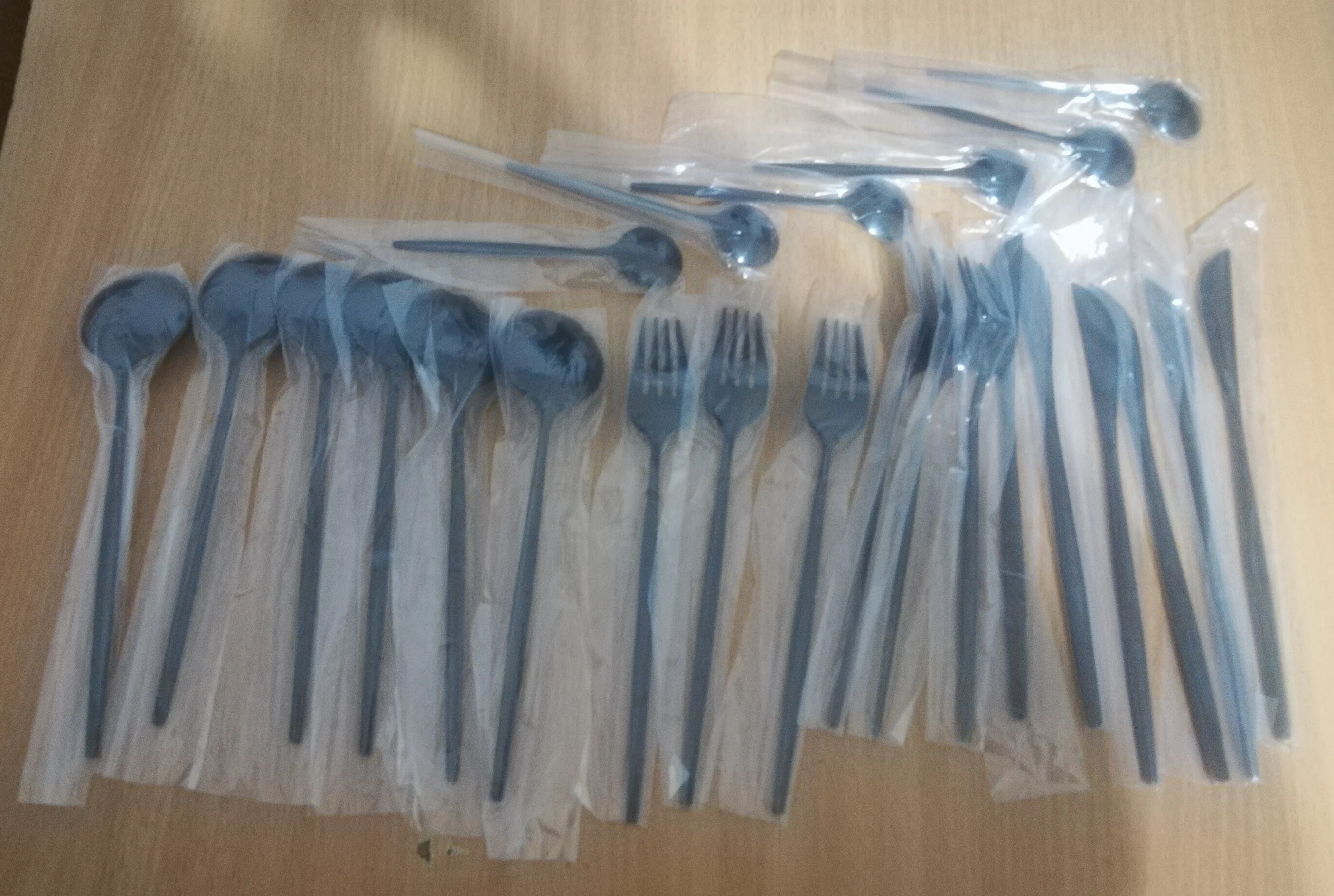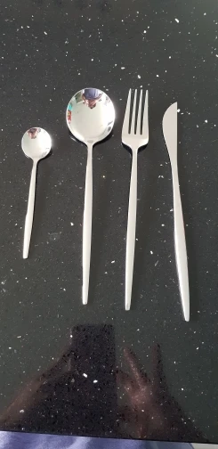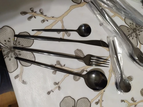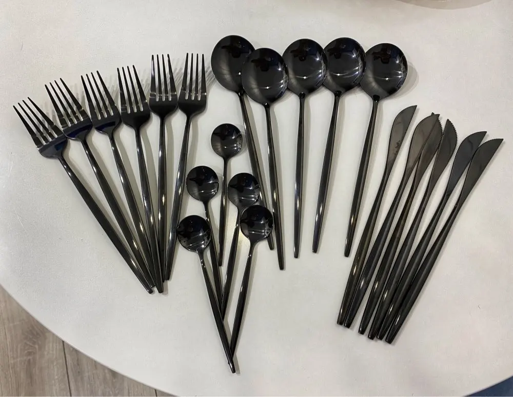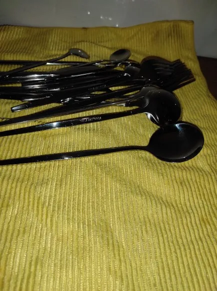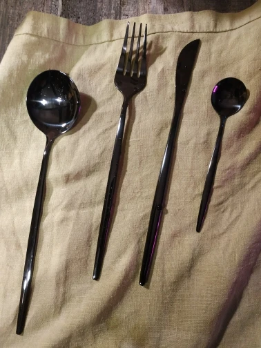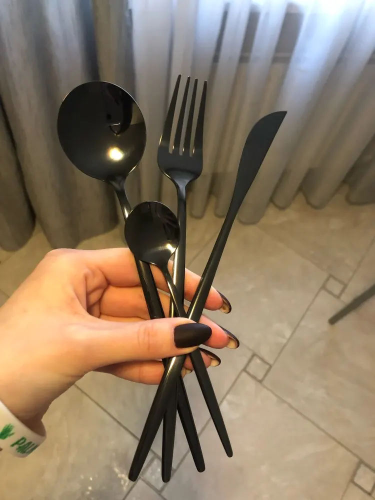 Приборы пришли за 25 дней из Китая. Выглядят современно, но довольно легкие и плоские ручки, хотя в отзывах пишут что увесистые. Для любителей тяжелых и обьемных приборов точно не сюда. "Черные" по сути цвет графит, то есть темно серый глянец. Найдены пару мелких сколов на большой ложке и вилке. За эту цену норм.