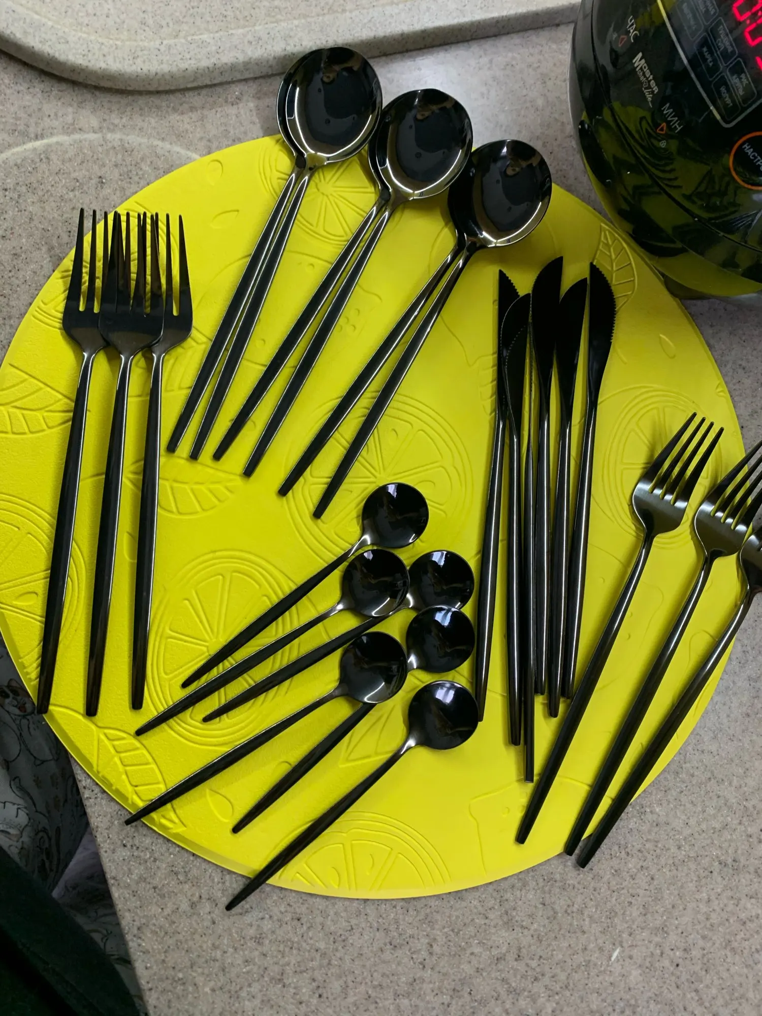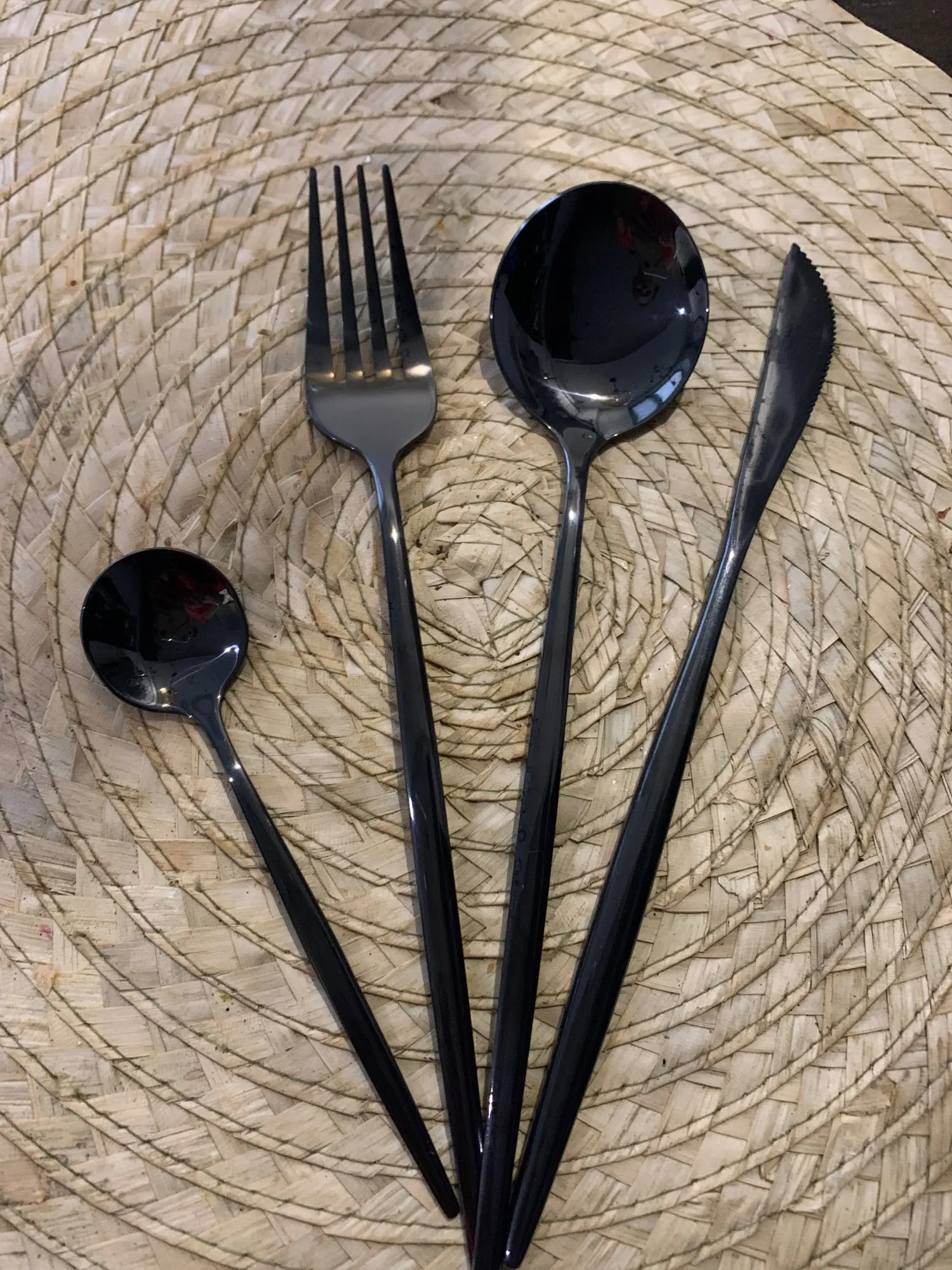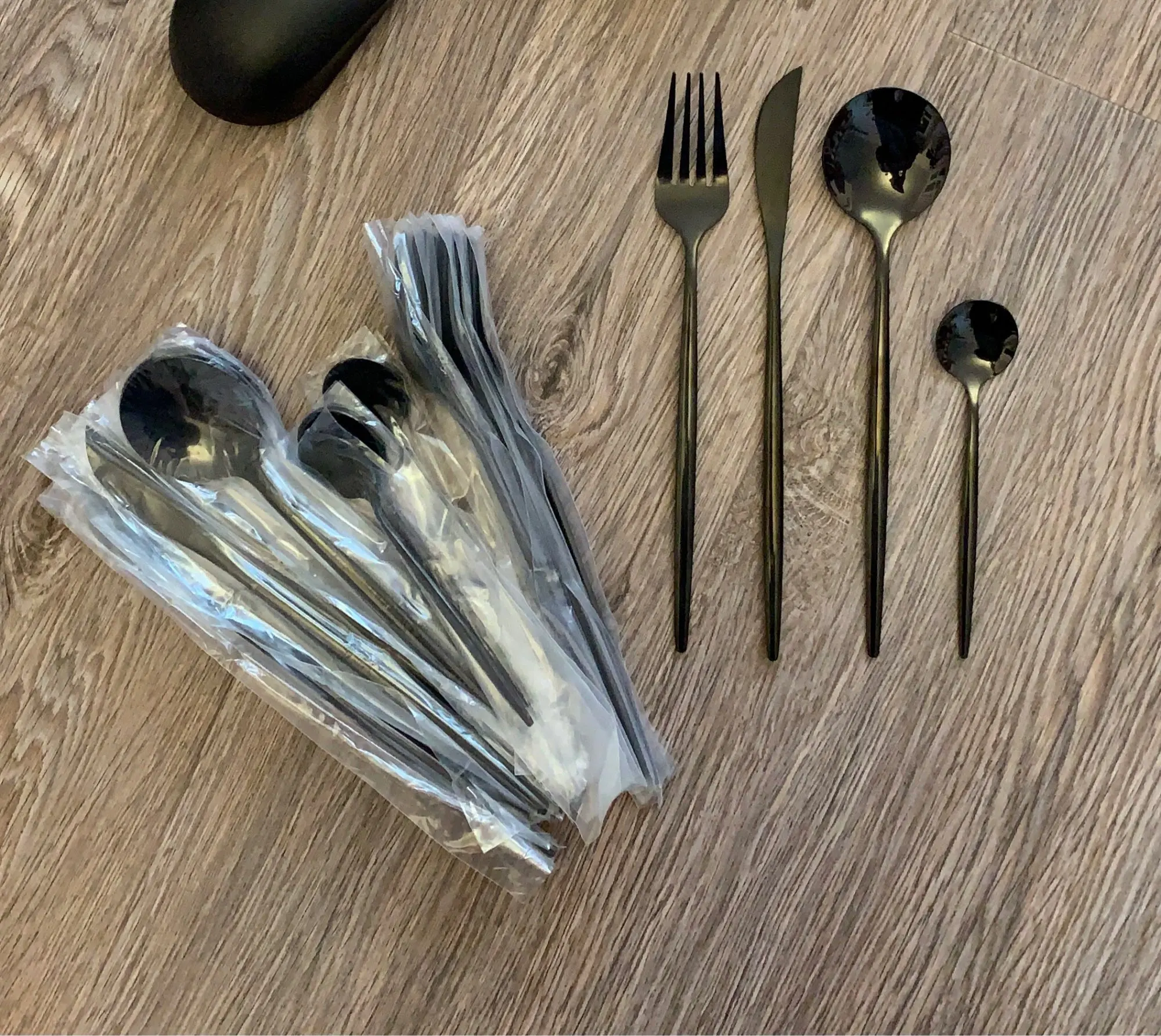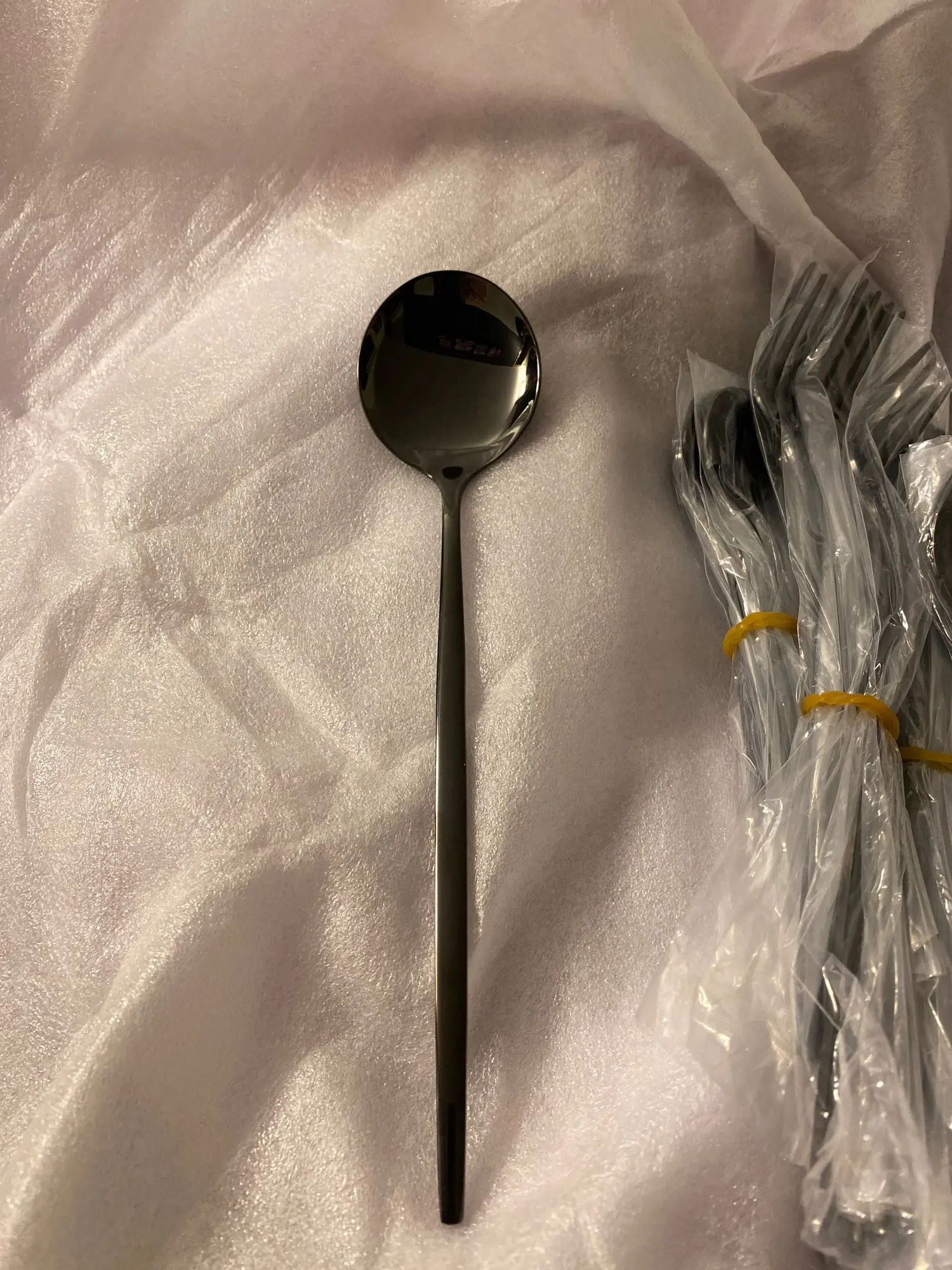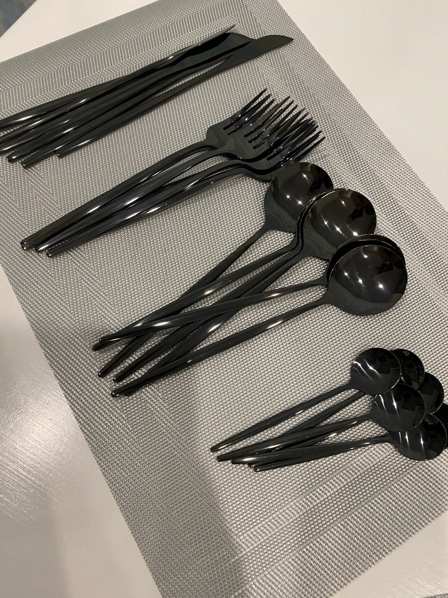 Приборы пришли за 25 дней из Китая. Выглядят современно, но довольно легкие и плоские ручки, хотя в отзывах пишут что увесистые. Для любителей тяжелых и обьемных приборов точно не сюда. "Черные" по сути цвет графит, то есть темно серый глянец. Найдены пару мелких сколов на большой ложке и вилке. За эту цену норм.