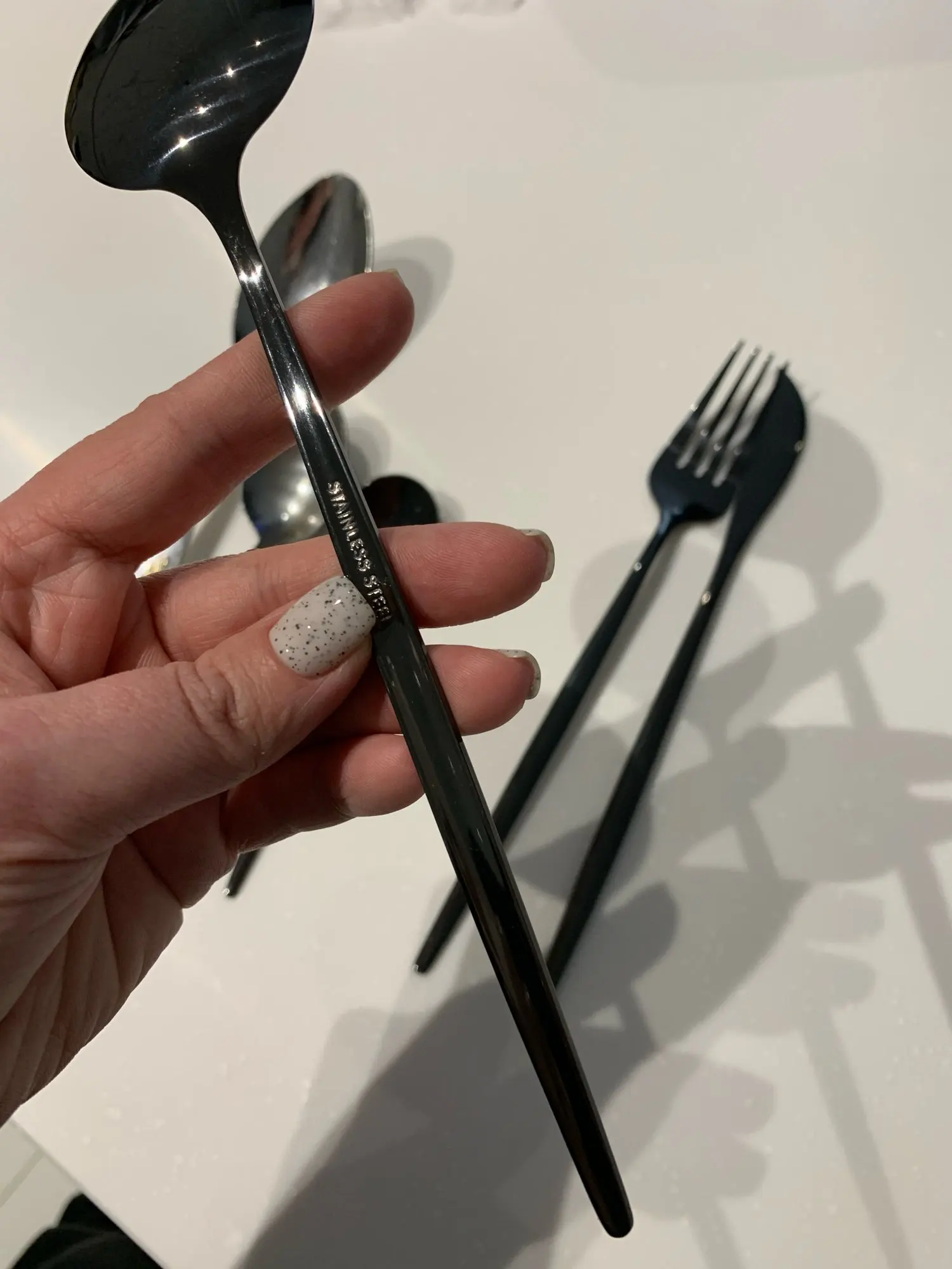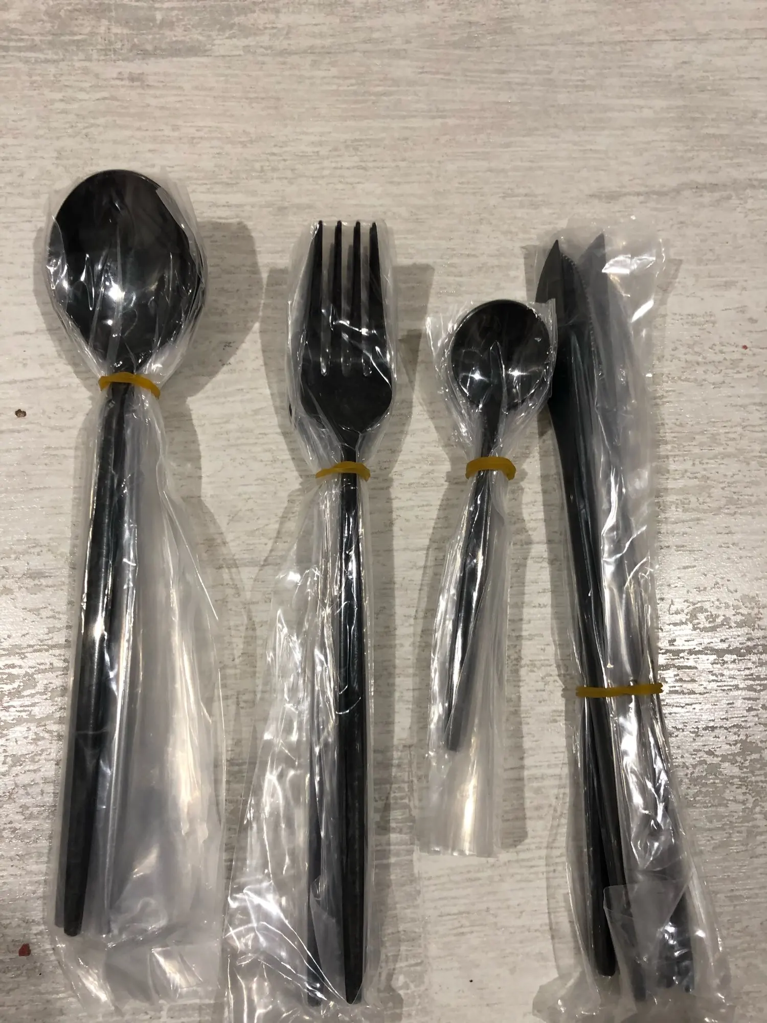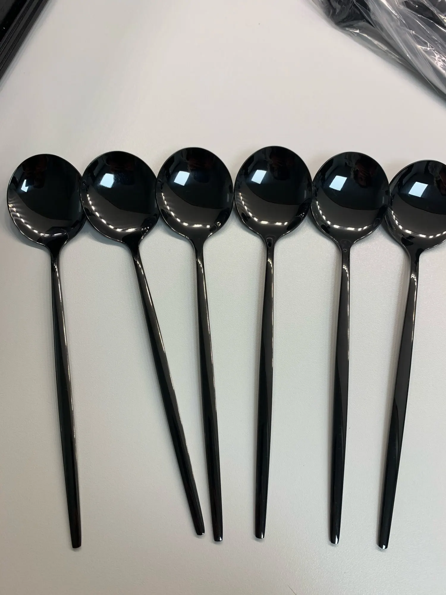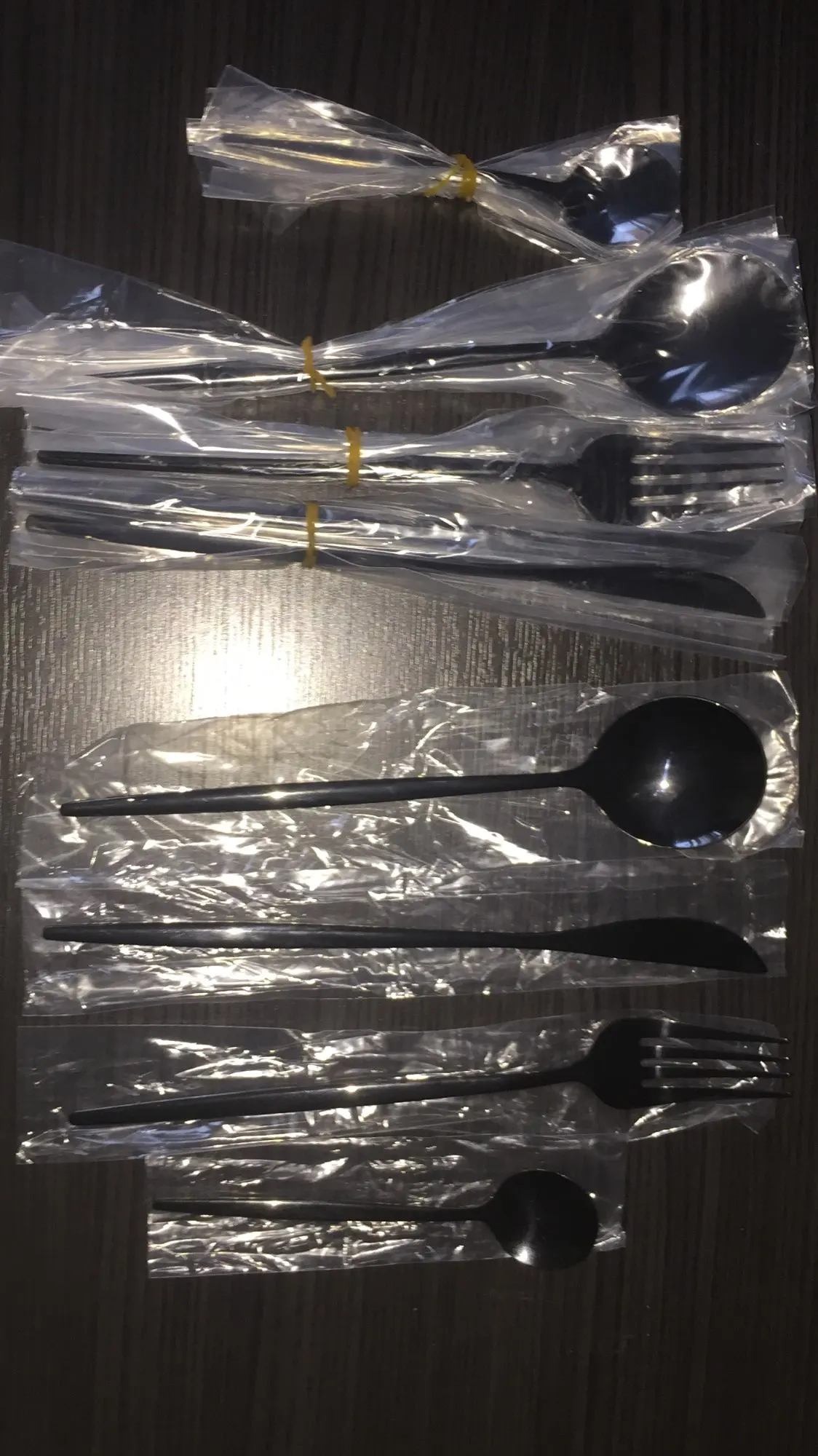 Приборы пришли за 25 дней из Китая. Выглядят современно, но довольно легкие и плоские ручки, хотя в отзывах пишут что увесистые. Для любителей тяжелых и обьемных приборов точно не сюда. "Черные" по сути цвет графит, то есть темно серый глянец. Найдены пару мелких сколов на большой ложке и вилке. За эту цену норм.
