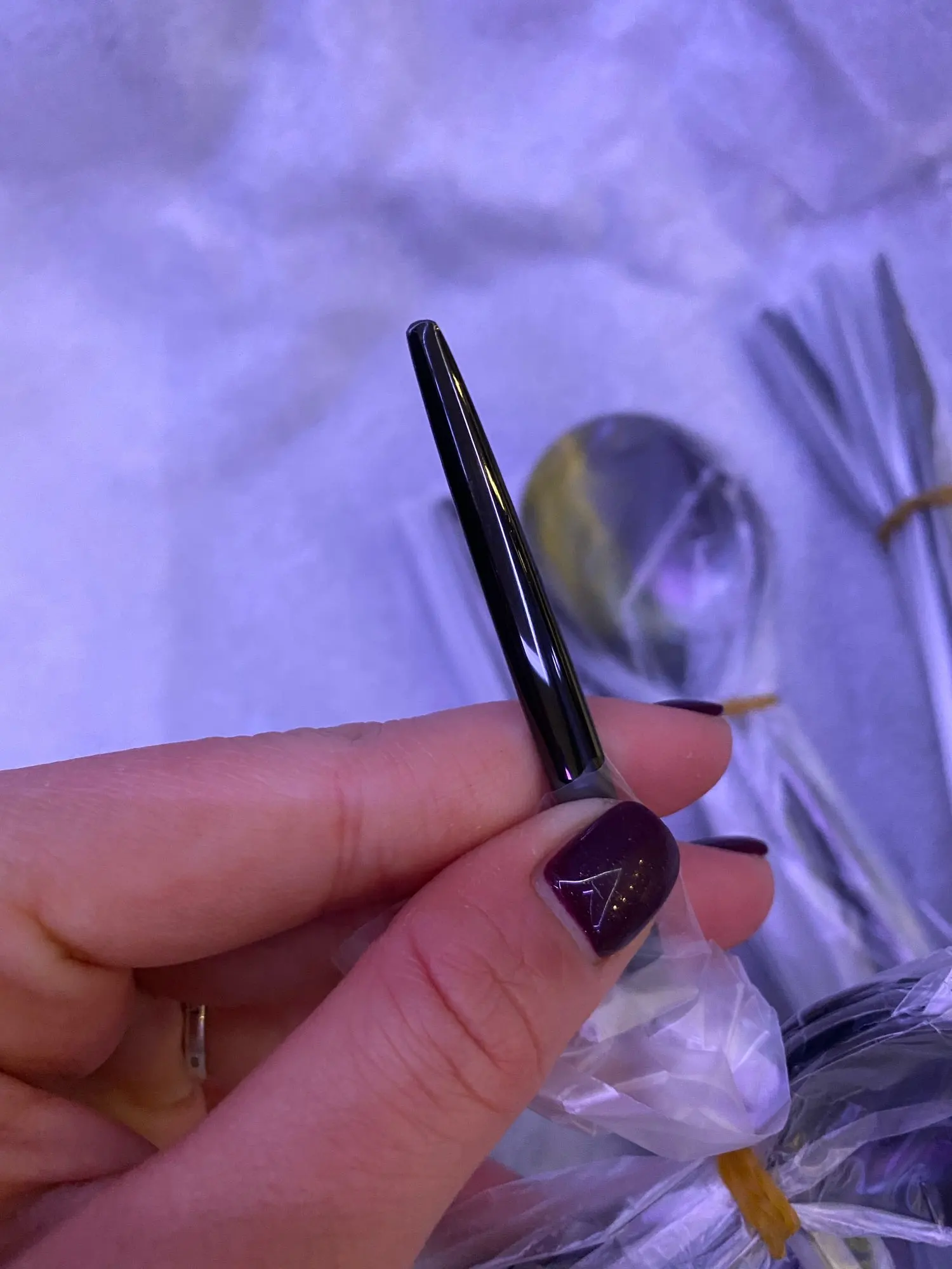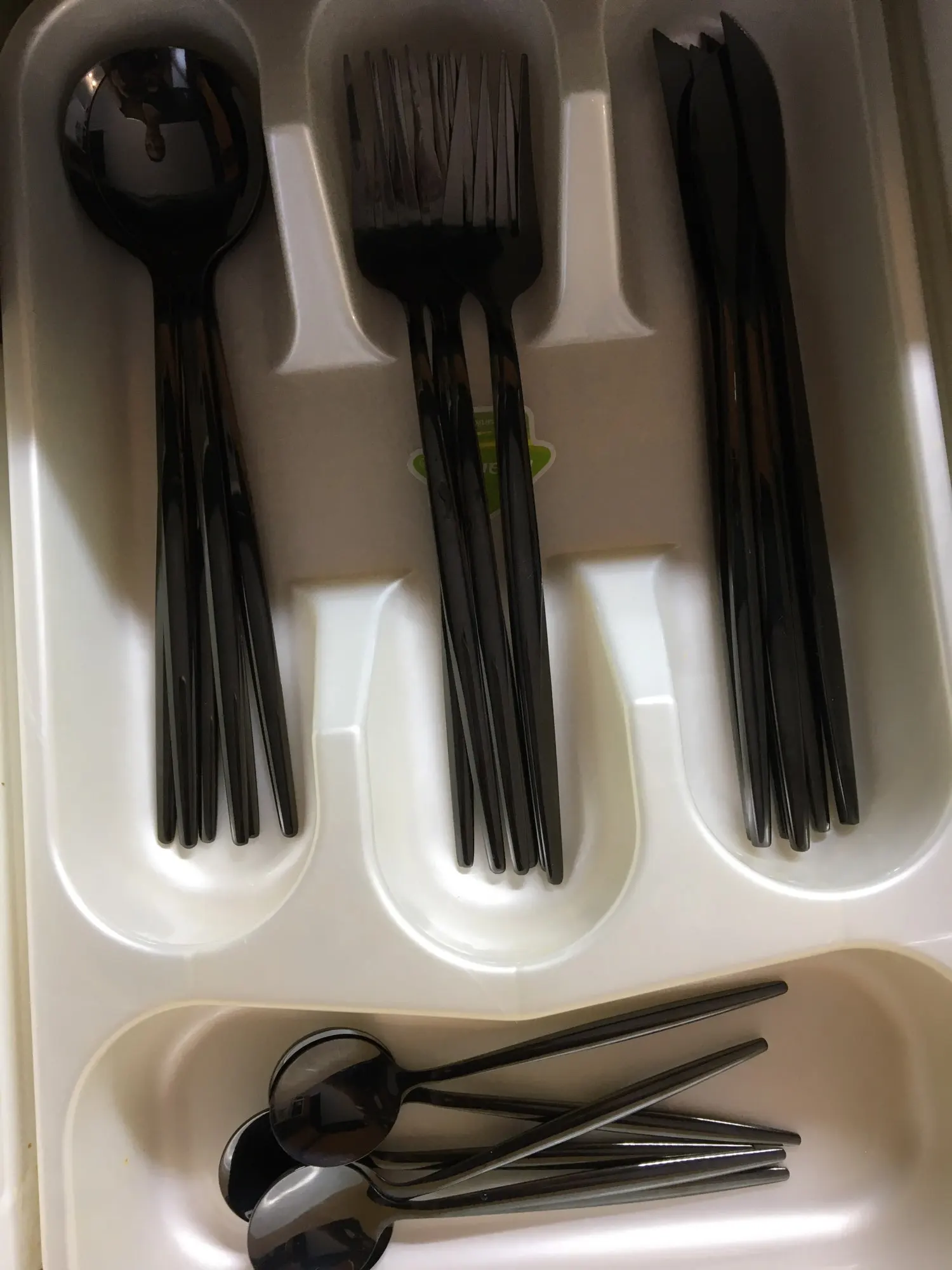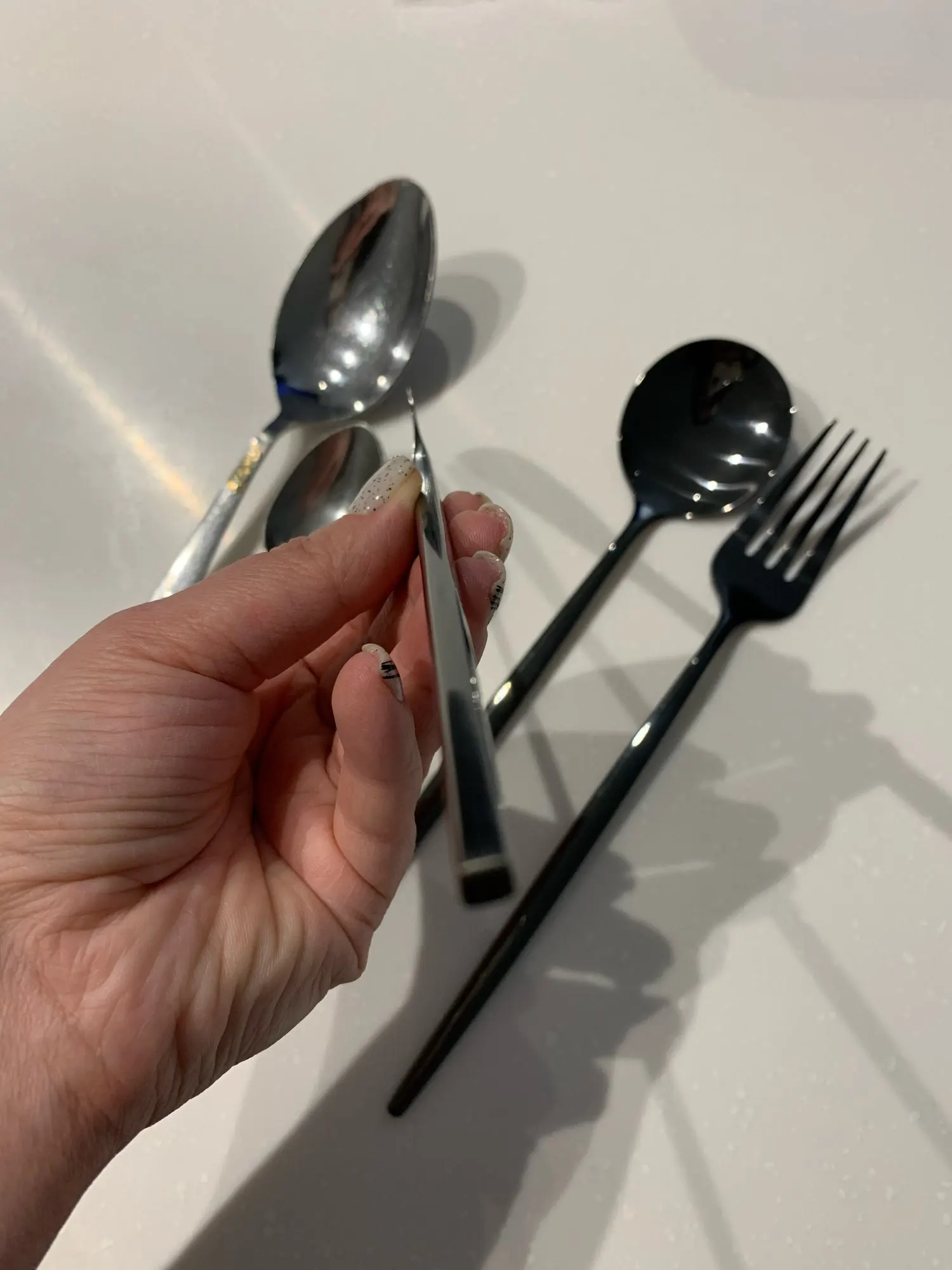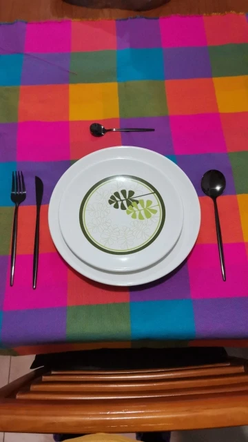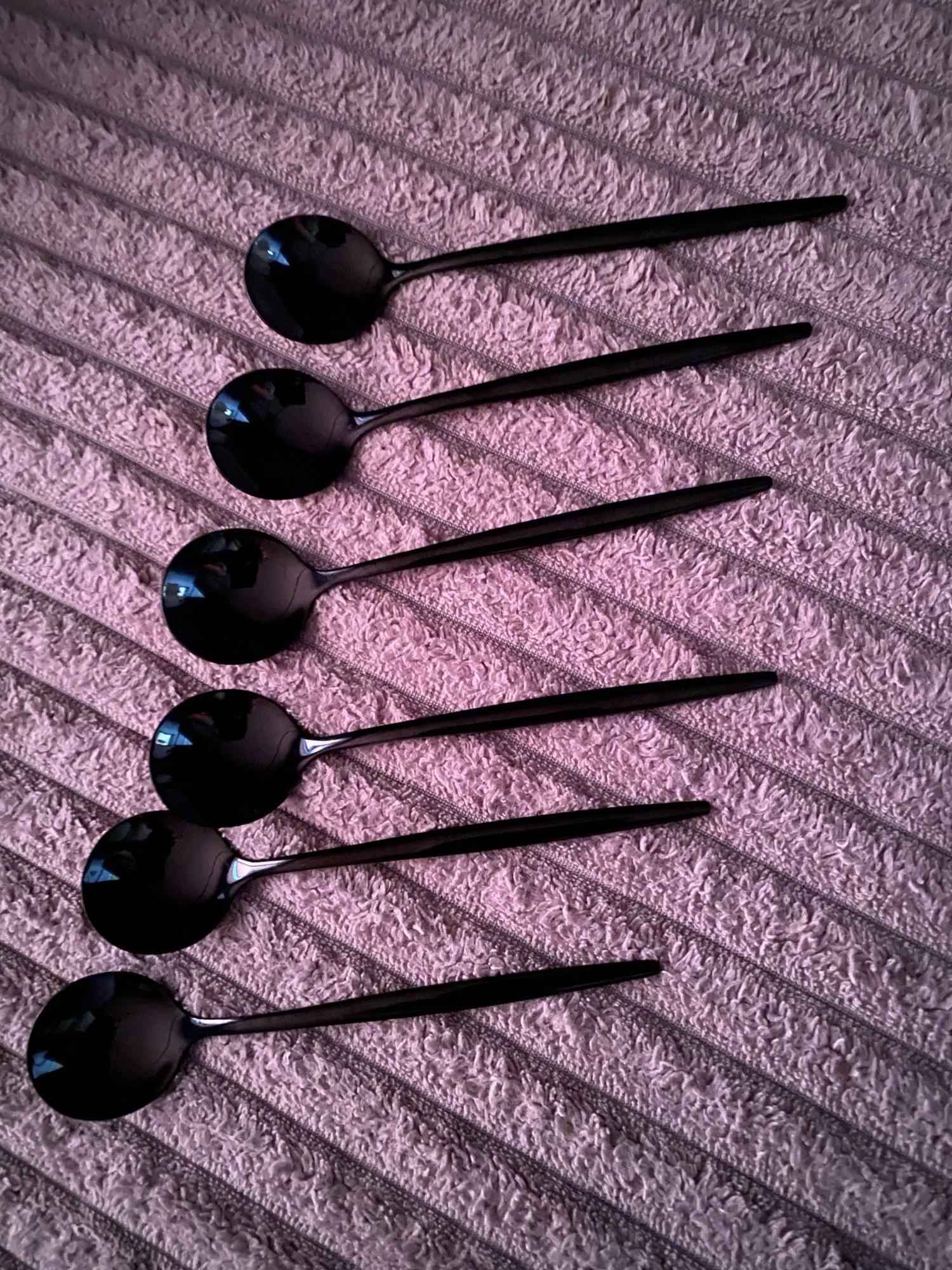 Приборы пришли за 25 дней из Китая. Выглядят современно, но довольно легкие и плоские ручки, хотя в отзывах пишут что увесистые. Для любителей тяжелых и обьемных приборов точно не сюда. "Черные" по сути цвет графит, то есть темно серый глянец. Найдены пару мелких сколов на большой ложке и вилке. За эту цену норм.