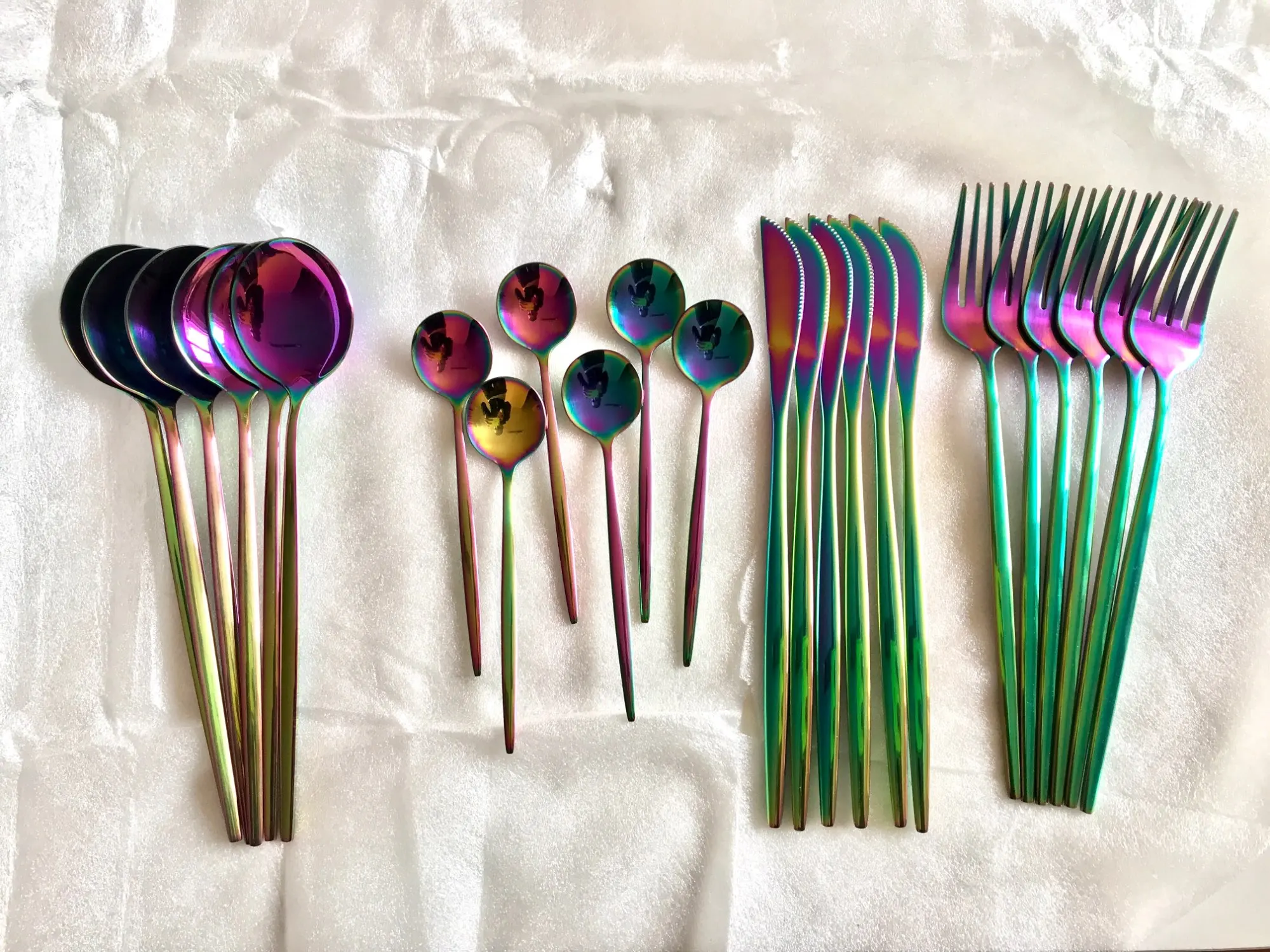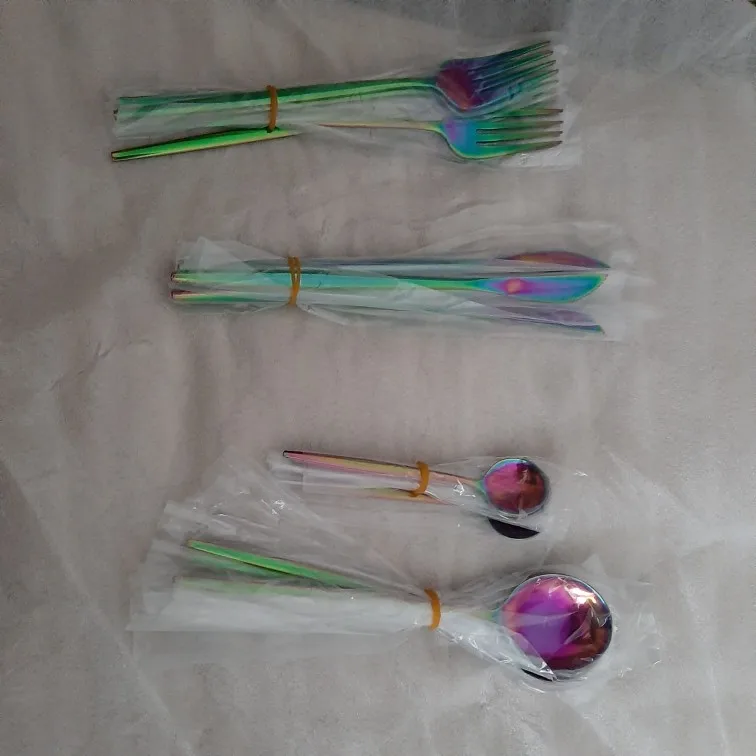 Набор сам по себе прикольный, удобный, но мне пришли приборы разного качества, ножи отличные, тяжёлые, а вот вилки и ложки, лёгкие, ручки на половину сзади срезаны и ещё с дефектом, единственное продавец хороший, с первого раза не то заказала, он сам на меня вышел, уточнил, что мне нужно, отменил неправильный заказ и на таможне с первого раза не прошёл.... Пришёл товар, но качество так себе, открыла спор, стоил 1600р,запросила 600р,пролавец сразу одобрил и через 3 дня деньги перечислили