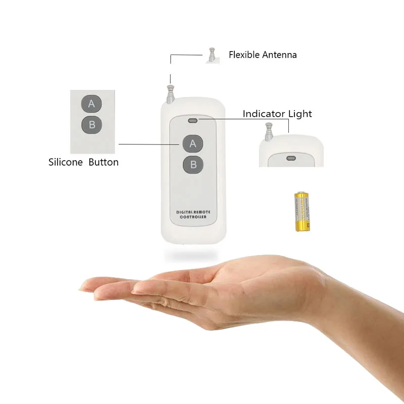 Область применения продукта Продукты могут быть использованы в домах, фермах, фабриках, офисах, лабораториях, супермаркетах и так далее. Электрический занавес с дистанционным управлением \ водяной насос \ вентилятор \ лампа \ светодиодный светильник \ лампа \ вентиляционное устройство \ передача сигнала Мотор с дистанционным управлением положительное и отрицательное вращение переключатель двигателя сделай сам Если у вас есть какие-либо вопросы, пожалуйста, свяжитесь с нами. Программирование Плата приемника реле имеет 3 режима работы, вы можете программировать по вашему запросу. -1. Мгновенный режим: Описание: Нажмите и удерживайте кнопку «A», реле включится; Отпустите кнопку, это реле выключится. Программа: 1. Нажмите кнопку обучения (на приемнике)Один раз. Подождите 3 секунды; 2. Нажмите одну кнопку на пульте дистанционного управления. Подождите 3 секунды. Преуспевает. -2. Режим переключения: Описание: нажмите кнопку «A», реле включится; Нажмите кнопку «A» снова, это реле выключится. Программа: 1. Нажмите кнопку обучения (на приемнике)Дважды. Подождите 3 секунды; 2. Нажмите одну кнопку на пульте дистанционного управления. Подождите 3 секунды. Преуспевает. -3. Режим блокировки: Описание: нажмите кнопку «A», реле включится; Нажмите кнопку «B», это реле выключится. Программа: 1. Нажмите кнопку обучения (на приемнике)Тройной. Подождите 3 секунды; 2. Нажмите кнопку «A» на пульте дистанционного управления. Подождите 3 секунды. 3. Нажмите кнопку "B" на пульте дистанционного управления. Подождите 3 секунды. Преуспевает. Примечание: сбросьте приемник, прежде чем вы захотите изменить режим работы одного пульта дистанционного управления. -Сброс: Нажмите кнопку обучения (на приемнике)8 раз. Существующие данные будут удалены успешно. Примечание: 1. После сброса все пульты дистанционного управления больше не могут работать. 2. Перед использованием платы релейного приемника, пожалуйста, слегка растяните антенну на ней, чтобы увеличить диапазон приема сигнала.