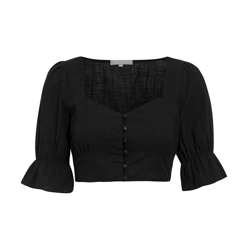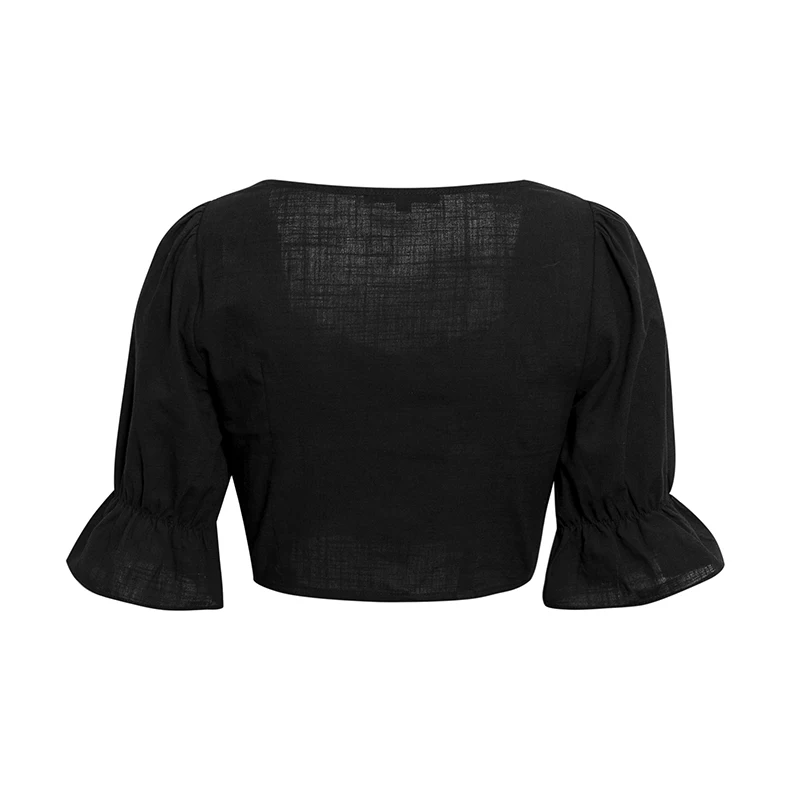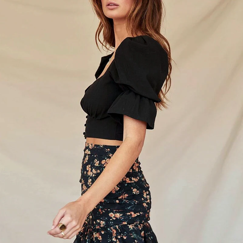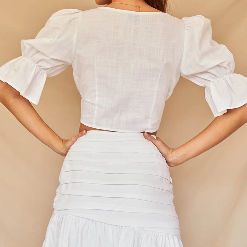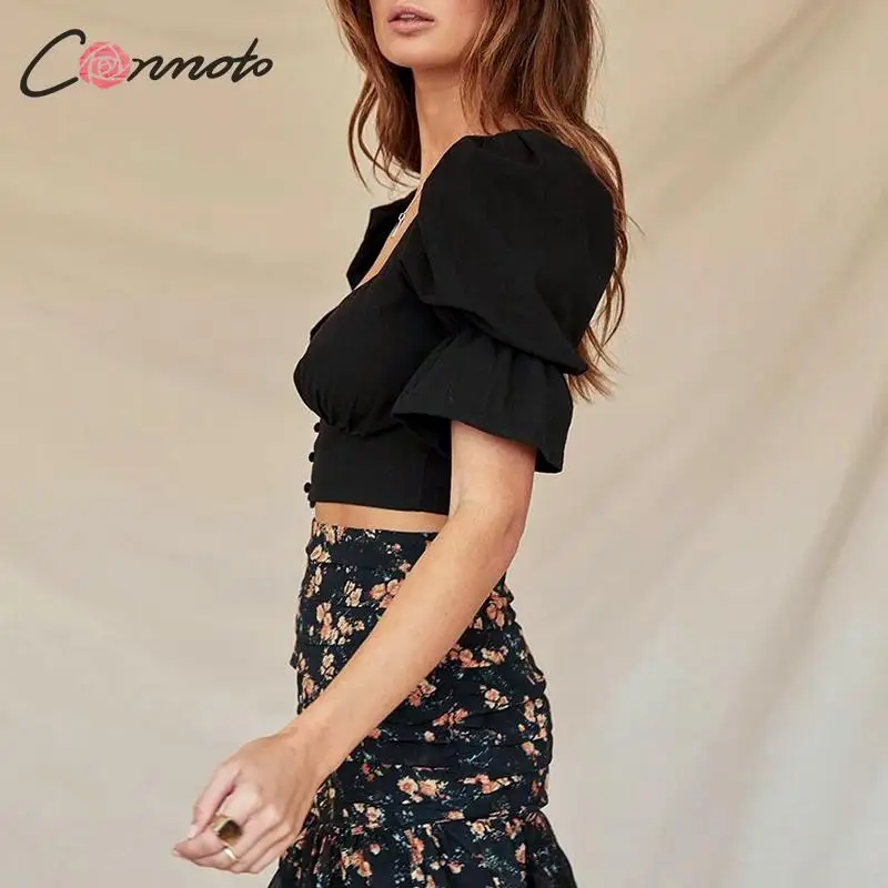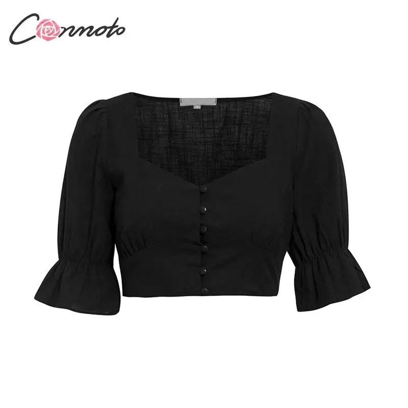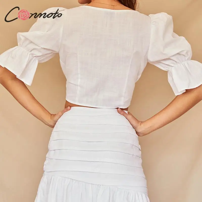 Conmoto оборками пикантная винтажная блузка женская Однотонная футболка на пуговицах, для девочек, белая блузка, рубашки Клубные пляжные буфами на рукавах Весна-осень blusas mujer