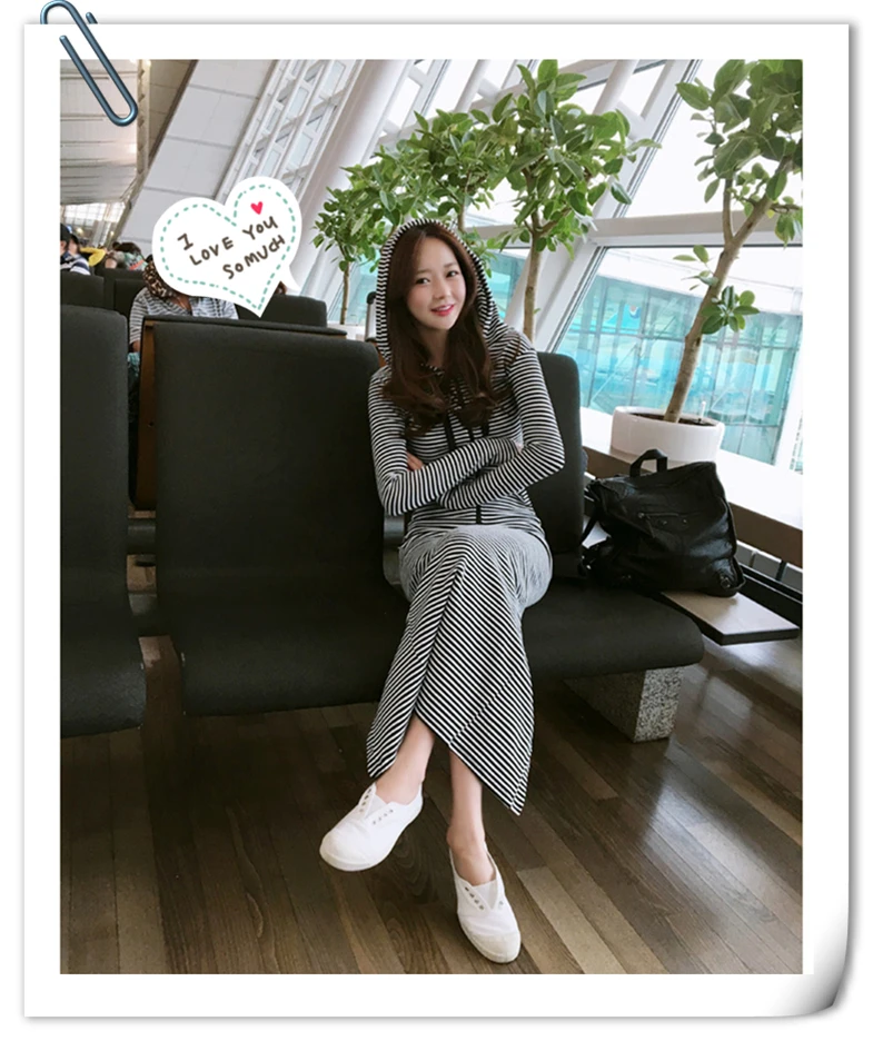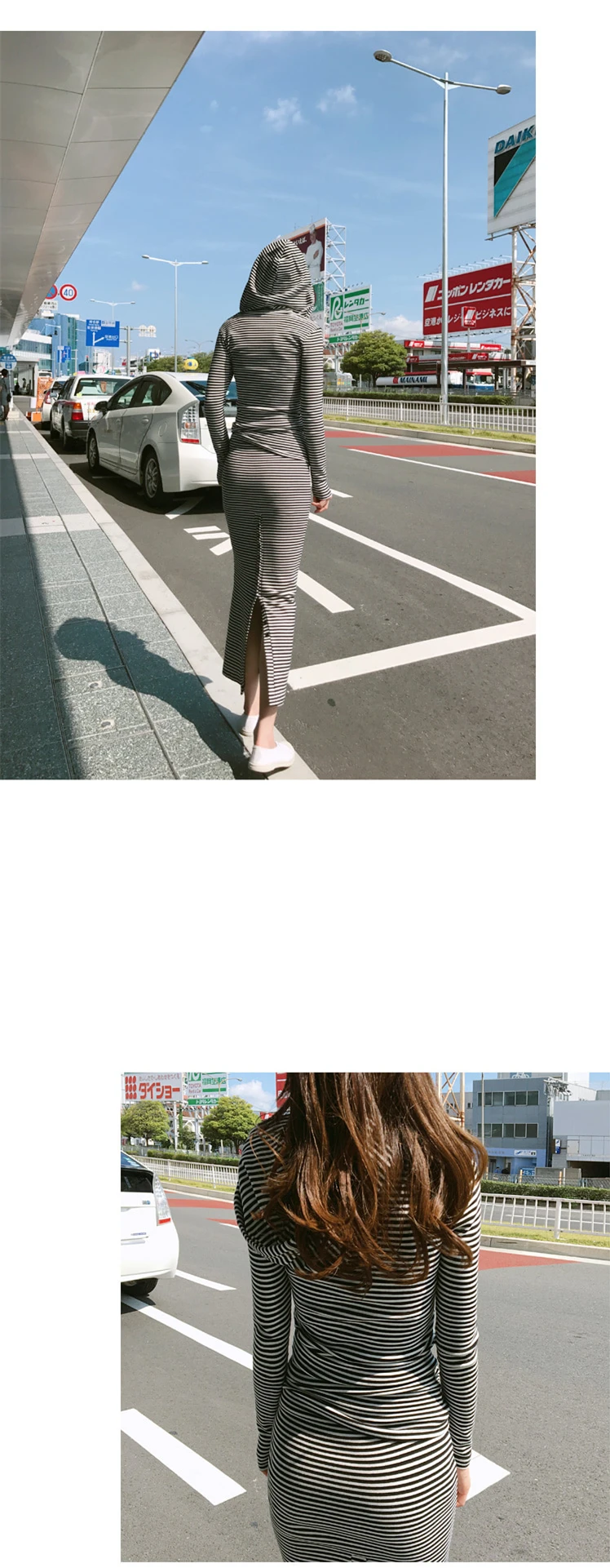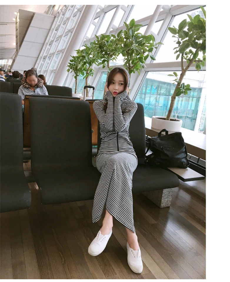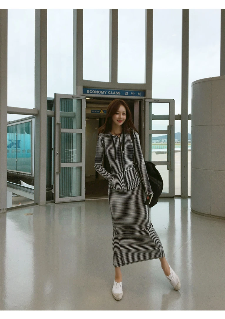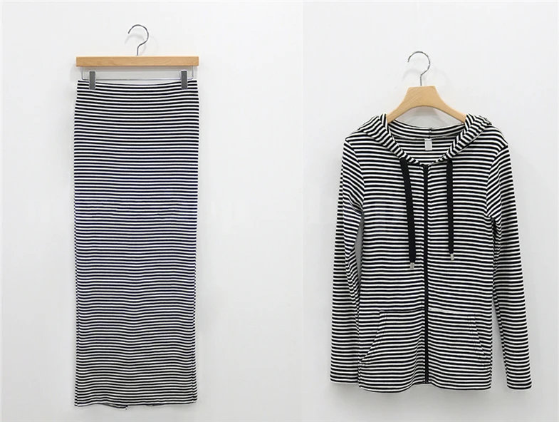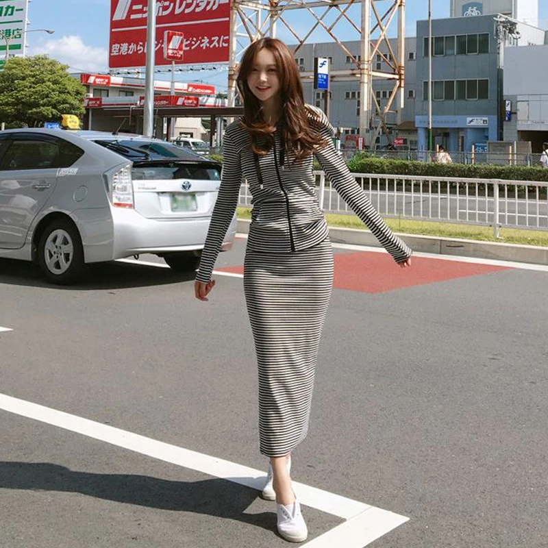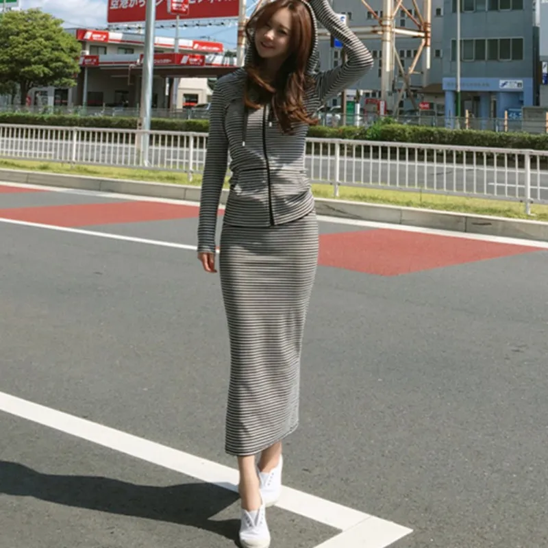 Комплект Спортивный женский из 2 предметов, Модный свитшот в полоску с длинным рукавом и капюшоном и длинная юбка-карандаш с завышенной талией, Повседневный, весна-осень