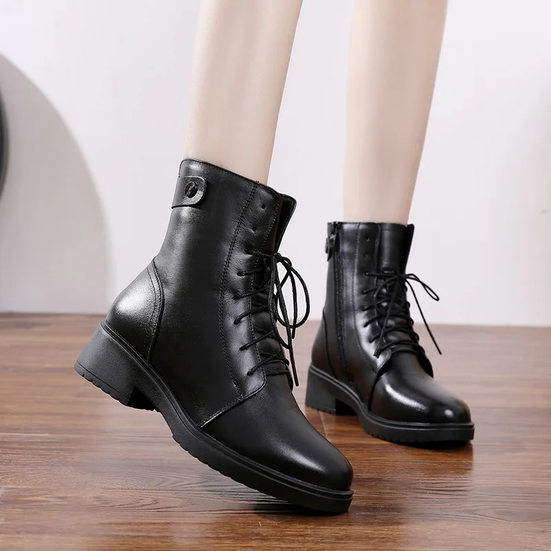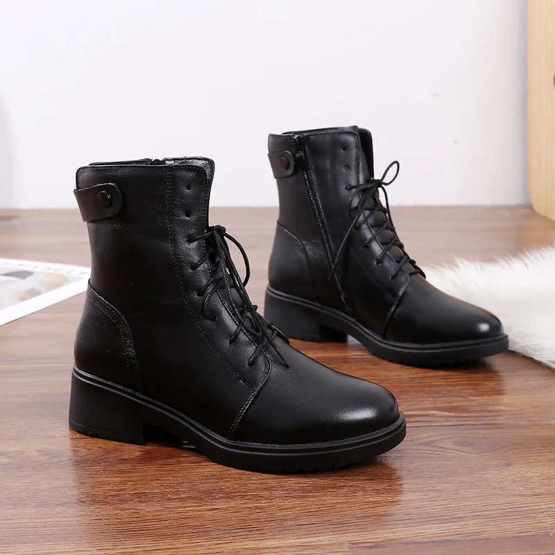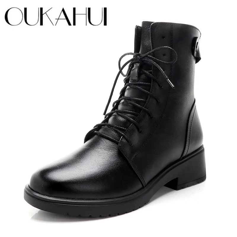 Женские теплые ботинки-мартинсы OUKAHUI, черные Повседневные Плюшевые ботинки из натуральной кожи на среднем каблуке 4,5 см, со шнуровкой, Размеры 35-43