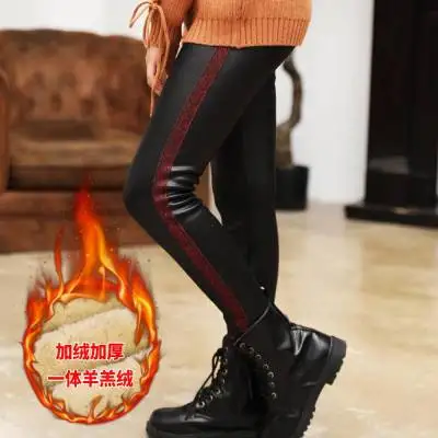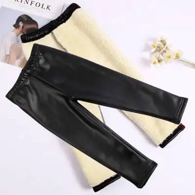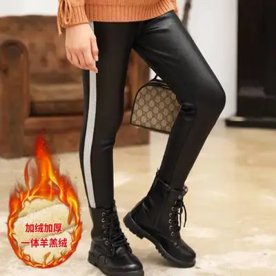 Зимние полосатые штаны из искусственной кожи для девочек, теплые флисовые детские леггинсы для девочек, повседневные теплые детские кожаные леггинсы из овечьей шерсти для девочек