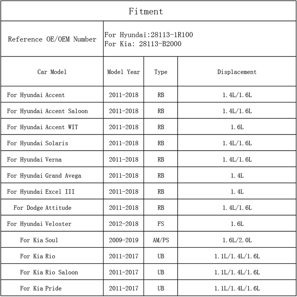 Приспособление:Для Hyundai Accent RB 2011 2012 2013 2014 2015 2016 2017 2018 1.4L 1.6LДля Hyundai Accent WIT RB 2011 2012 2013 2014 2015 2016 2017 2018 1.4L 1.6LДля Hyundai Solaris RB 2011 2012 2013 2014 2015 2016 2017 2018 1.4L 1.6LДля Hyundai Verna RB 2011 2012 2013 2014 2015 2016 2017 2018 1.4L 1.6LДля Hyundai Grand Avega RB 2011 2012 2013 2014 2015 2016 2017 2018 1.4LДля Hyundai Excel III RB 2011 2012 2013 2014 2015 2016 2017 2018 1.4LДля Hyundai Veloster FS 2012 2013 2014 2015 2016 2017 2018 1.6LДля Dodge Attitude RB 2011 2012 2013 2014 2015 2016 2017 2018 1.4L 1.6LДля Kia Soul AM PS 2009 2010 2011 2012 2013 2014 2015 2016 2017 2018 2019 1.6L 2.0LДля Kia Rio UB 2011 2012 2013 2014 2015 2016 2017 1.1L 1.4L 1.6LДля Kia Pride UB 2011 2012 2013 2014 2015 2016 2017 1.1L 1.4L 1.6L