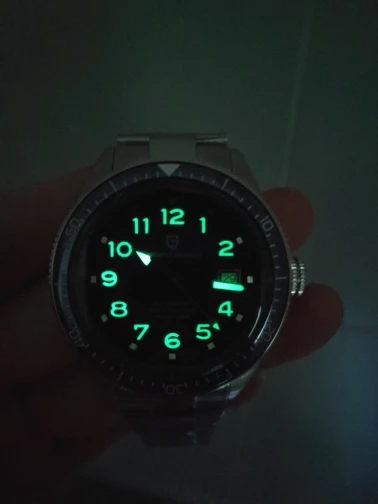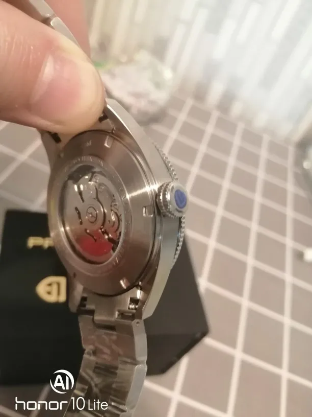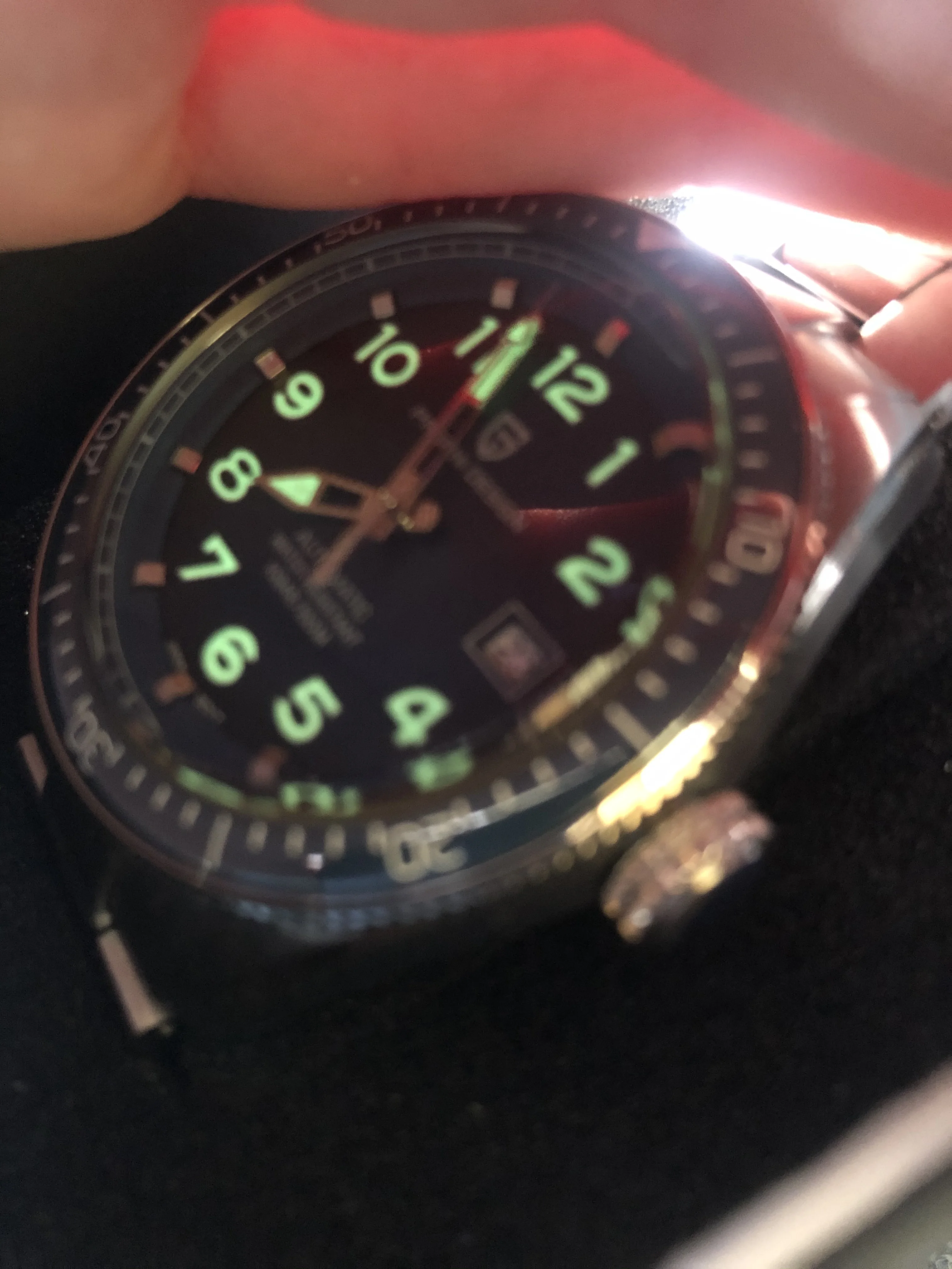Мне нравятся часы. Коробка была в прекрасном состоянии, когда она прибыла. На часах были небольшие следы белой пыли или грязи на пластике, которые защищали ее. Но я не против. ЛЮМ выглядит чистым, так же как и остальные часы. Ничего не издает забавных шумов, ротор тихий, циферблат и металлы красиво закончены. В целом, выглядит и кажется твердым и хорошим. В следующий раз попробуйте сделать более быструю доставку.