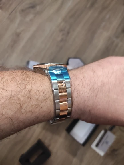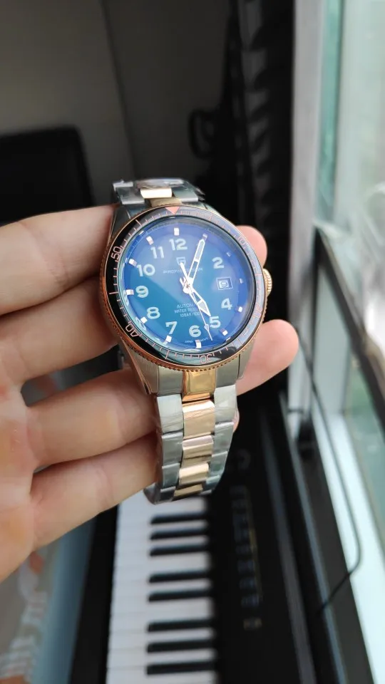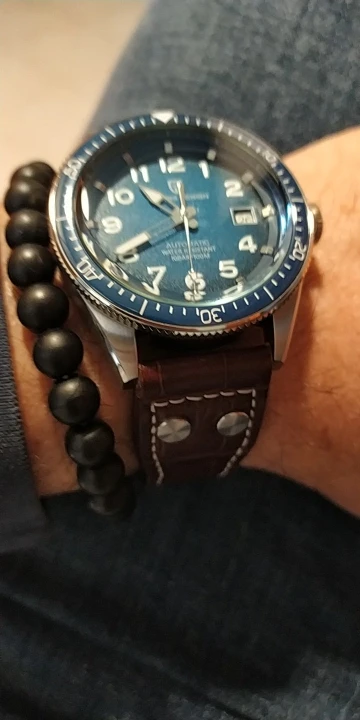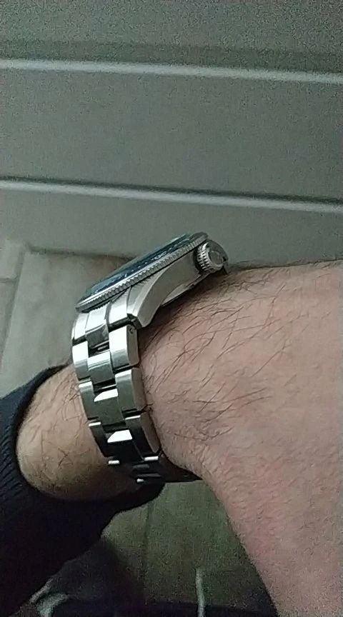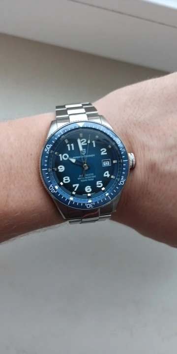 Циферблат более темно-синего цвета, чем я ожидала на основе фотографий, что является приятным сюрпризом. Эти часы выглядят фантастически с изображением AR и купольных кристаллов. Часовые маркеры мерцают, так как свет меняется. Часы не сужающиеся книзу. Чехол толстый, как и браслет. ЛЮМ равномерно нанесен, но не слишком яркий. Застежка не запирается и не открывается так чисто, как мне бы хотелось. Действие ободка не очень хорошее, но ободок выглядит красиво.