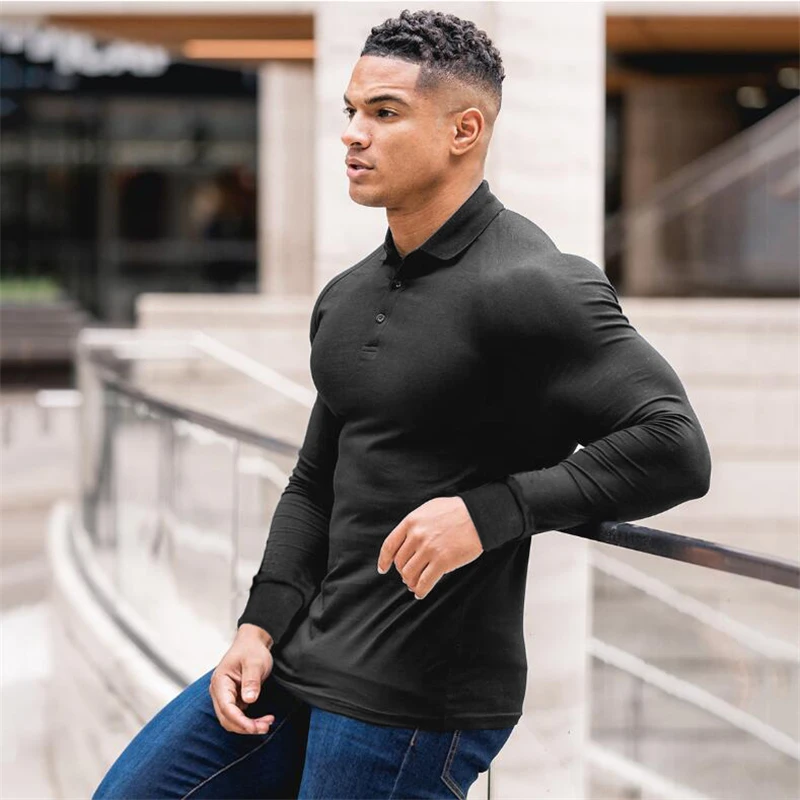 Брендовая деловая мужская рубашка-поло с длинным рукавом, Мужская Однотонная рубашка-поло для спортзала, Хлопковая мужская рубашка-поло для фитнеса, спортивная одежда, Джерси