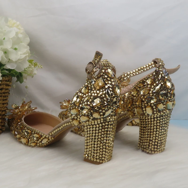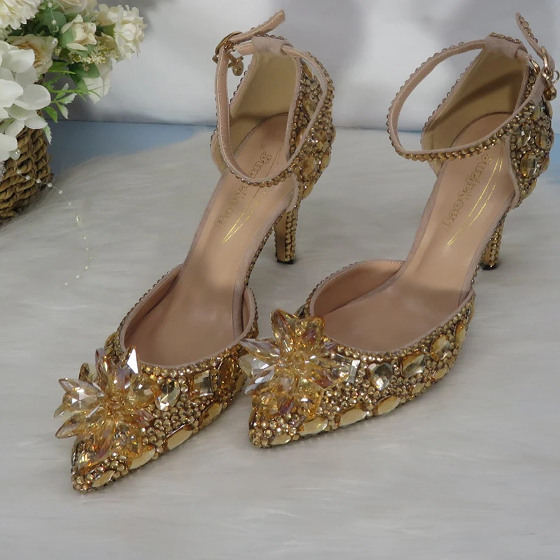 Женские свадебные туфли цвета шампанского, золотистого цвета с кристаллами; Стразы; Туфли на высоком каблуке с ремешком на щиколотке; Женские вечерние модельные туфли