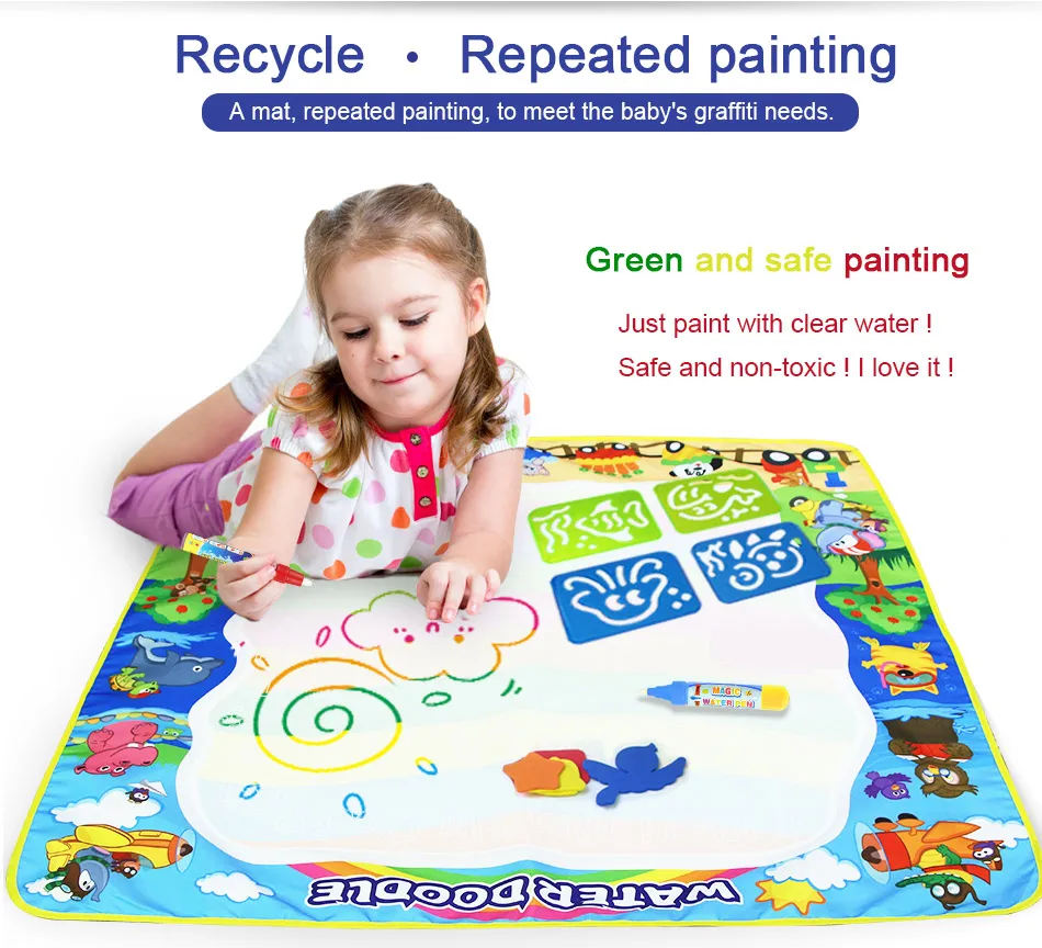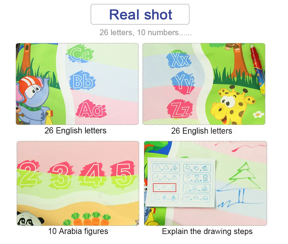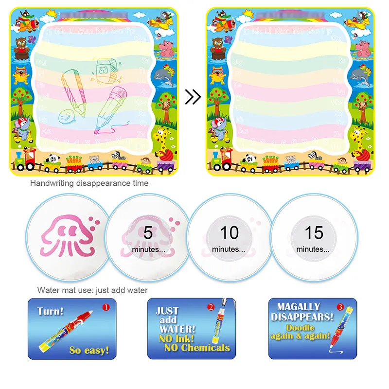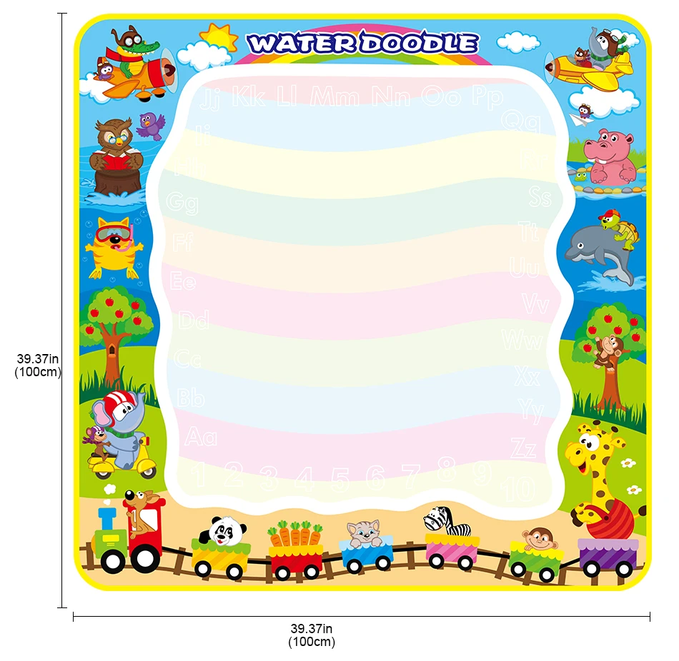Характеристика:Материал: экологически чистый, высококачественный, водонепроницаемый, без чернил, без химических веществ.Функция: образовательная, пригодная для повторного использования.Просто нужно заполнить водой, чтобы рисовать, и он исчезнет после нескольких minitus, дети могут каракули его снова и снова, родители больше не волнуйтесь беспорядок.Материал: тканьРазмер: 100x100 см