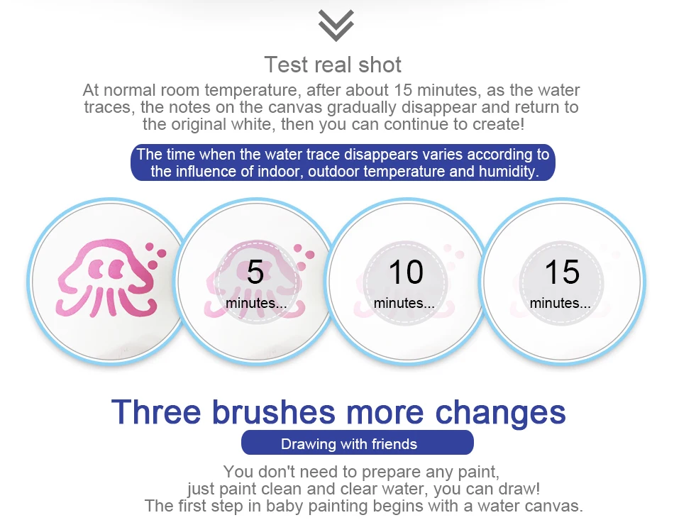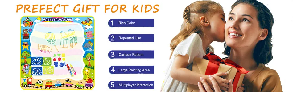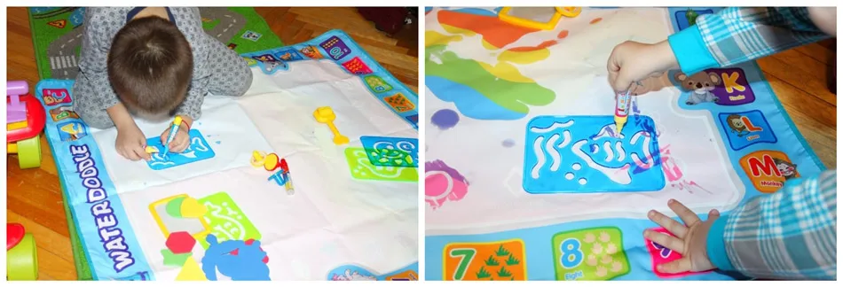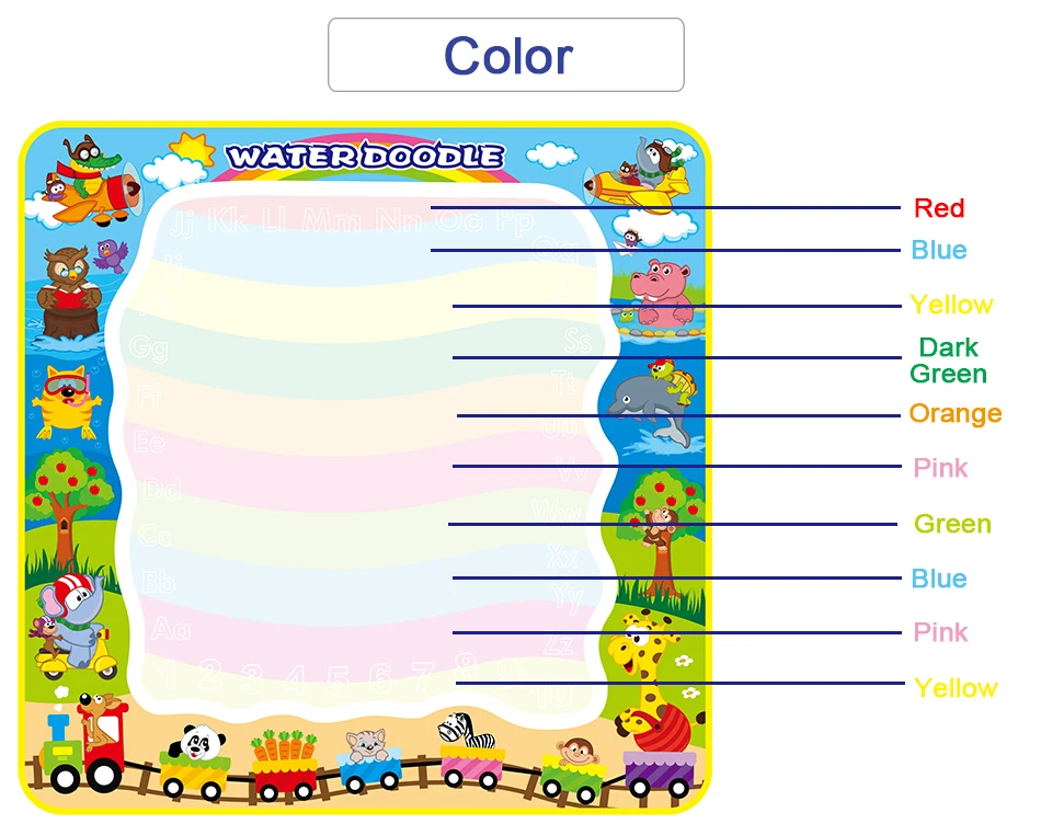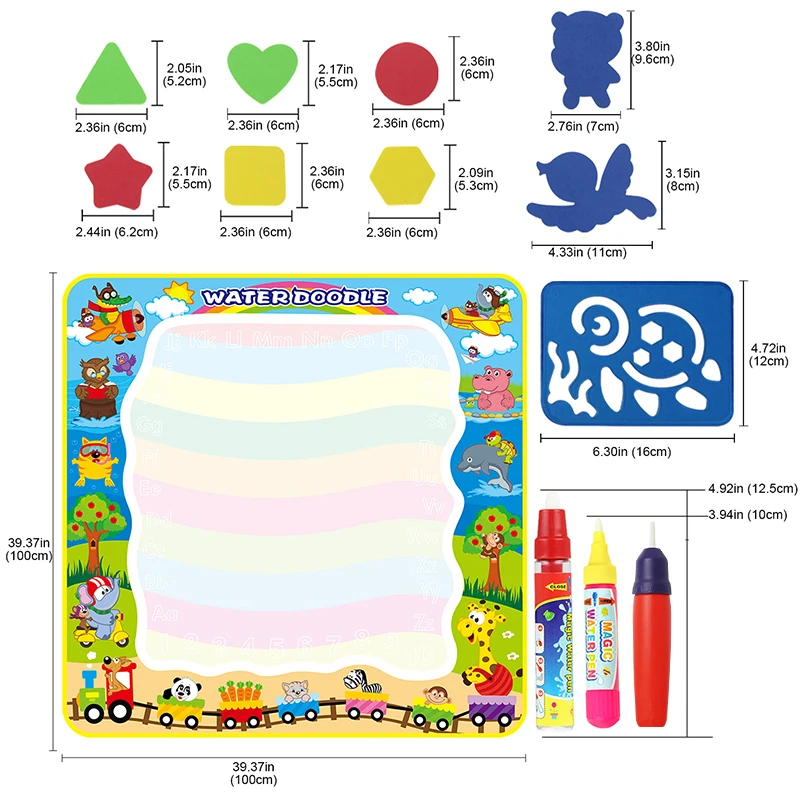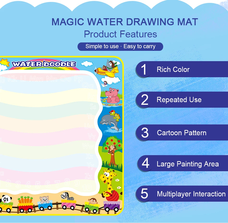 Характеристика:Материал: экологически чистый, высококачественный, водонепроницаемый, без чернил, без химических веществ.Функция: образовательная, пригодная для повторного использования.Просто нужно заполнить водой, чтобы рисовать, и он исчезнет после нескольких minitus, дети могут каракули его снова и снова, родители больше не волнуйтесь беспорядок.Материал: тканьРазмер: 100x100 см
