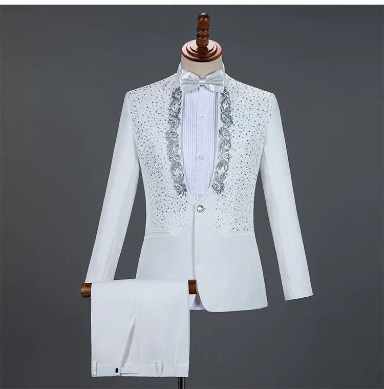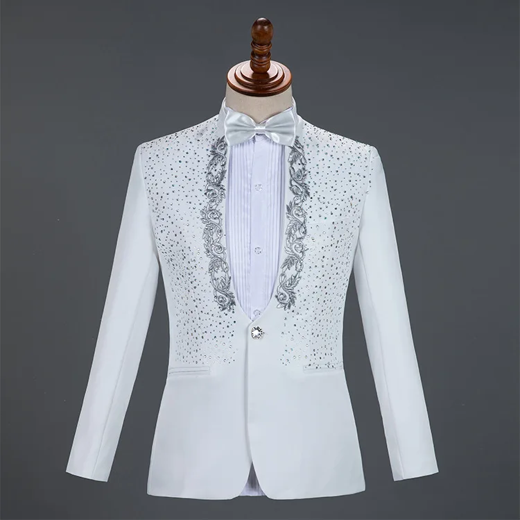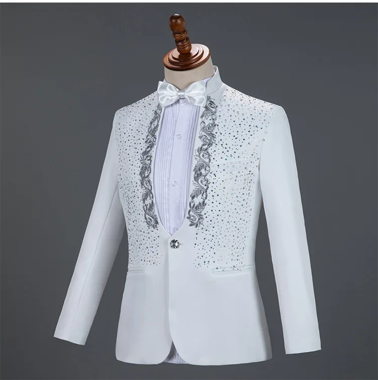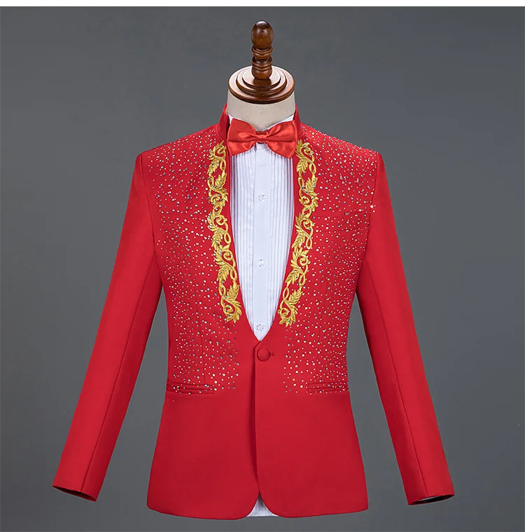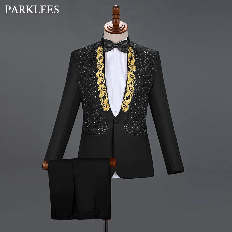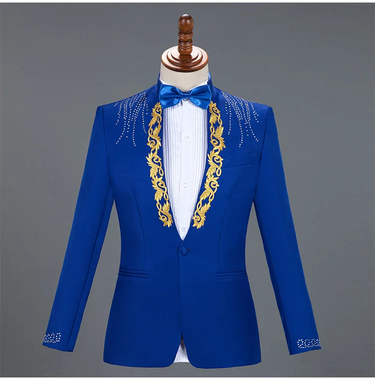 Мужской костюм с золотой вышивкой, свадебный костюм со стразами и воротником-стойкой, смокинг для жениха, сценический костюм для певицы