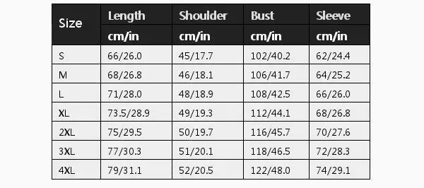 Таблица размеров Размер::S Длина (см/дюйм)::66/26 Плечо (см/дюйм)::45/17.7 Бюст (см/дюйм)::102/40.2 Рукав (см/дюйм)::62/24.4 Размер::М Длина (см/дюйм)::68/26.8 Плечо (см/дюйм)::46/18.1 Бюст (см/дюйм)::106/41.7 Рукав (см/дюйм)::64/25.2 Размер::L Длина (см/дюйм)::71/28 Плечо (см/дюйм)::48/18.9 Бюст (см/дюйм)::108/42.5 Рукав (см/дюйм)::66/26 Размер::XL Длина (см/дюйм)::73,5/28,9 Плечо (см/дюйм)::49/19.3 Бюст (см/дюйм)::112/44.1 Рукав (см/дюйм)::68/26.8 Размер::2XL Длина (см/дюйм)::75/29.5 Плечо (см/дюйм)::50/19.7 Бюст (см/дюйм)::116/45.7 Рукав (см/дюйм)::70/27.6 Размер::3XL Длина (см/дюйм)::77/30.3 Плечо (см/дюйм)::51/20.1 Бюст (см/дюйм)::118/46.5 Рукав (см/дюйм)::72/28.3 Размер::4XL Длина (см/дюйм)::79/31.1 Плечо (см/дюйм)::52/20.5 Бюст (см/дюйм)::122/48 Рукав (см/дюйм)::74/29.1