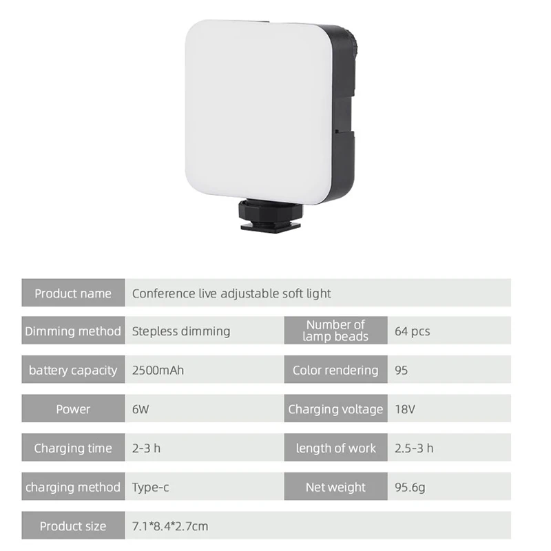 Метод затемнения: плавное затемнениеКоличество лампочек: 64Емкость аккумулятора: 2500 мАчИндекс цветопередачи: 95Мощность: 6 ВтНапряжение зарядки: 18 вВремя зарядки: 2-3 чРабочее время: 2,5-3 чМетод зарядки: Зарядка типа c