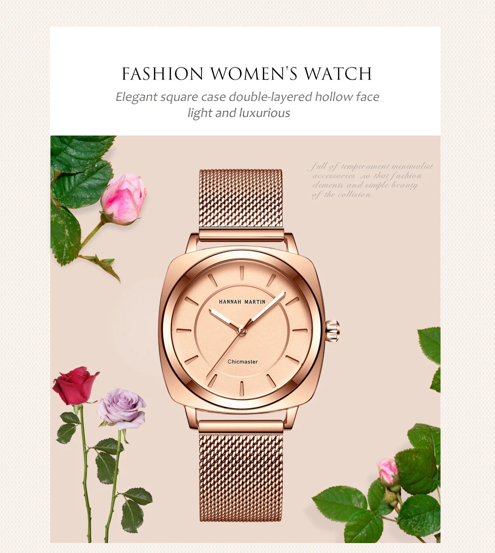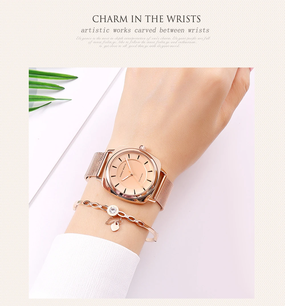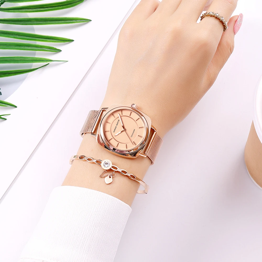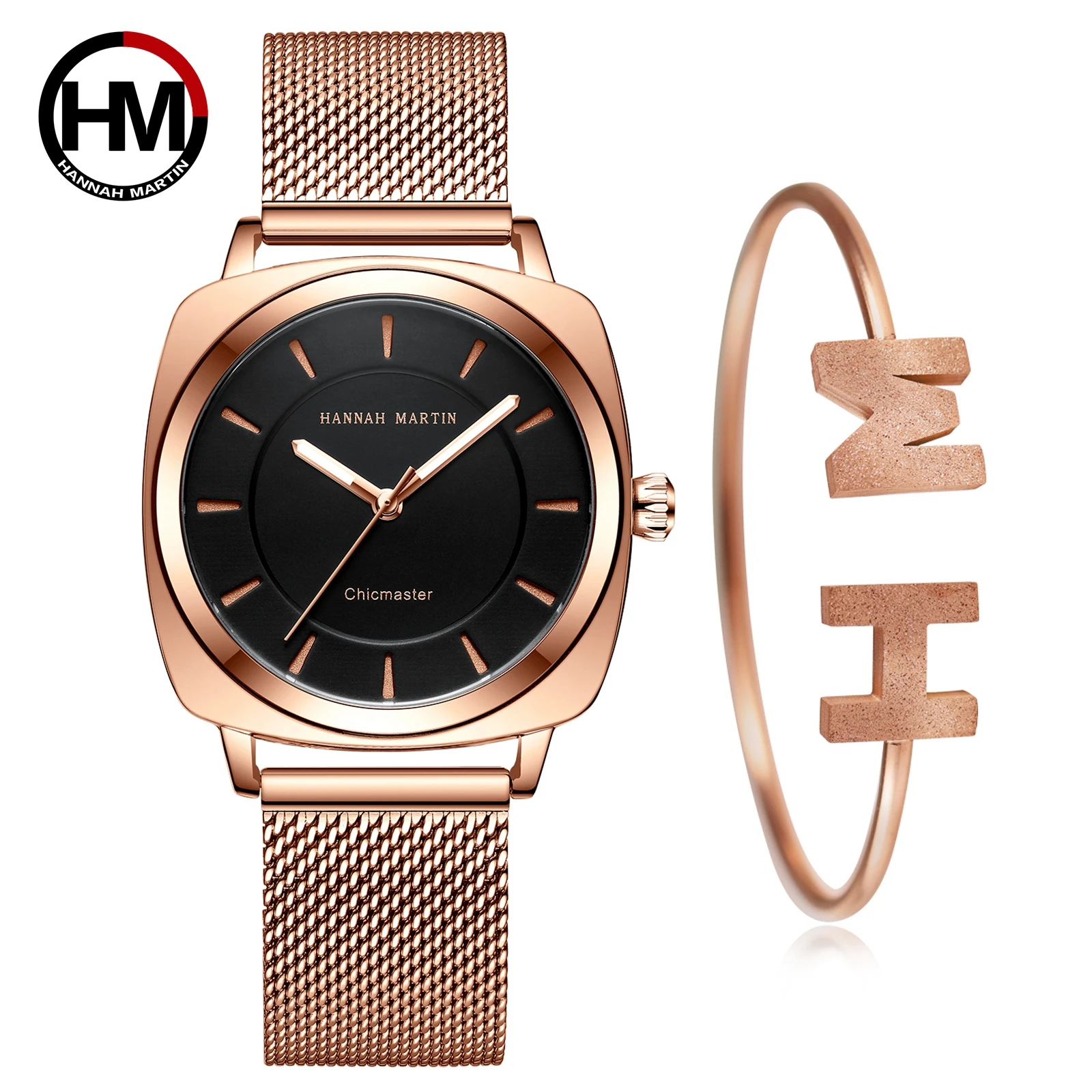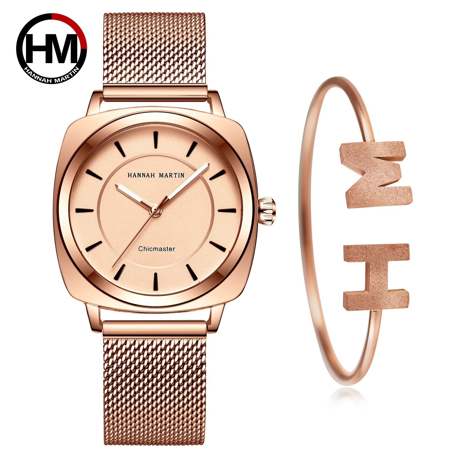 Дропшиппинг Япония кварц Мода креативный квадратный дизайн водонепроницаемый розовое золото Нержавеющая сталь сетка 1 комплект браслет женские часы