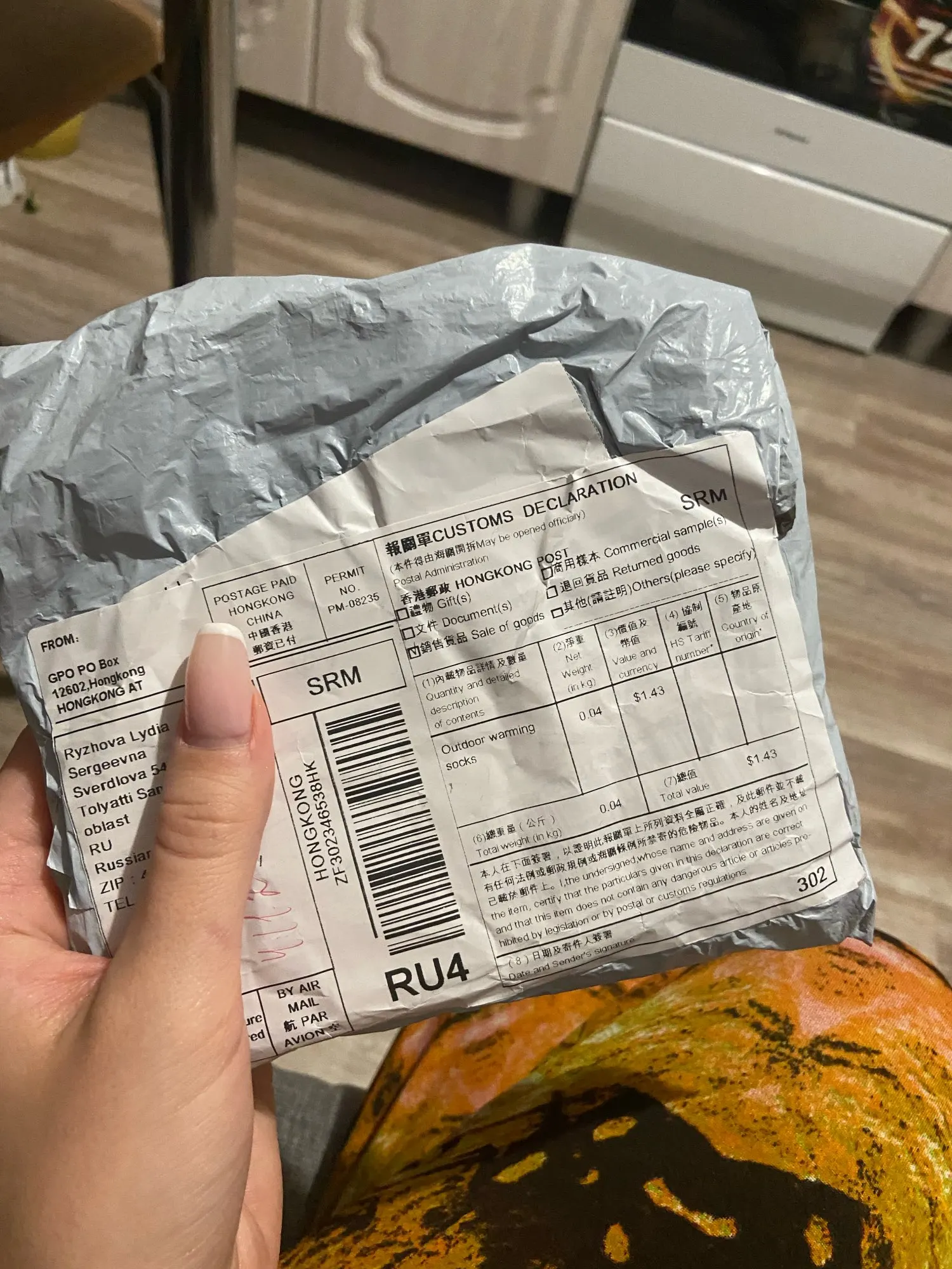 Заказ пришел в Казань за три недели. Носки тонкие, на ступне имеются волокна серебристого цвета. На мой 43 размер налез впритирку. Пока не испытывал в деле.