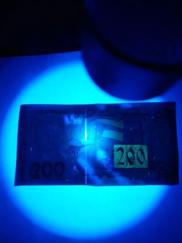 Фонарик работает, деньги засвечивает , но думал что будет светить сильнее. На фонаре стоит черный фильтр который задерживает частично видимый спектр от чего кажется что фонарь почти не светит, но УФ лучи хорошо подсвечивают предметы. Из за небольшого диаметра отражателя луч фонаря не такой рассеянный а более сконцентрированный в одно пятно. В основном фонарь не плохой.