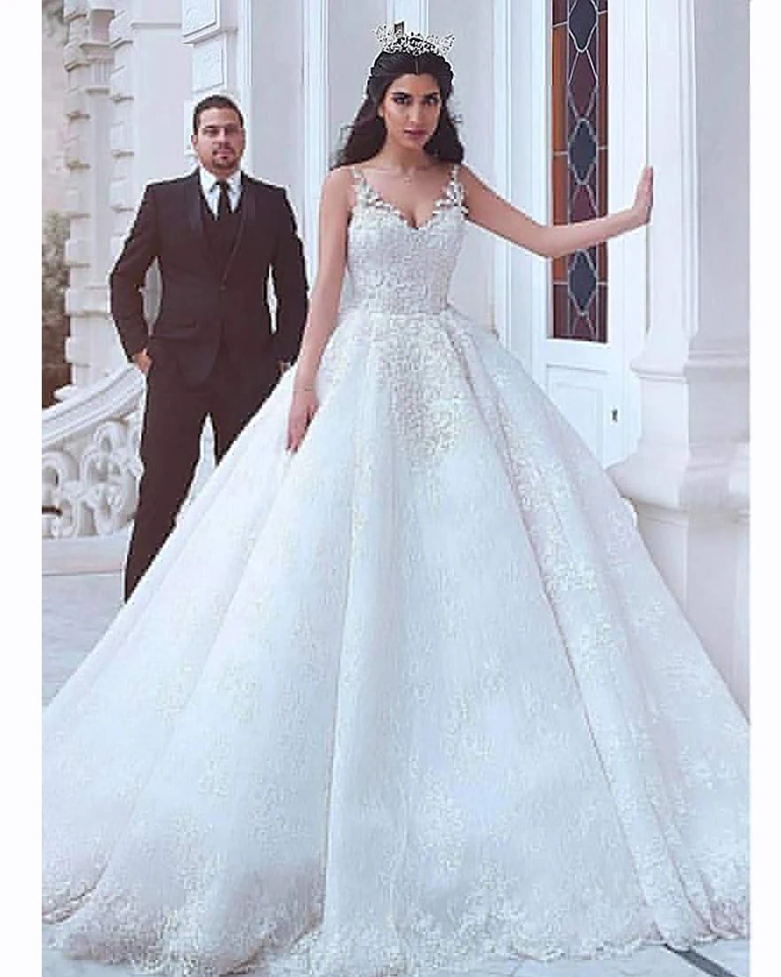 Женское свадебное платье It's yiiya, белое фатиновое платье на тонких бретельках с V-образным вырезом и аппликацией на лето 2019