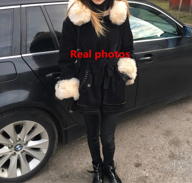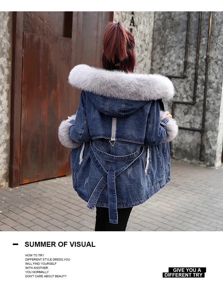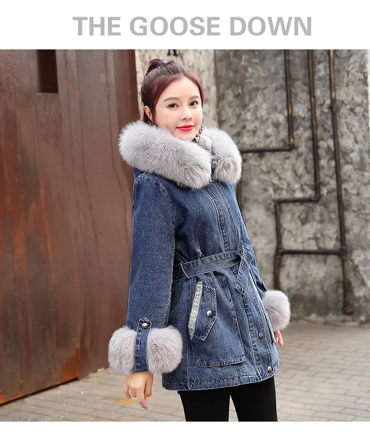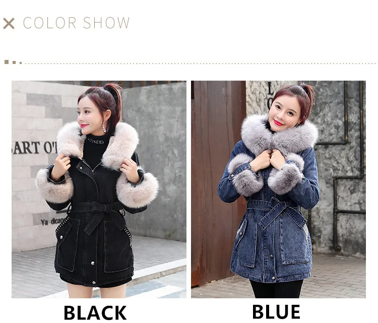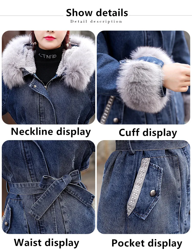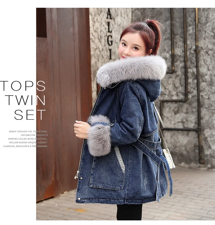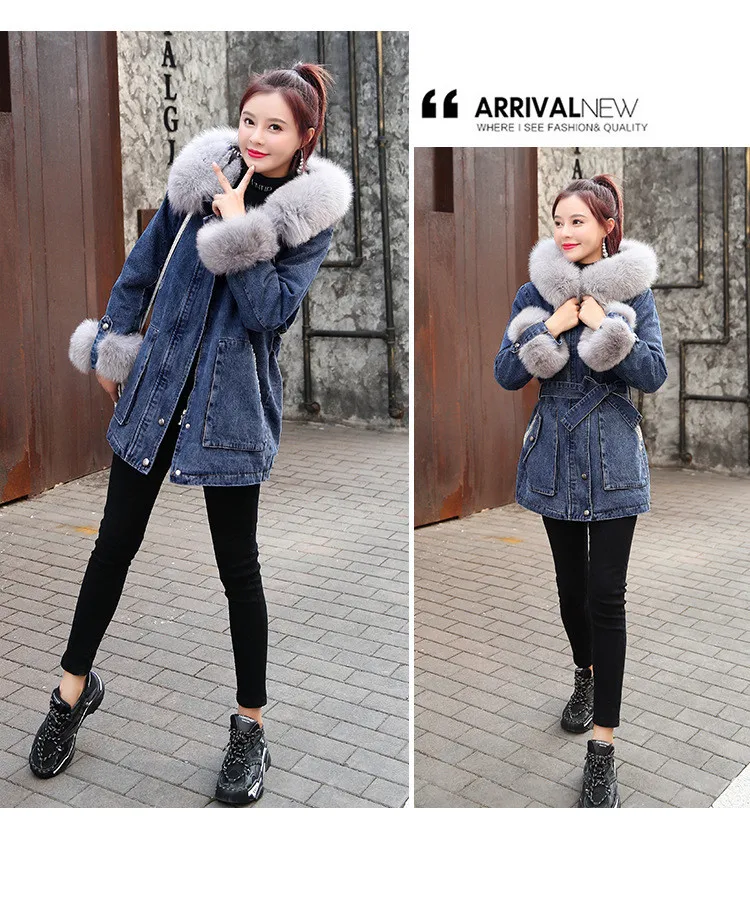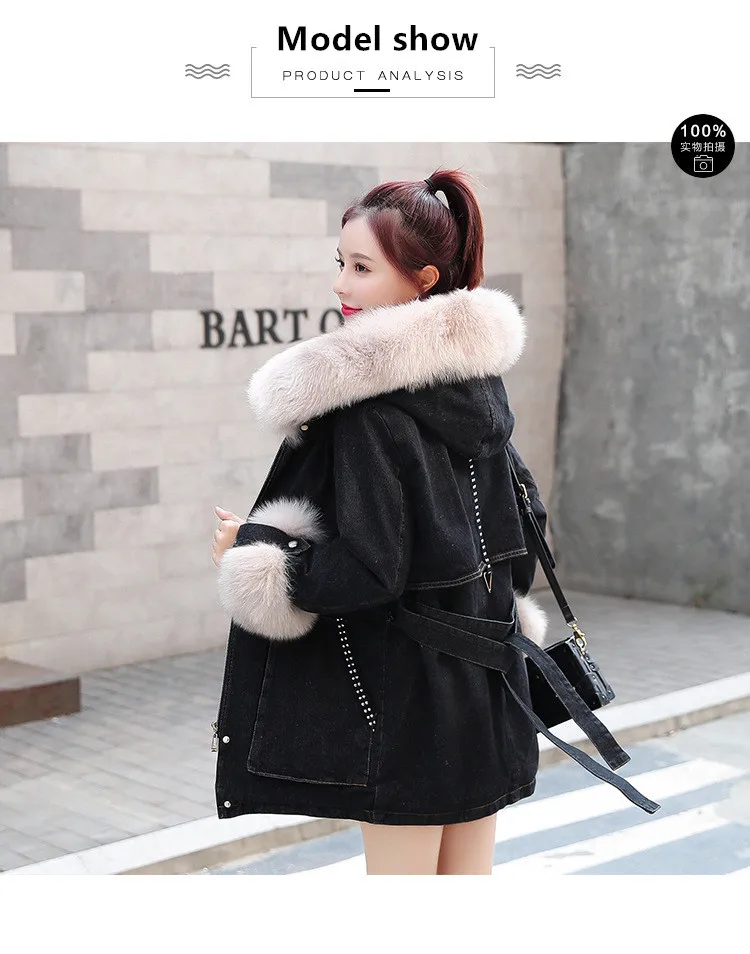 Новая зимняя черная джинсовая куртка оверсайз высокого качества с кроличьим меховым воротником, Лоскутная джинсовая Утепленная зимняя куртка для женщин из денима