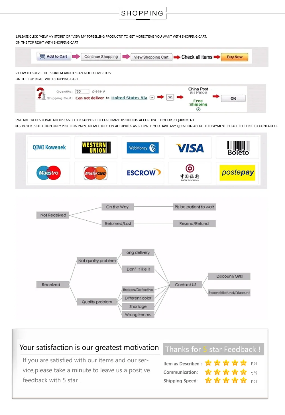 1. Если вы удовлетворены товарами, пожалуйста, дайте нам 5 звезд на всех деталях рейтинга продавца и положительные отзывы; Для наших старых клиентов, мы хотели бы предоставить специальную скидку на следующий заказ.