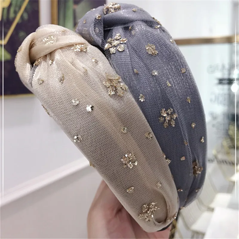 Китайские богемные золотистые блестящие ободки для волос, элегантные блестящие повязки на голову из органзы для девочек, Женская Повседневная широкая повязка на голову, аксессуары для волос